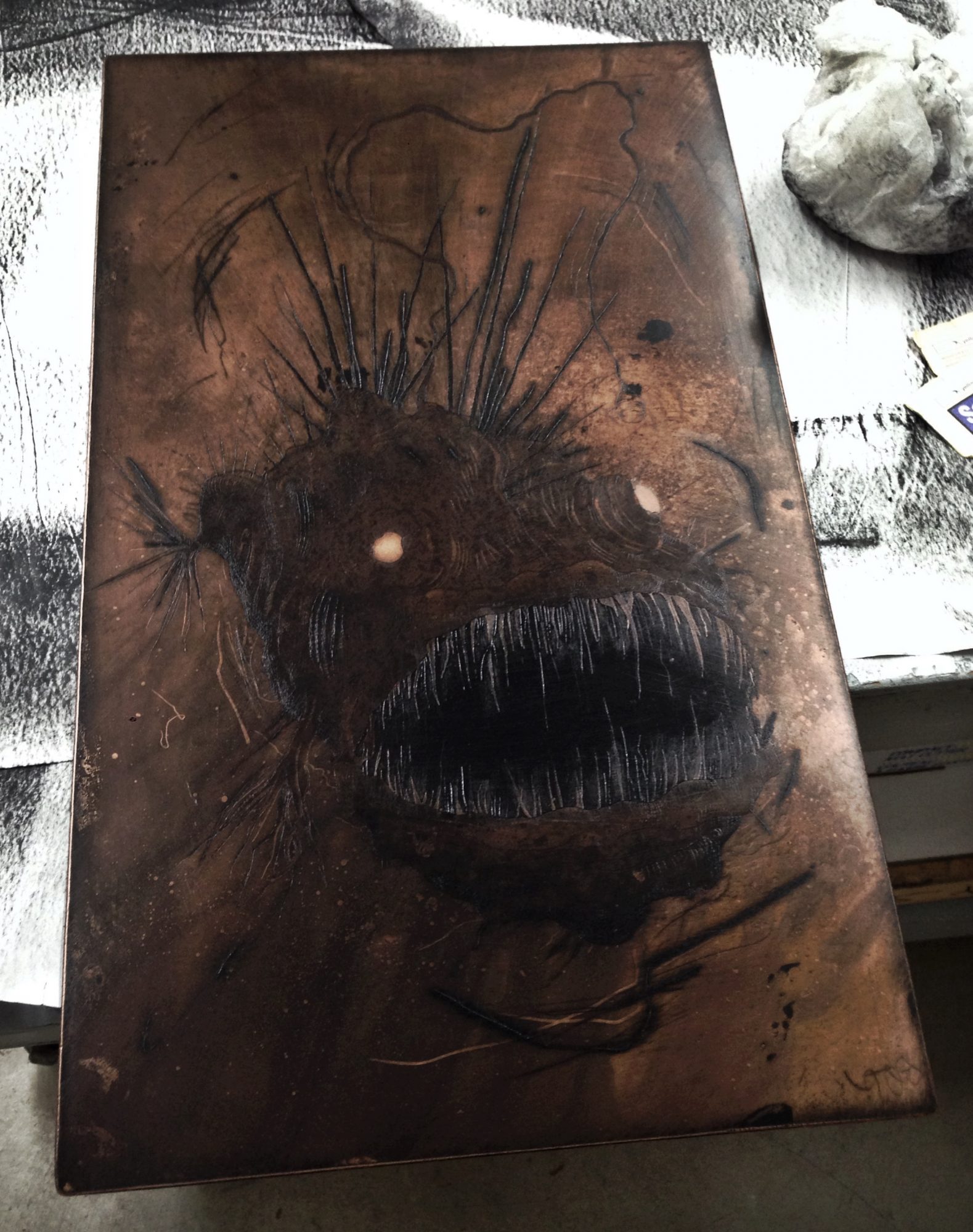 When I was a kid was constantly making art. I drew amateur pictures of the birds I saw flying overhead or clustered in trees. I routinely documented the mysterious creatures I met in my dreams. I would hang bits of broken blue glass from the ceiling above my bed in an attempted to create the feeling of sunlight reflecting off the surface of a lake. It wasn’t until I attended collage that I considered Fine Art as a career and adult lifestyle. I realized I couldn’t leave my crafting delights to drift away with my childhood the moment I pulled my first Intaglio print. I was infatuated with the rich contrast, intensely intricate detail, and unique embossment that Intaglio Copper Etching offered. I immediately abandoned my plans of a Bachelor of Science, buckled down at my restaurant job, pinched my pennies to afford copper plates, and dove head first into my artwork. 10 years later, I still get just as excited when I pull a finished print. I still shrug off questions about my ink stained hands with a smirk.