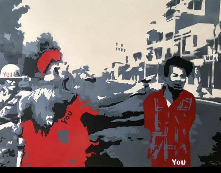 My artwork is collection of sarcasms and hypocrisies. I get my inspiration from the seedy underbellies of society. Most of my work is a combo of spray paint and acrylic. I try and make the simple pieces with a very powerful message. When people look at my art I would say they have mostly 2 reactions, either laugh or cringe. I hope my art serves as a display of the lenses that I get to look through causing people to rethink how the look at the world. At times I have received much praise and at others, several death threats. If everyone loves it, it’s not art.