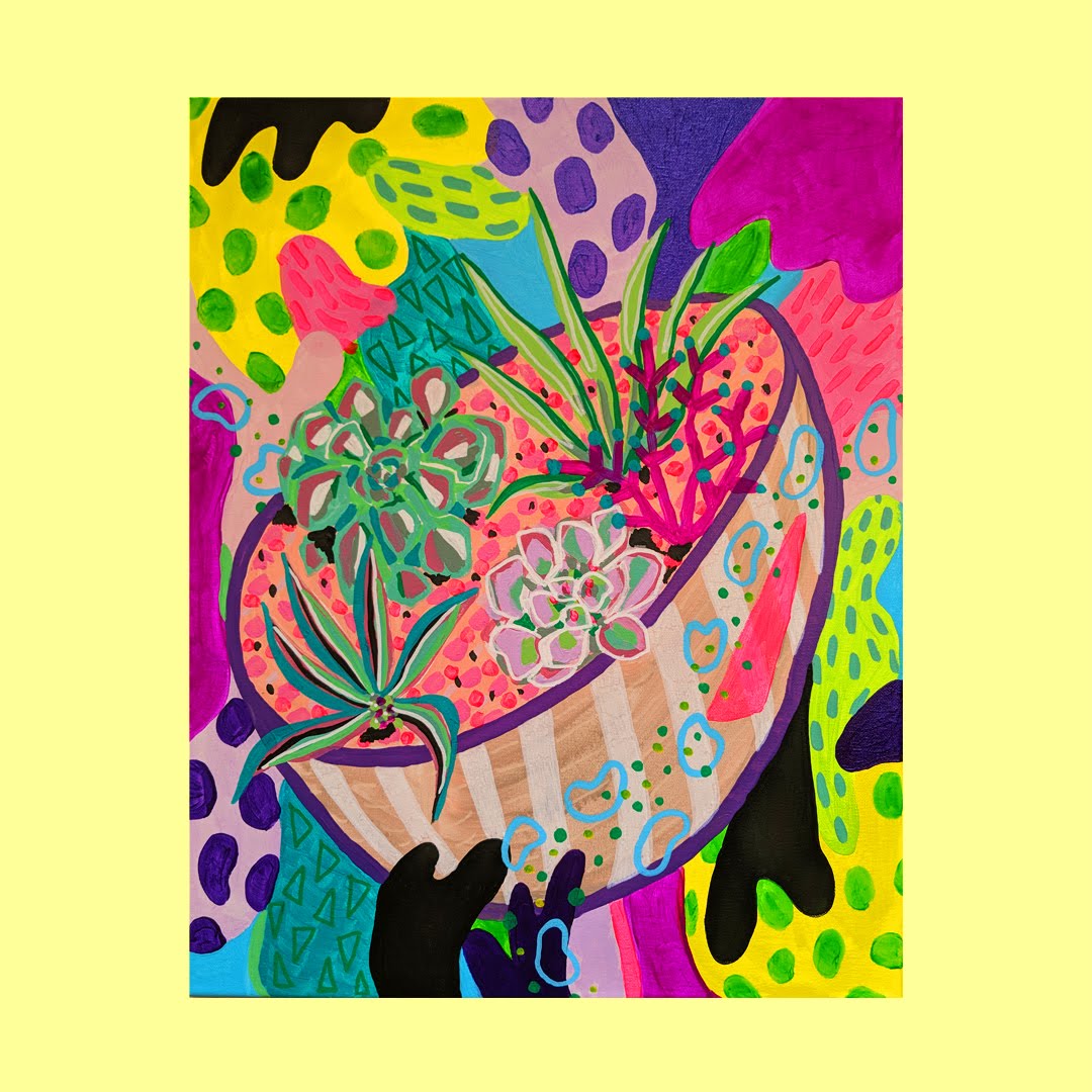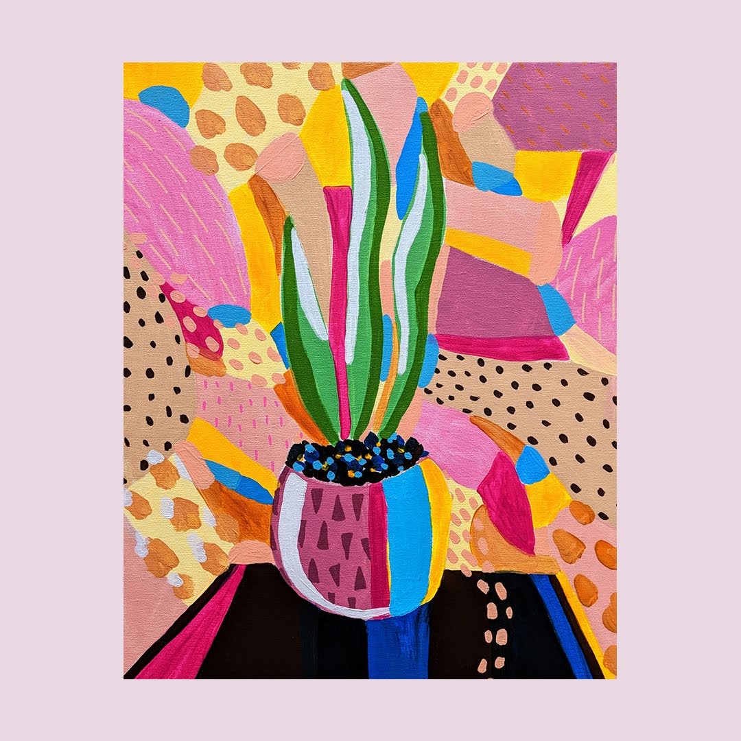 I’ve dabbled in a bit of everything but most often I paint in acrylics on canvas. I love color and it’s the basis of every piece I create. I begin by creating a color story, usually with a series of swatches that I paint in a sketchbook. Then, I translate that color scheme to a painting. I love painting plants, both desert dwellers (like cacti) to indoor houseplants. I give all my plant paintings names and usually an accompanying story of their “life.” I’m a quirky person and this is one of the ways I express that.