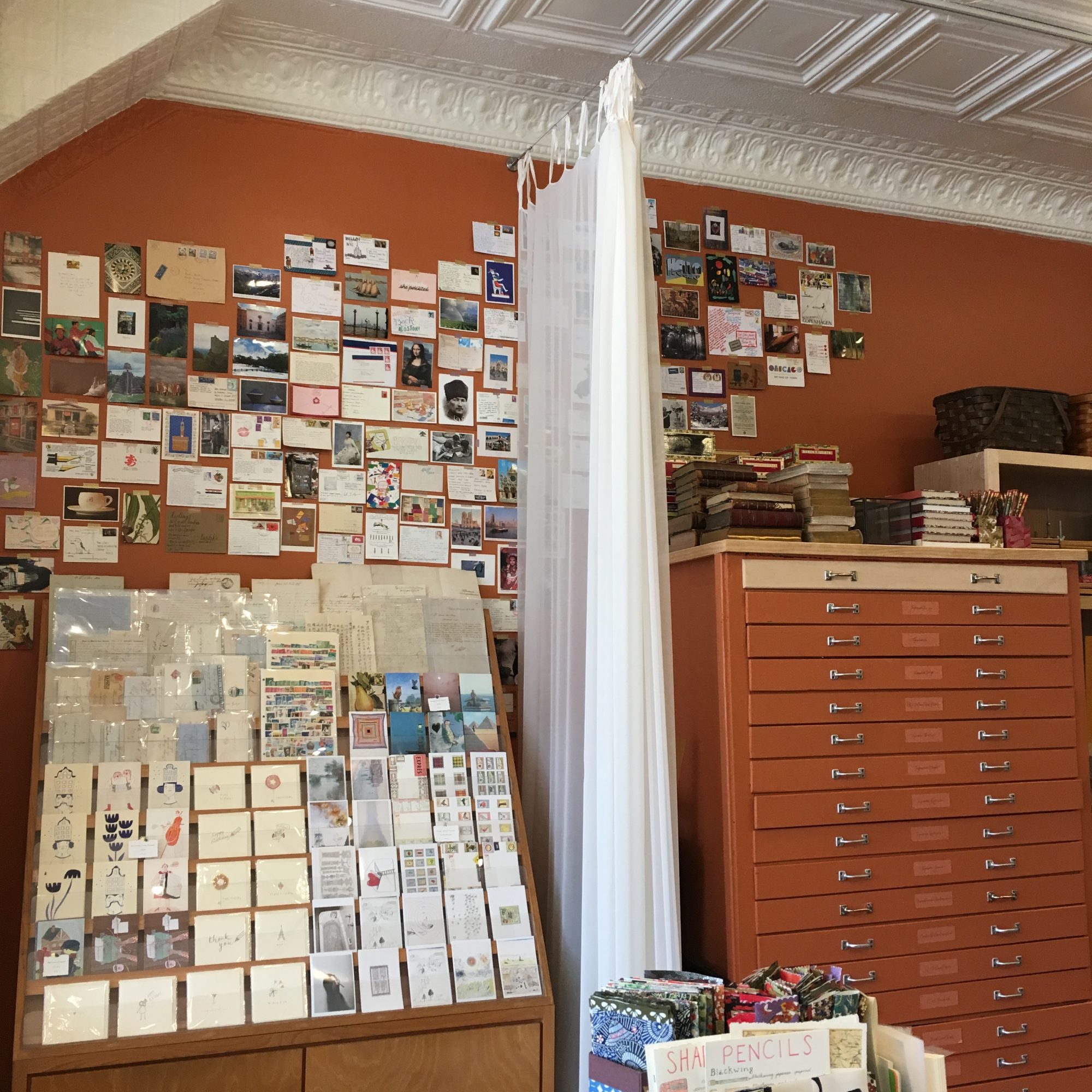 Absolutely I do. In fact, I belong to a huge online community — 750,000 people — of postcard senders! It’s all managed online, assigning the next correspondent to whom you’re sending a card, who is NOT the person who will then be assigned to send you a card. The cards I’ve received are amazing, from all over the world, and I’ve begun adding them on my postcard wall in the shop, which includes cards I’ve received over the past three decades. I sell postcards, of course, as well as stationery and vintage European envelopes. Chicago also happens to be the headquarters of the Letter Writers’ Alliance.
