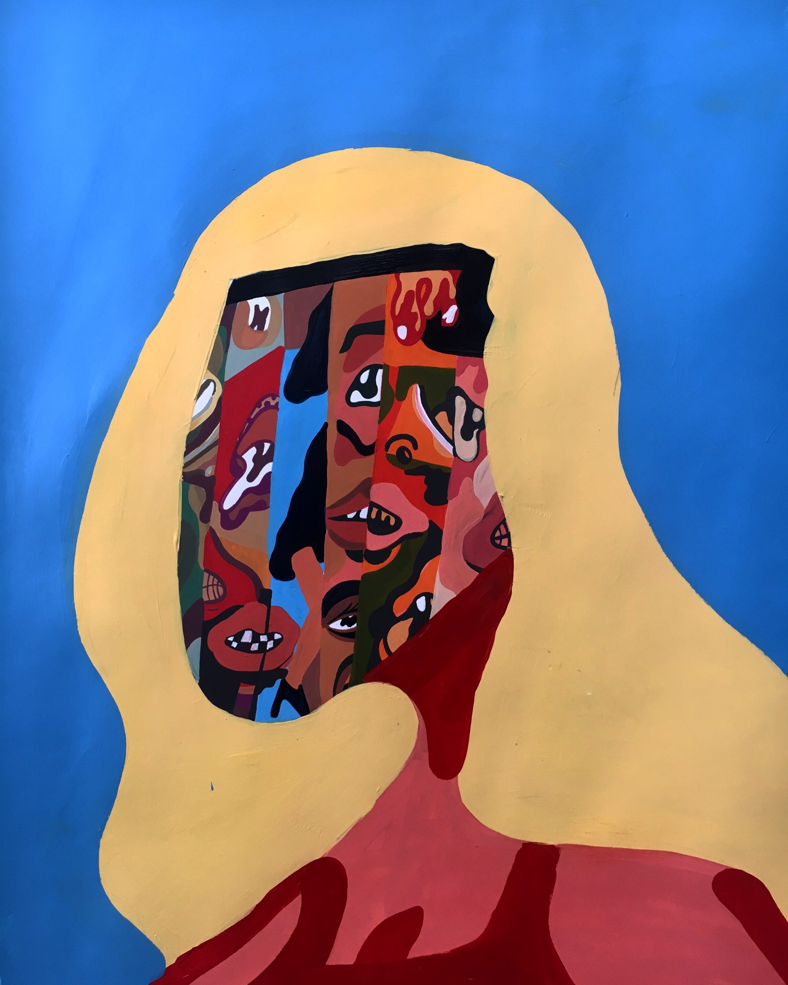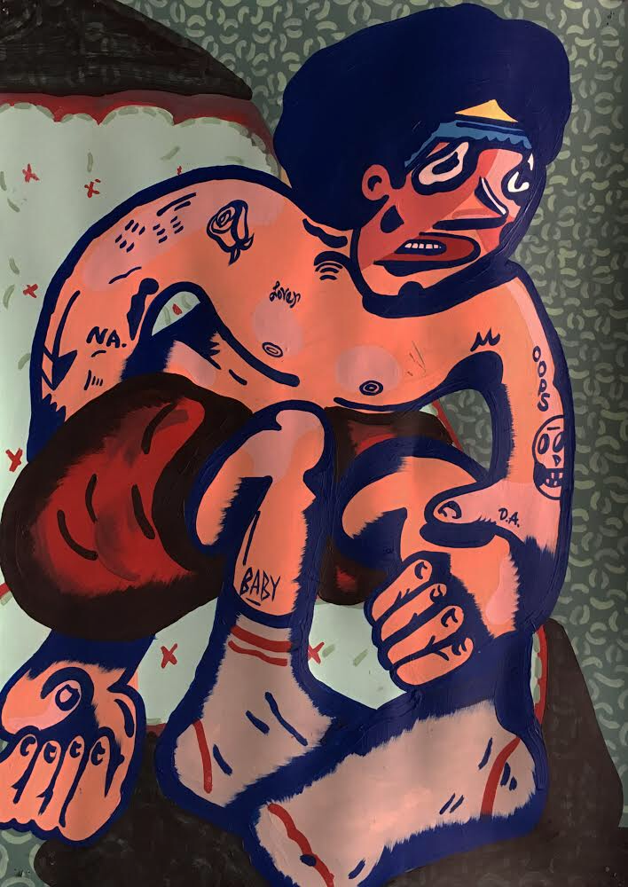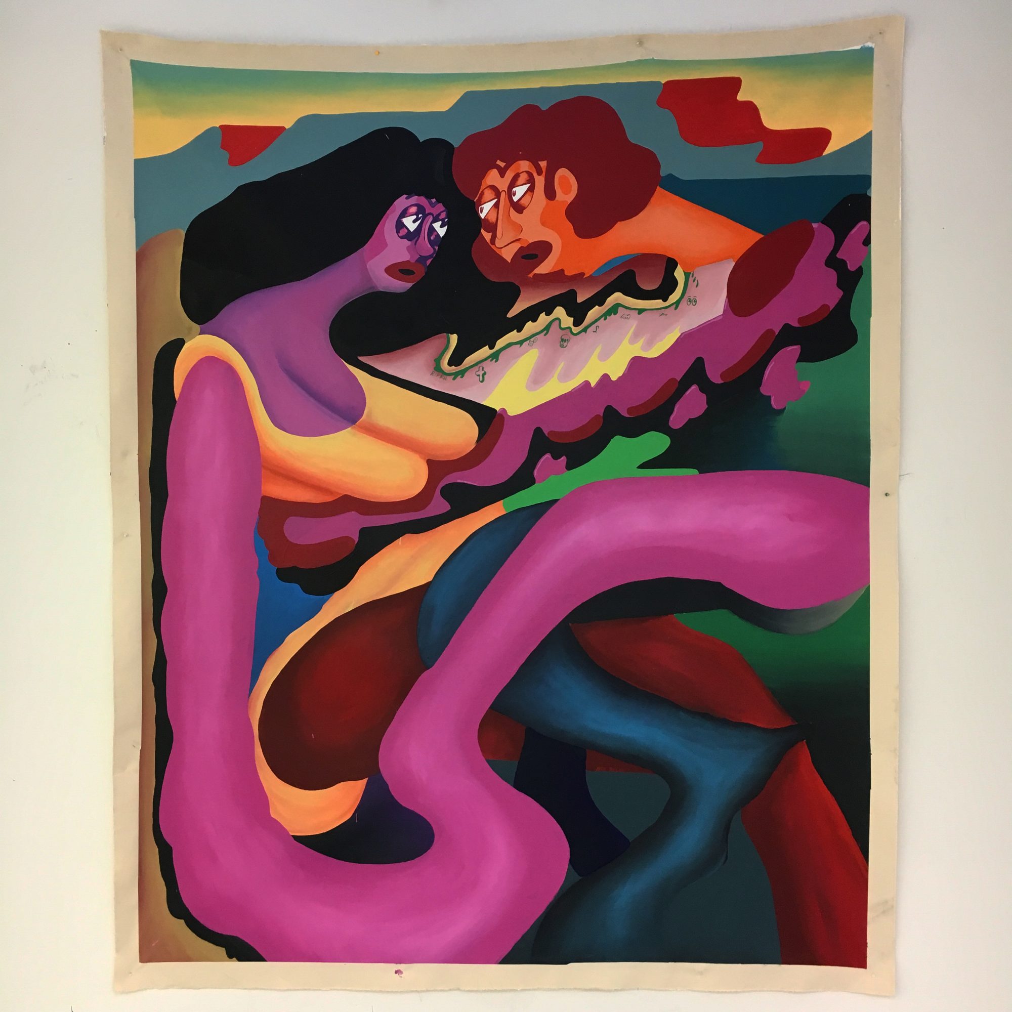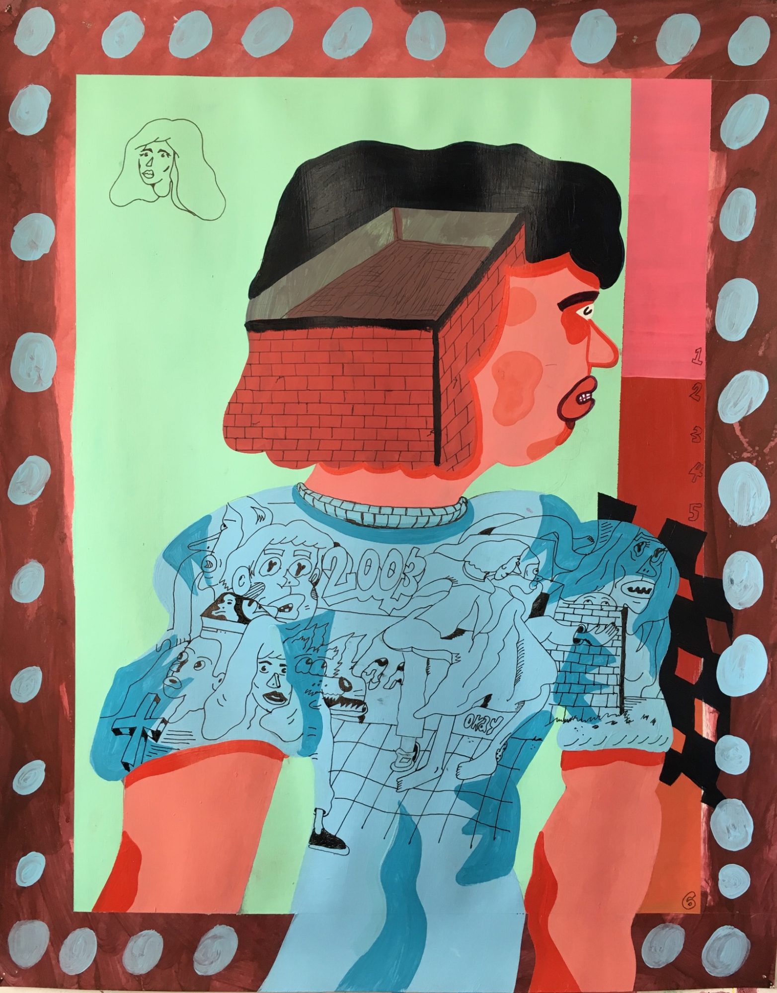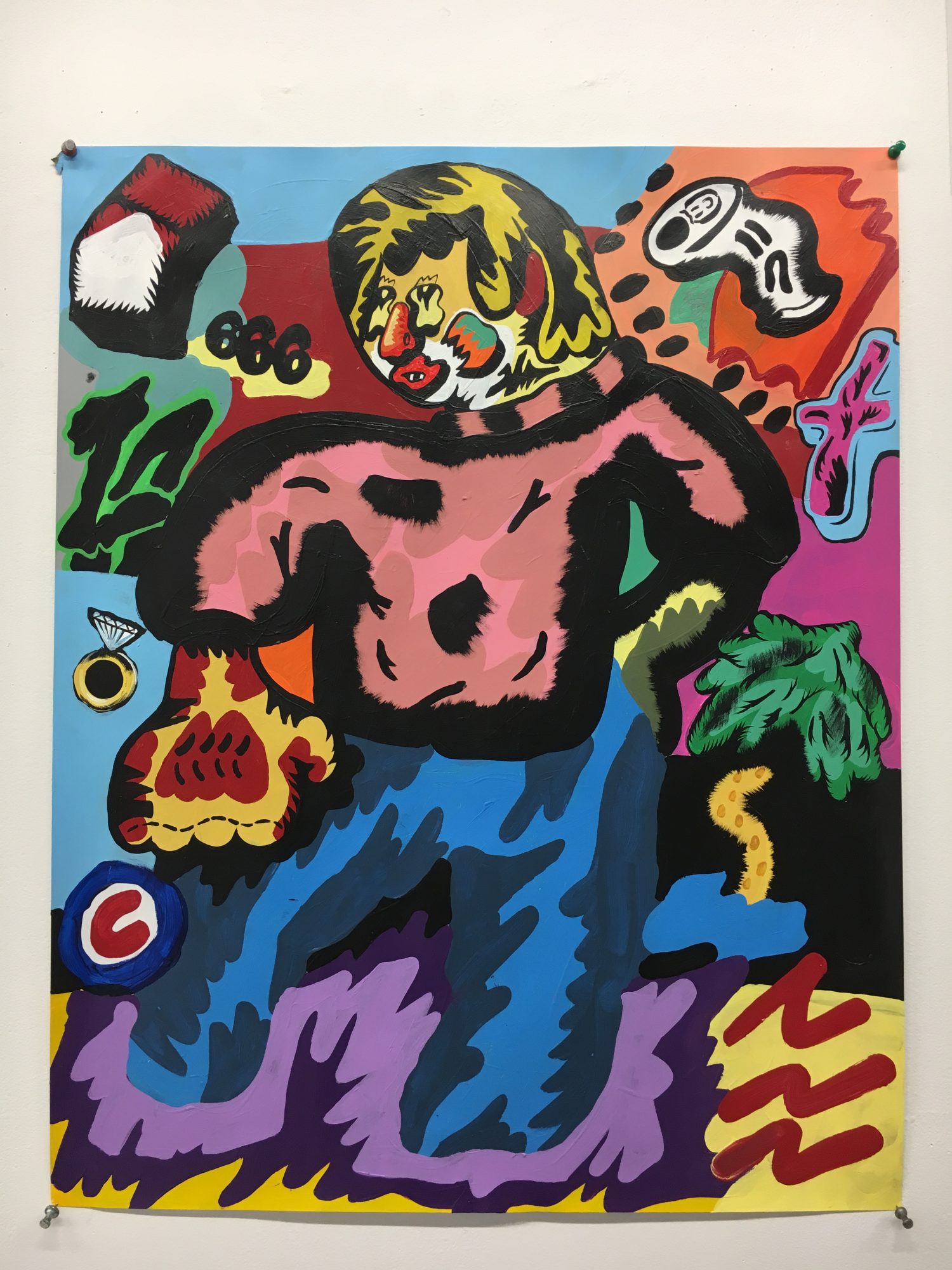 I’ve been focused primarily on acrylic/water-soluble paint on paper and am driven by a graphic language that’s spawned from cartoons and commercial imagery and some branches of art history. I’m a painting nerd and that flourished at SAIC, but my work is introverted and relational in terms of my experience in alignment with the audiences I sit with. An eclectic, de-gendered, de-raced figure often sits in for a mouthful of interactions or people or places. The abject is a big theme for me but self-love is cool too. Lots of tubs and bathrooms recently?