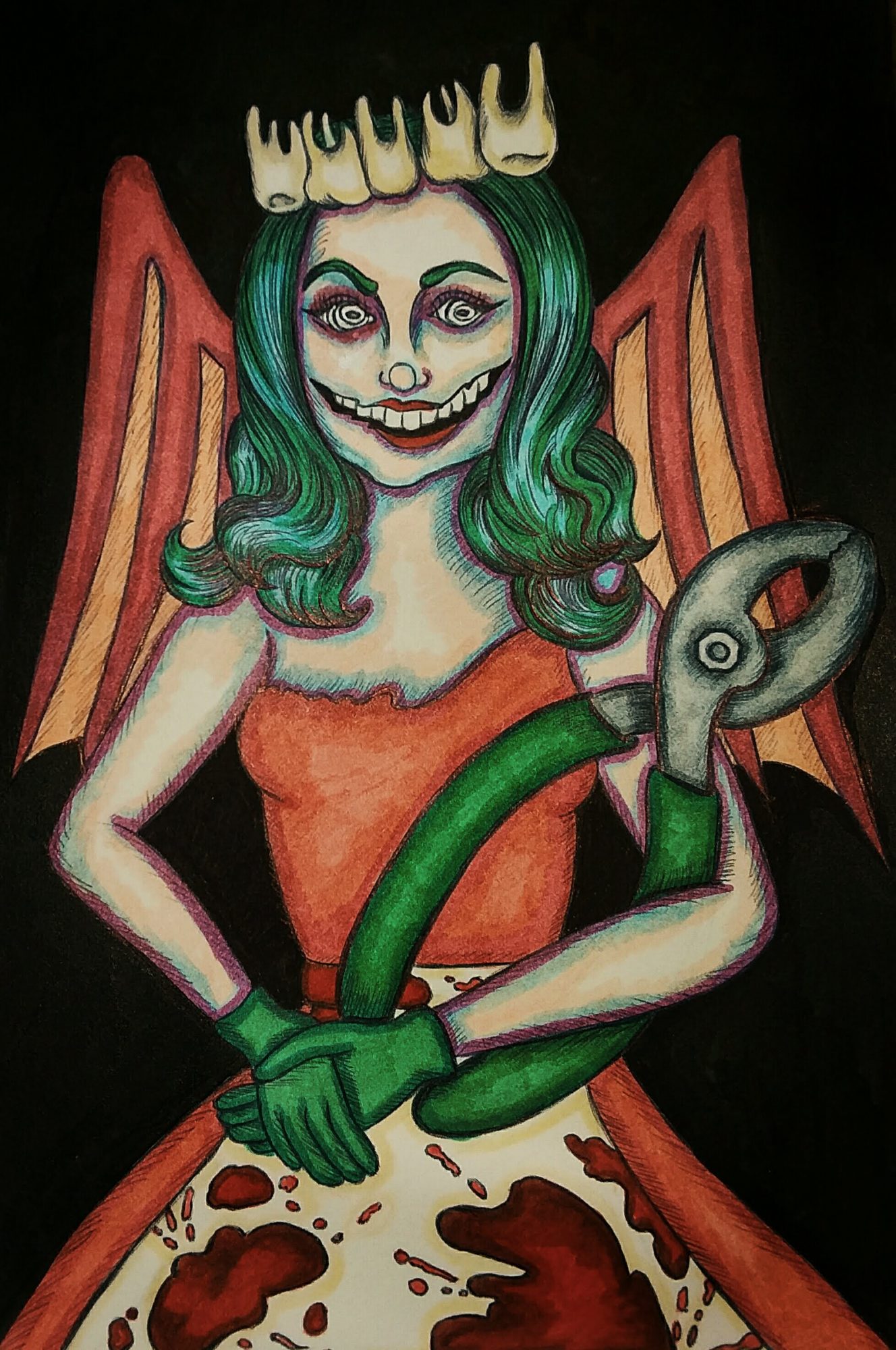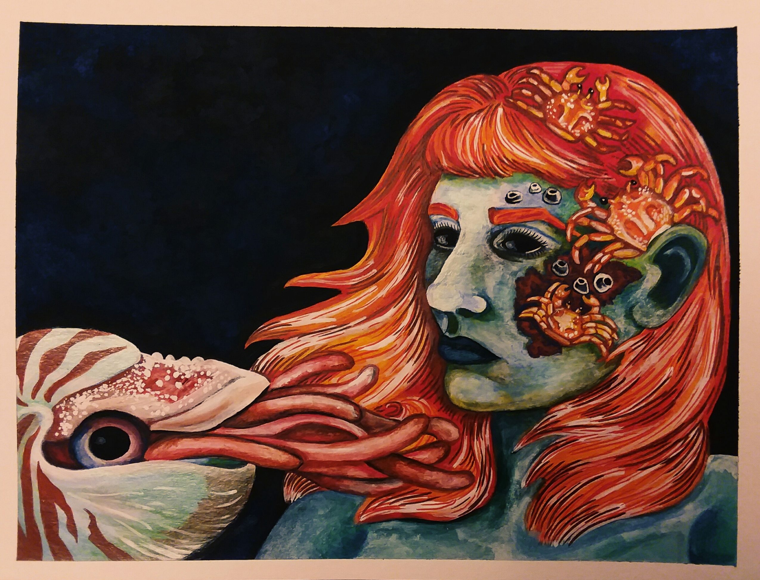 I create mixed media illustrations. Usually I will draw out my picture in pencil, go over the draw indrawing and add value with a ballpoint pen, and then add color. Sometimes I layer different materials to create new surfaces, too. At two years old, I made my mom a drawing of a turtle from two perspectives and have never stopped creating since. My biggest hope is simple, I suppose; I want people to feel something when they see my work that kick starts their imagination. For years, teachers have been telling me my artwork is “too weird,” and I want people to know that it’s okay to break out of the more classical constraints often placed on art students.