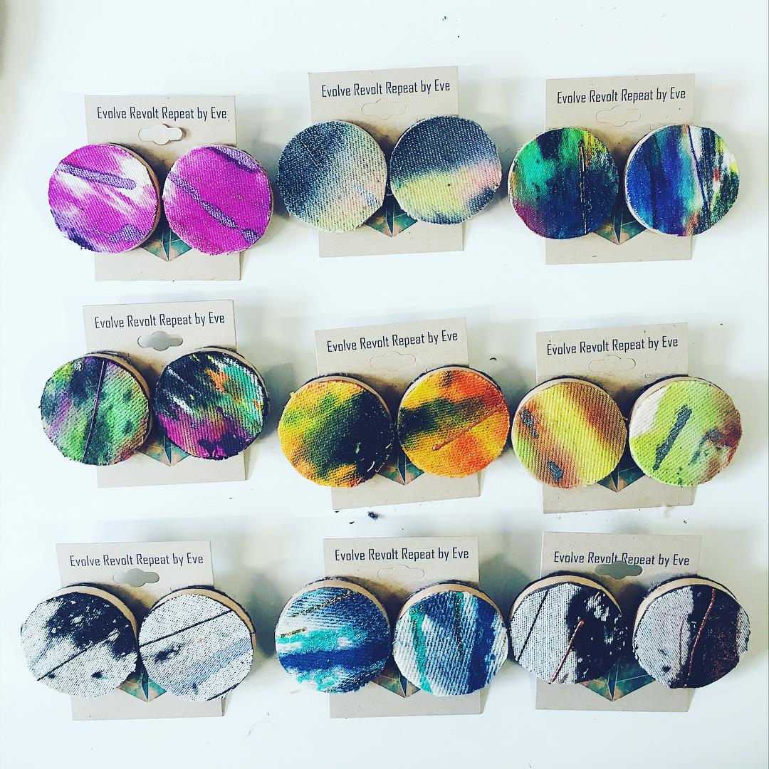 I work mostly now is jewelry design. I create earring using “upcycled” materials like denim, wood, plastic and leather. My process came out of my teaching practice, an actual activity with high school students and my growing need with limited budgets to make magic out of hardly anything. The process of dying my fabrics speaks really heavily to my love of abstract painters like Alber Oehlen and Joan Mitchell. The message for me in jewelry design the way I do it is in the appreciation and acknowledgement for the story. The opportunity for 2nd, 3rd and 4th chances and the space to reinvent ourselves repeatedly. The line is called Evolve Revolt Repeat.