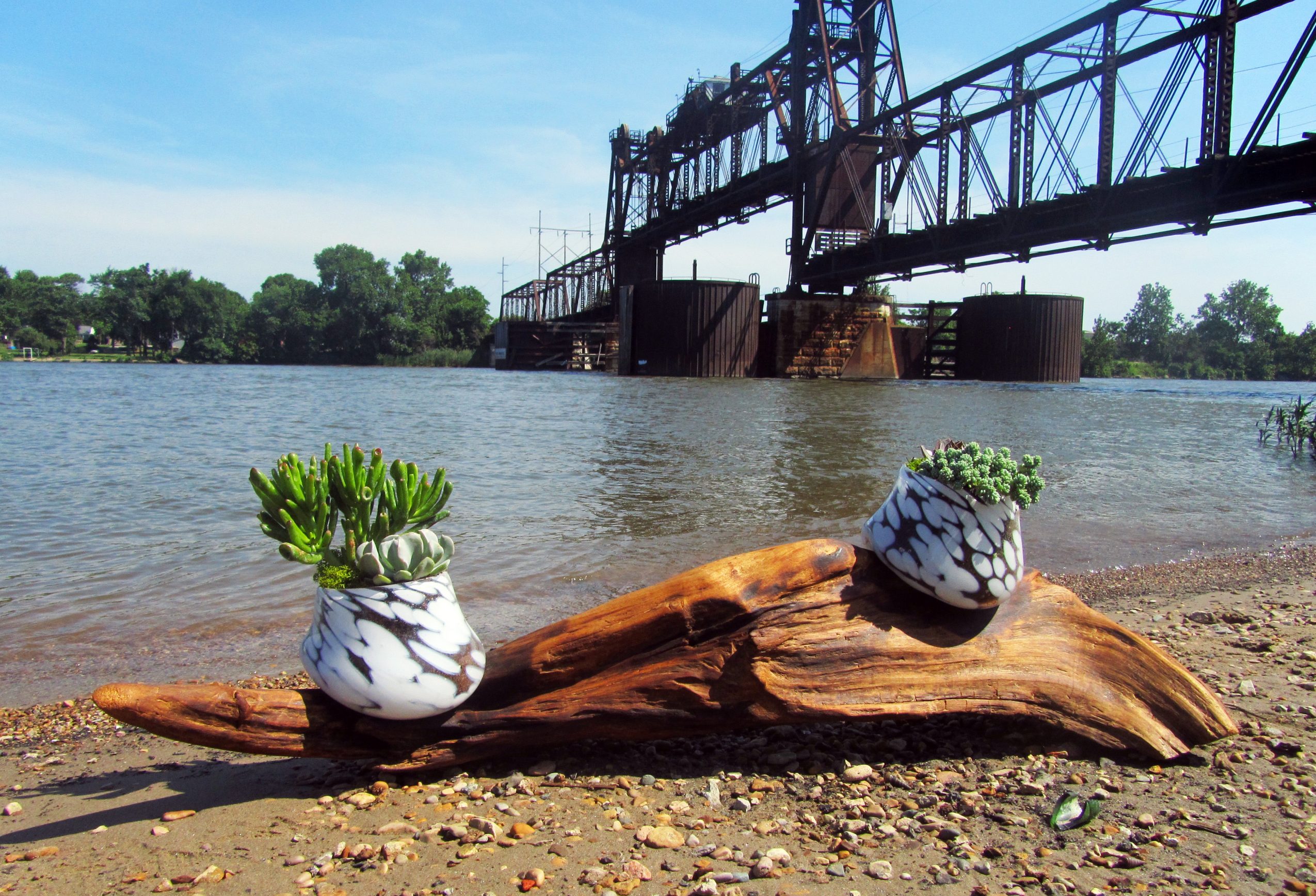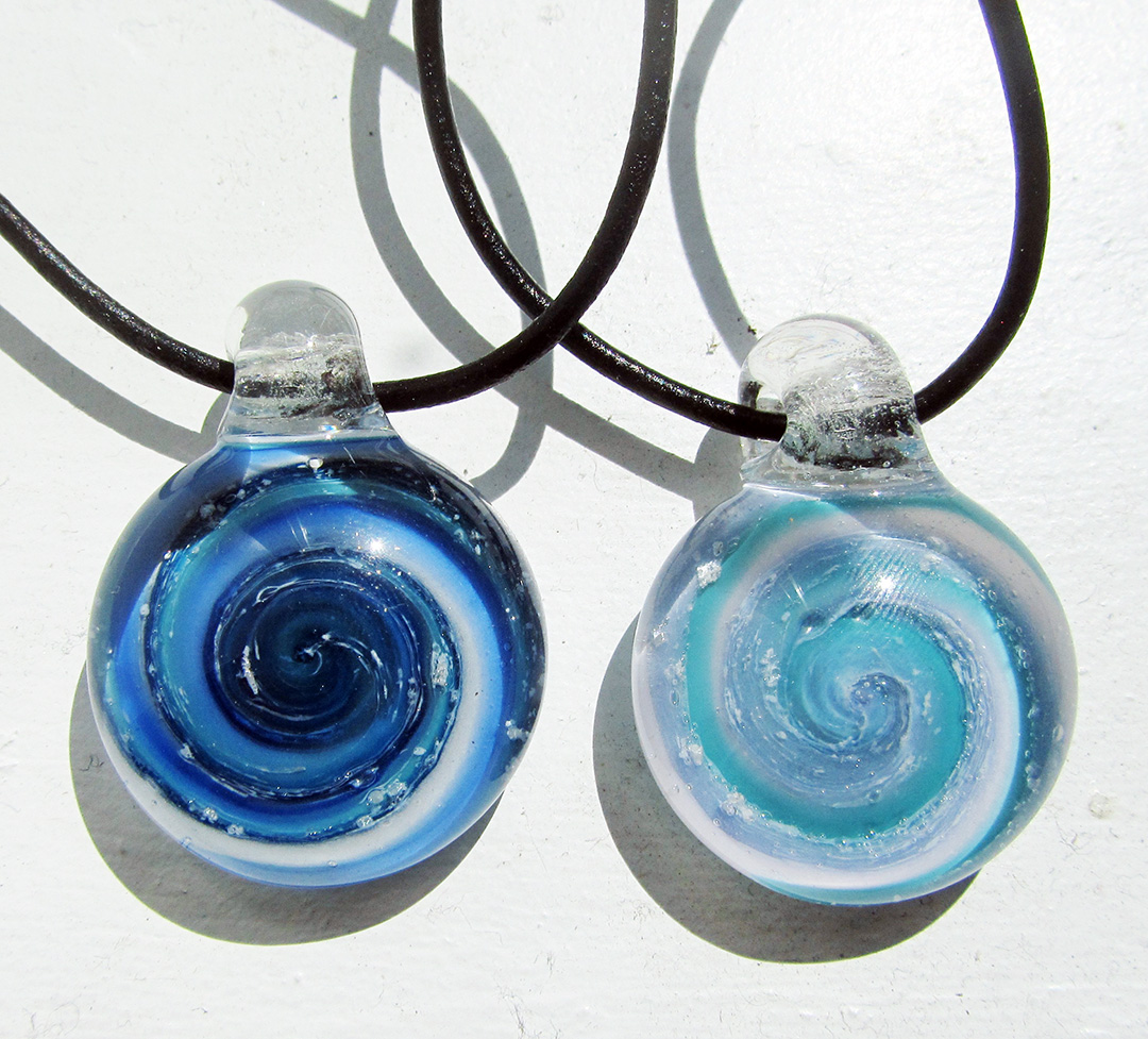 I make hand blown glass art including vases, lighting, holiday items, jewelry, etc… Every piece is one-of-a-kind as no two pieces are ever the same. Working with molten glass is a completely unique experience because there is nothing else like it. The glass starts at 2100 degrees and is hand blown and shaped into anything I desire. Because the glass is liquid its constantly in motion on the end of my steel pipes and has to be continually rotated to keep it on center. Glassblowing is very physically demanding and requires a lot skill and strength which is why it takes so many years to master. But the possibilities are endless and that’s one of the things I love most about glass. I draw a lot of my inspiration from nature. I am an avid hiker at the 3 state parks we have here in Starved Rock country and it really inspires my shape and color choices. I have recently been working a lot with mixed media and trying to incorporate other materials in with glass such as driftwood or copper. Another one of my specialties is Cremation Glass, where I fuse the crematory ashes of your loved ones into a memorial keepsake. This is the biggest part of my business and keeps me extremely busy. It is also very gratifying to help people heal during their most difficult times.