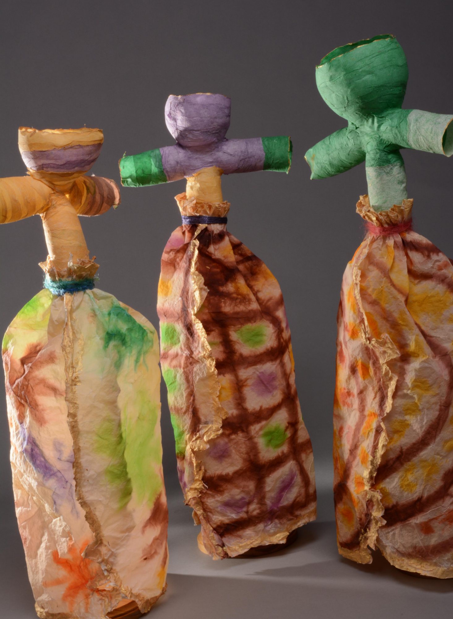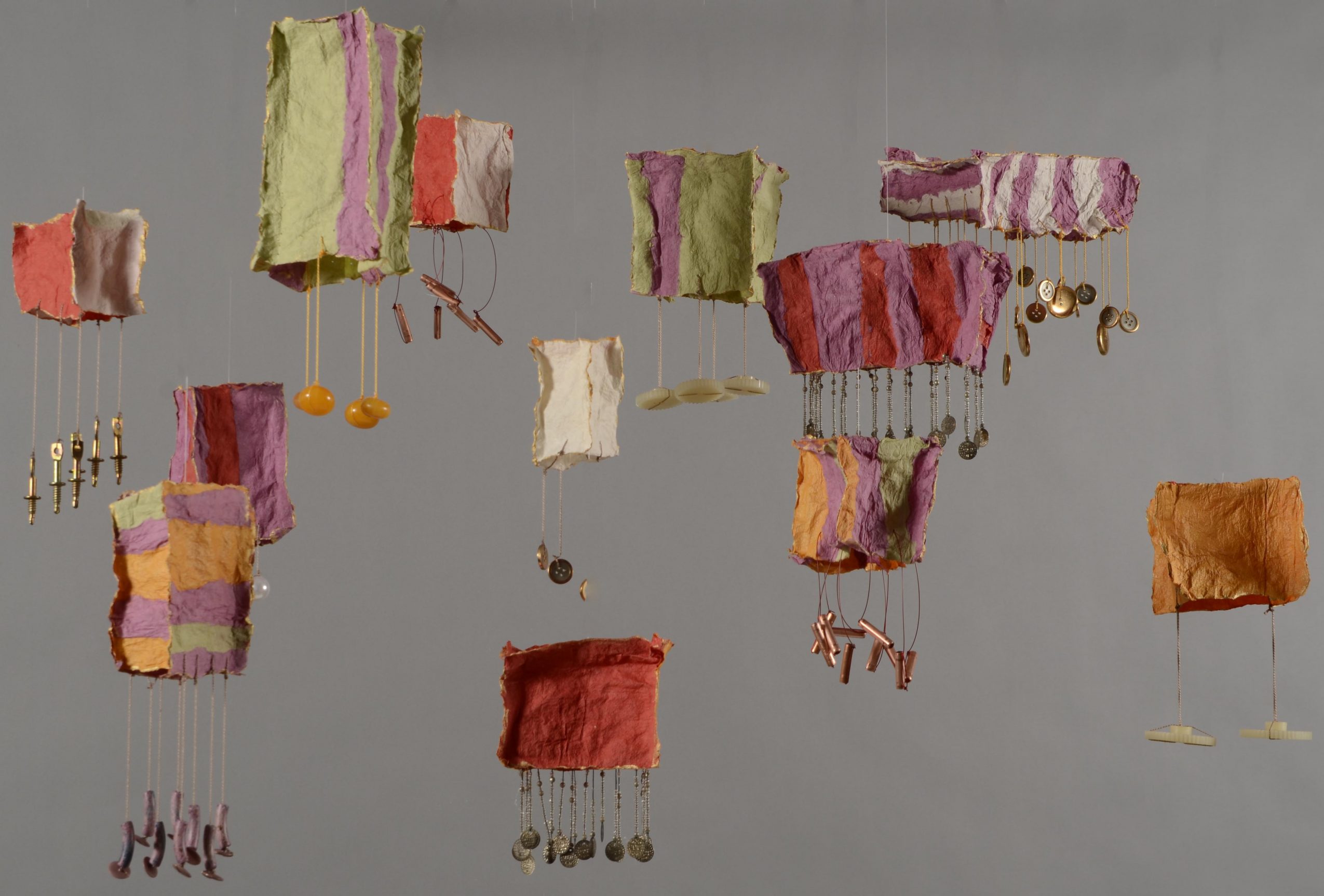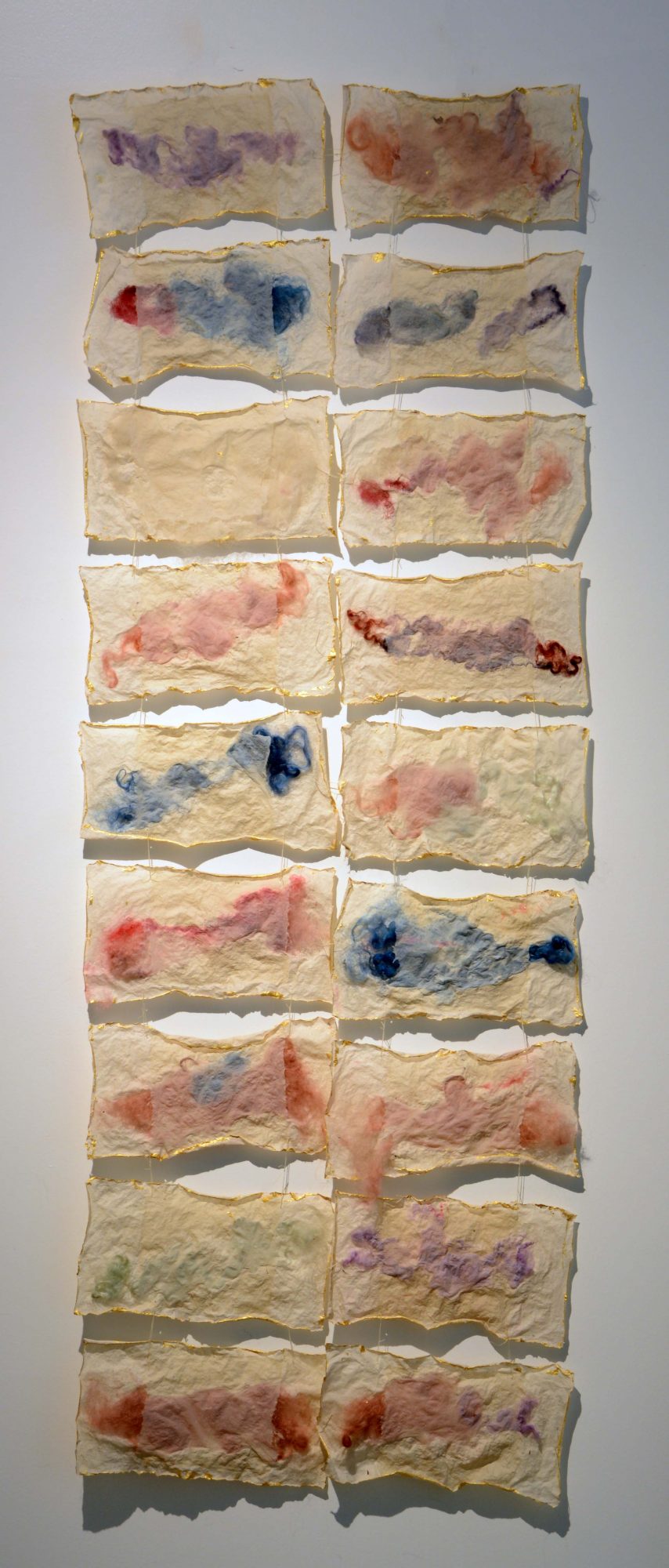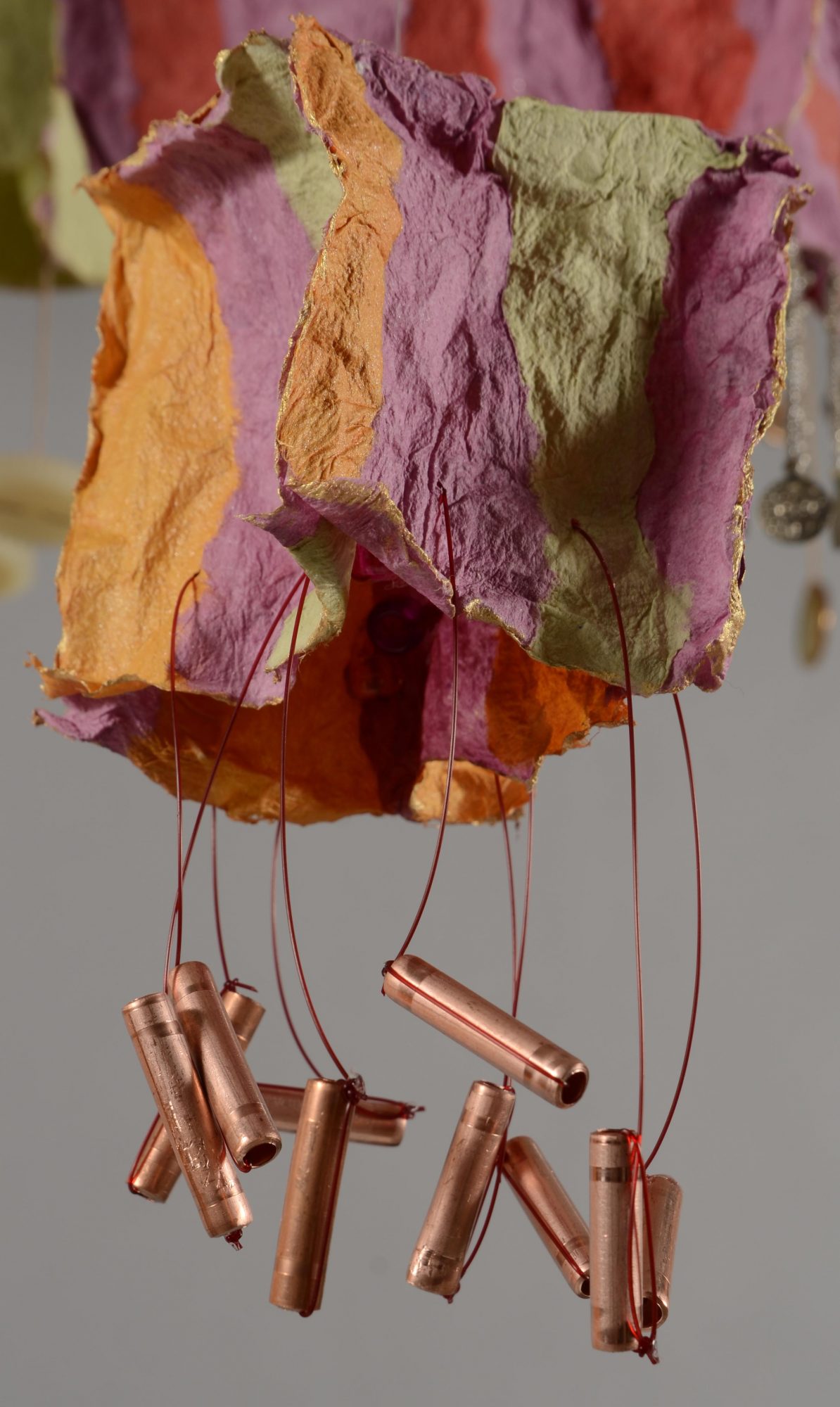 For me, paper is the ideal medium to explore these ideas. Paper itself is complex. It is light, responds to movement and appears fragile. As a paper sculptor, I know that it is also pliable, absorbs color beautifully, and is very strong. Abaca, the fiber I use most often, shrinks as it dries, adding the element of chance to all my work. I also enjoy the process of papermaking because of my love of water, for its beauty, sensuality and for its healing qualities.