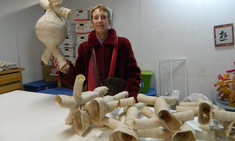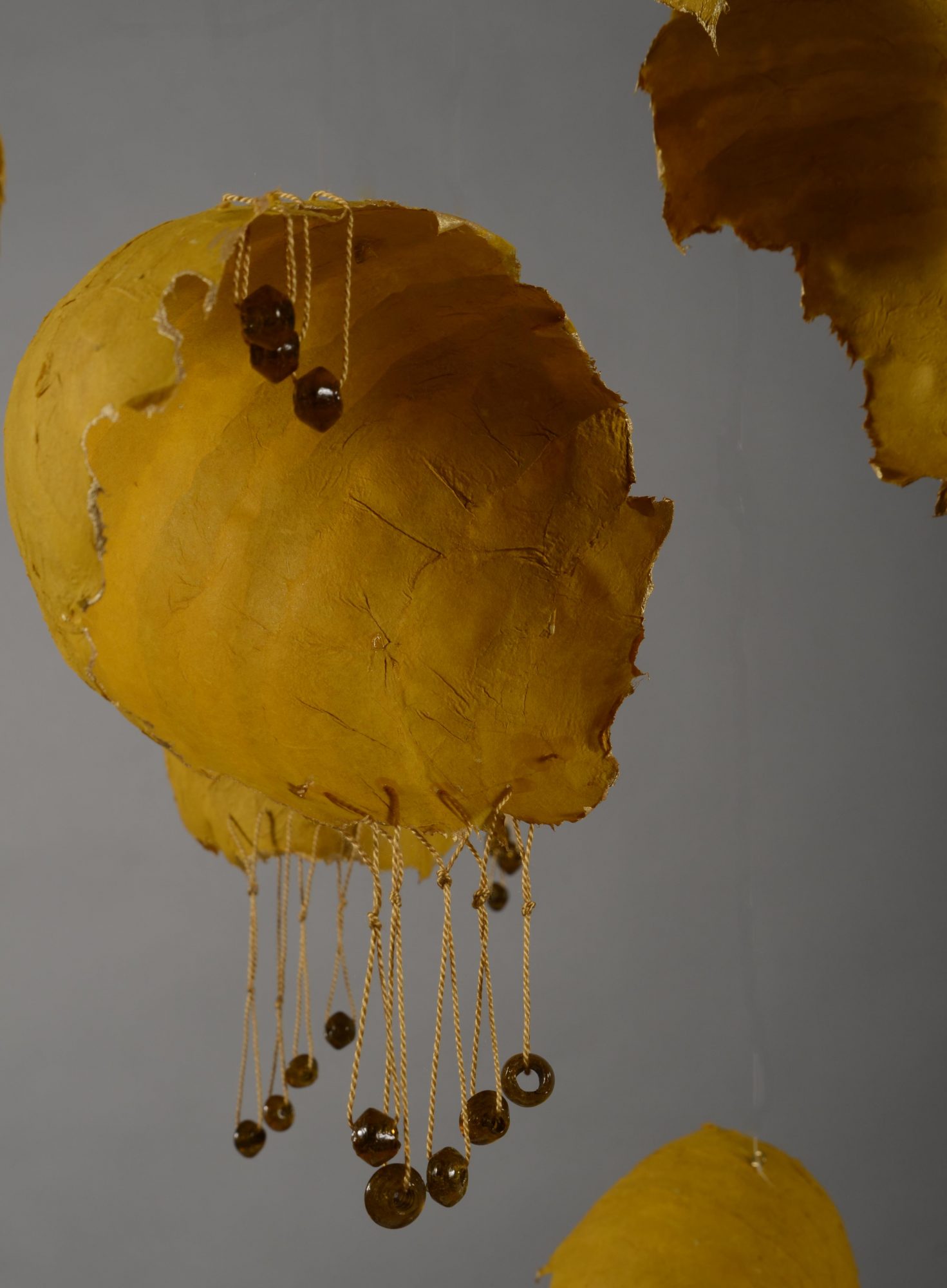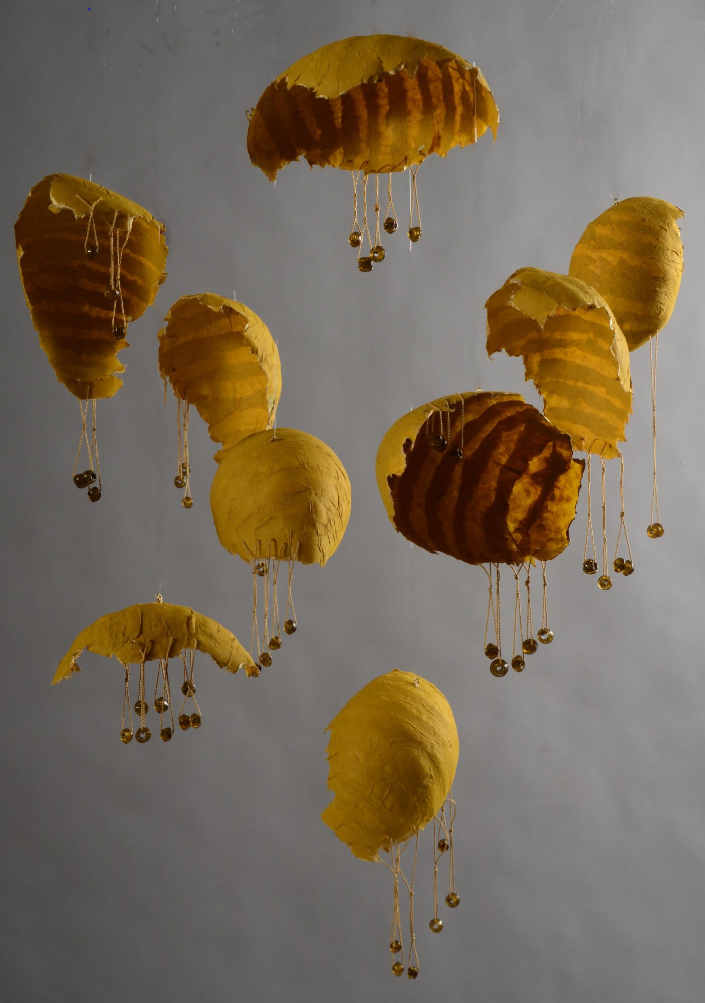 I make sculptures with handmade paper. With these sculptures I try to access something beyond our concrete world and to find meaning and comfort through doing so. Sometimes I do this very directly, as in my piece “A Full Taste of Happiness”, an installation of hundreds of Buddha-like sculptures, and at other times indirectly, as in the abstract hanging sculptures I call “Healing Machines.”