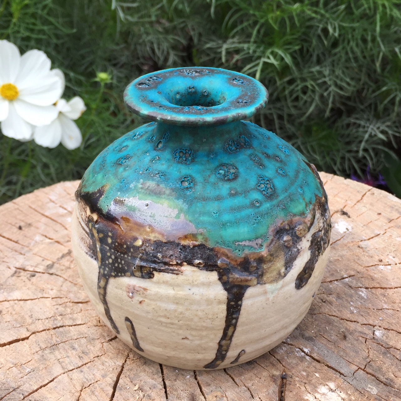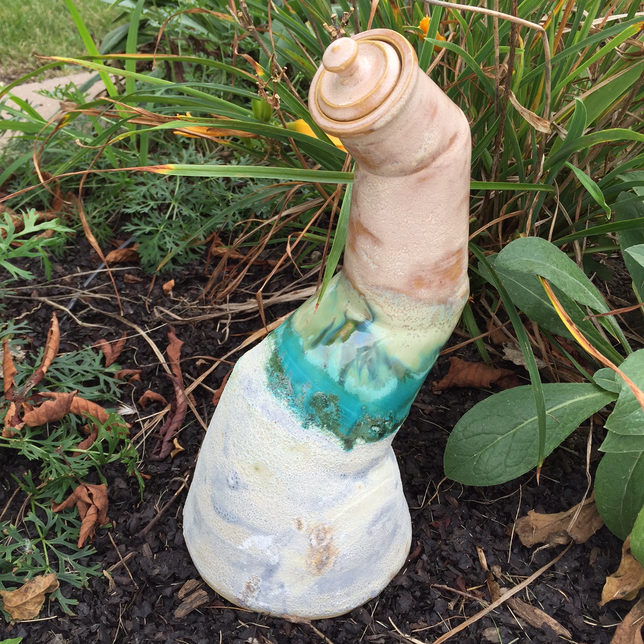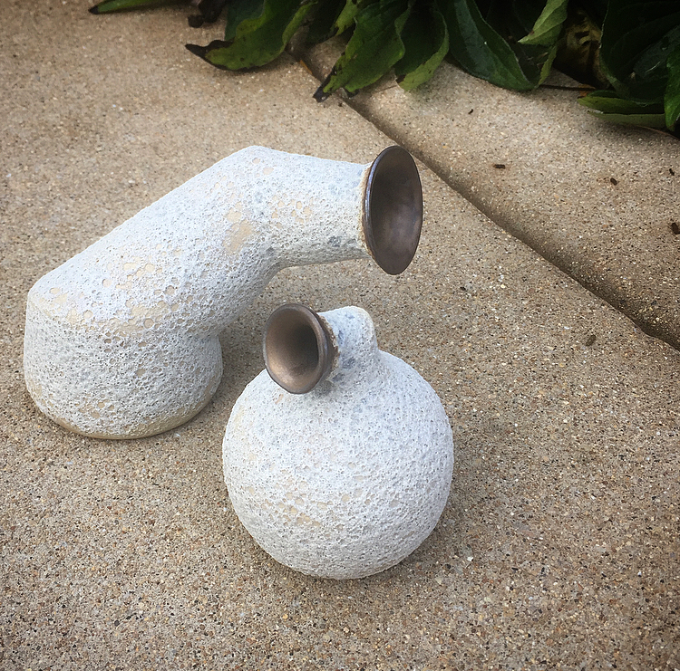 I had dabbled a bit in hand building but hadn’t done much on the wheel. As fate would have it, it took merely seconds for me to fall head over heels in love with throwing. That’s where my current artistic narrative begins. From then on, I tirelessly studied glaze chemistry, experimented endlessly with glaze recipes and firing methods and leafed through volumes of ceramics books and studies. I committed my time and energy into developing a unique personal style, concentrating heavily on off-wheel manipulation paired with bold and intense glaze assignment. I’m an undeniable extrovert with a lot to say, and this tactile and primitive medium has become my most beloved outlet for self-expression. It can simultaneously be delicate, precious, messy, precise, loud and wild. The feeling of wholeness and contentment when I work with clay is what tells me that I am forging ahead on the path I was meant to take.
