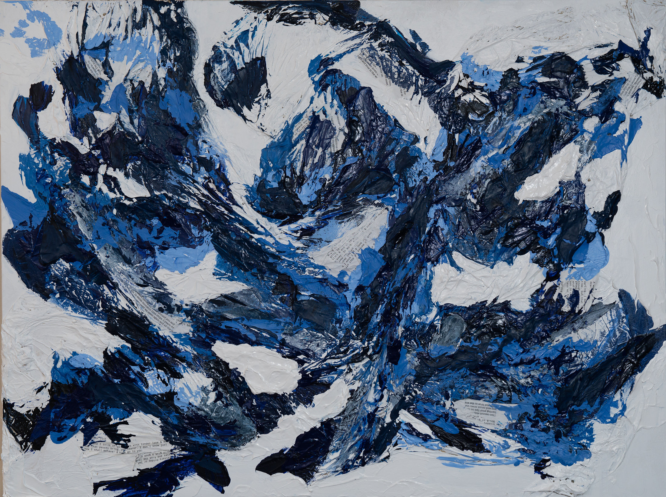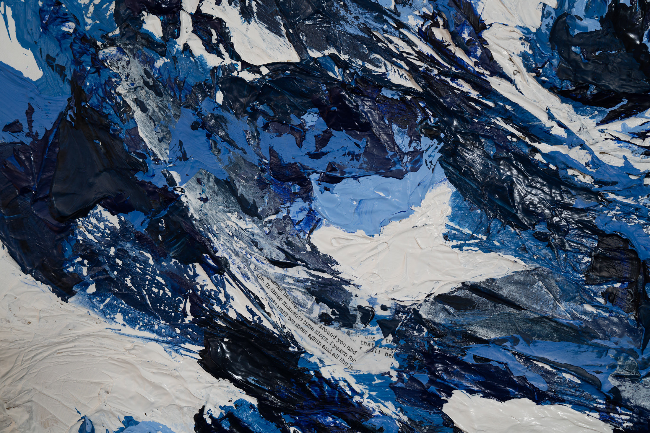 The work winds up being very energetic, with deep ridges and creamy mounds of paint. In some pieces I amplify the texture by painting my body and pressing it onto the canvas. Recently, I have introduced a narrative element by using snippets of love letters between women. With these elements I explore the body, identity and intimacy.