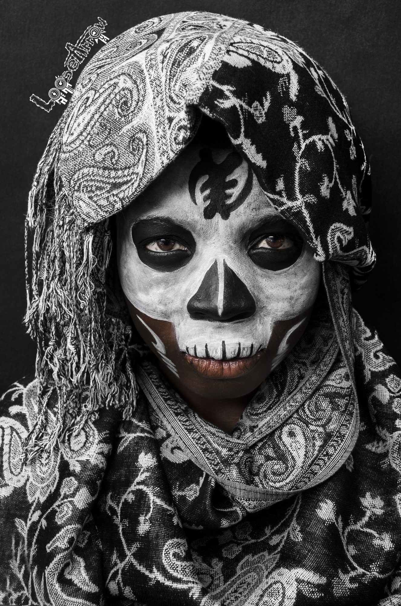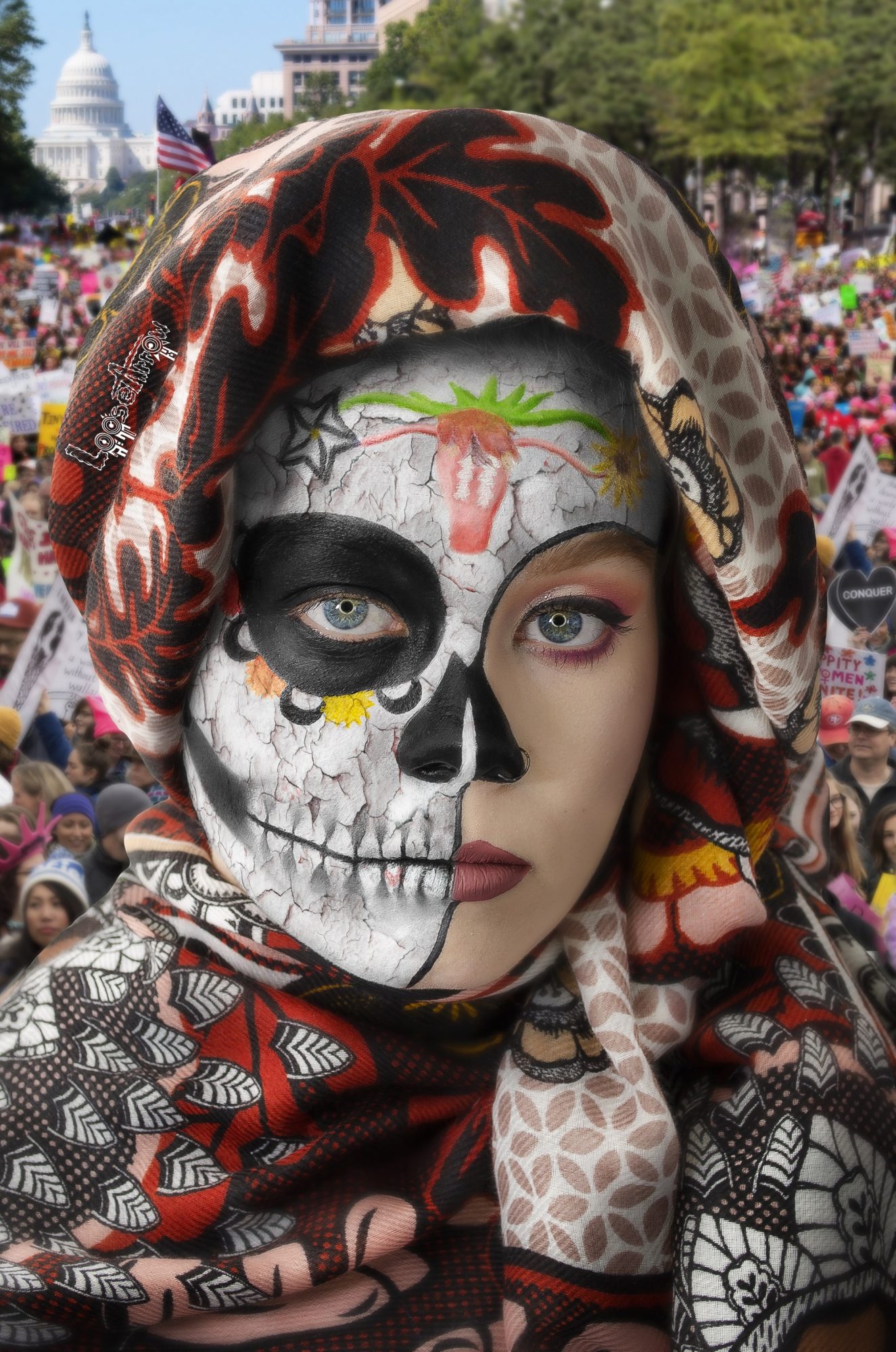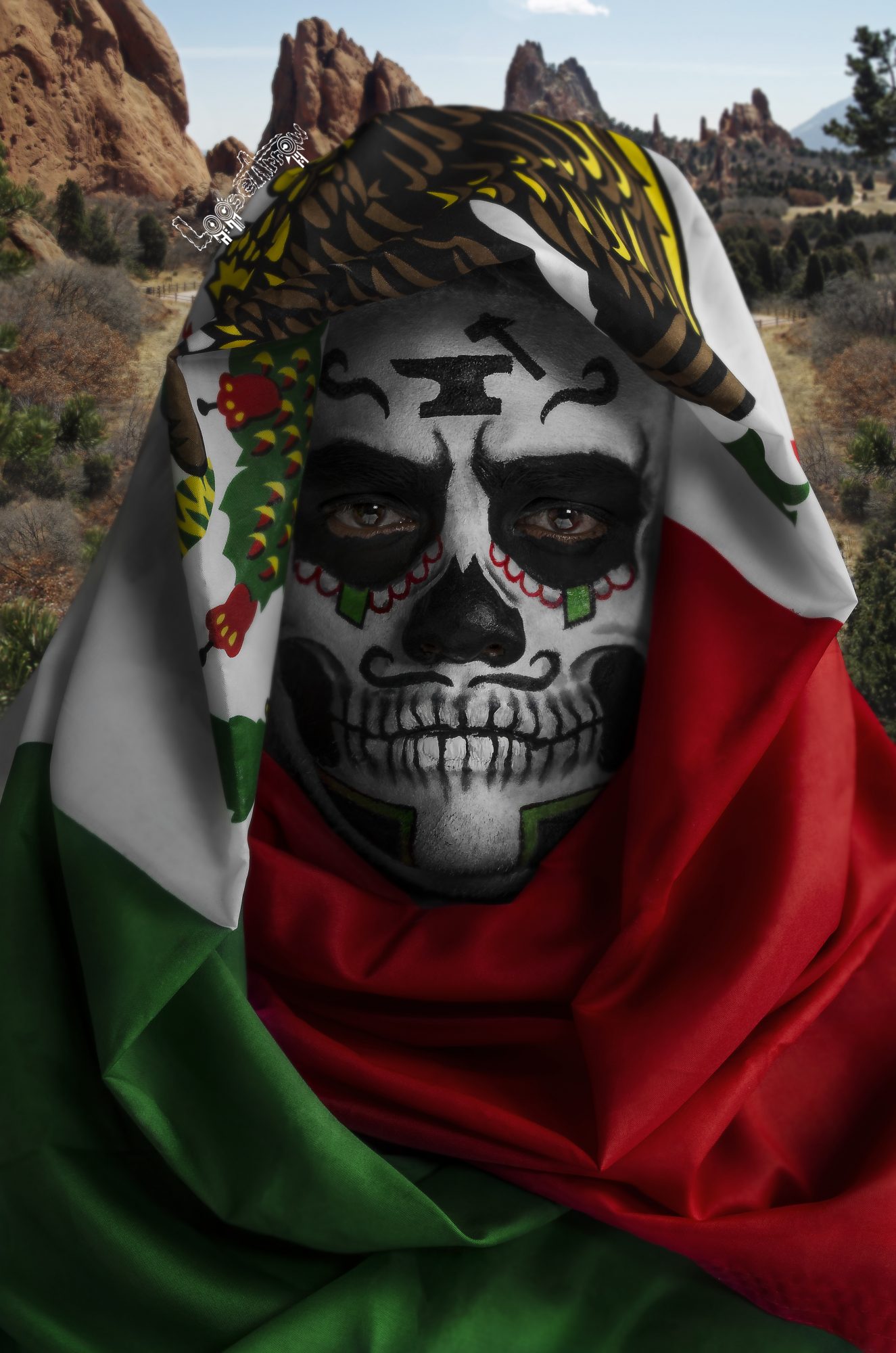 I take photographs of people after I paint their face to resemble a sugar skull. Each person’s sugar skull painting is different than the last. The face paint best reflects what the theme is about as well as a reflection of the person. After I paint their face and wrap them up in a scarf or flag, I then take a photograph and edit the photo in Photoshop. I also interview the person a bit to get an understanding of how exactly I want to depict them as. As well as getting a small summary to help better understand the person.