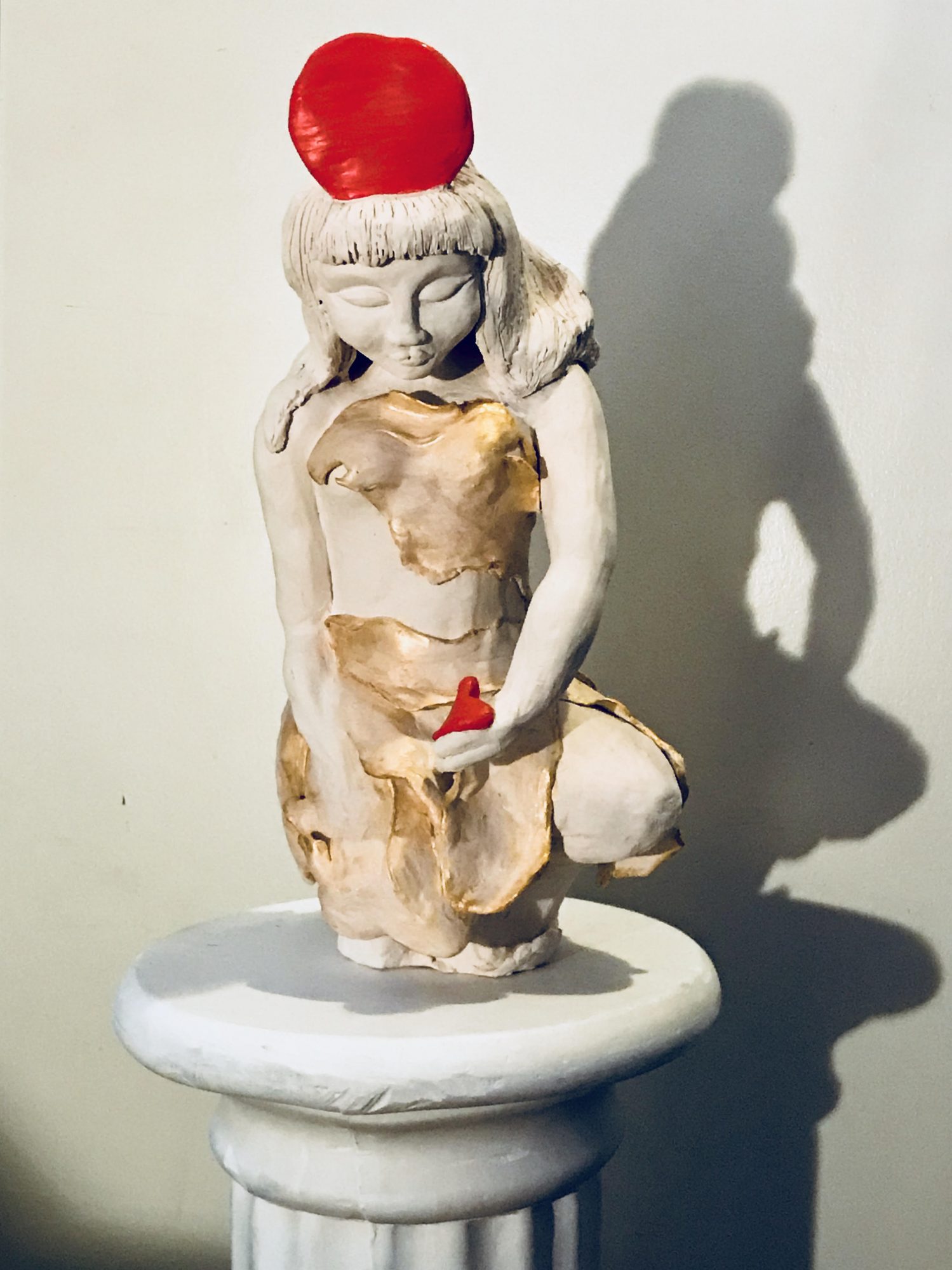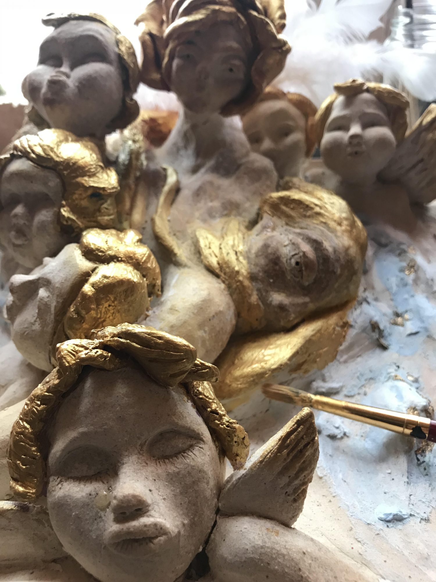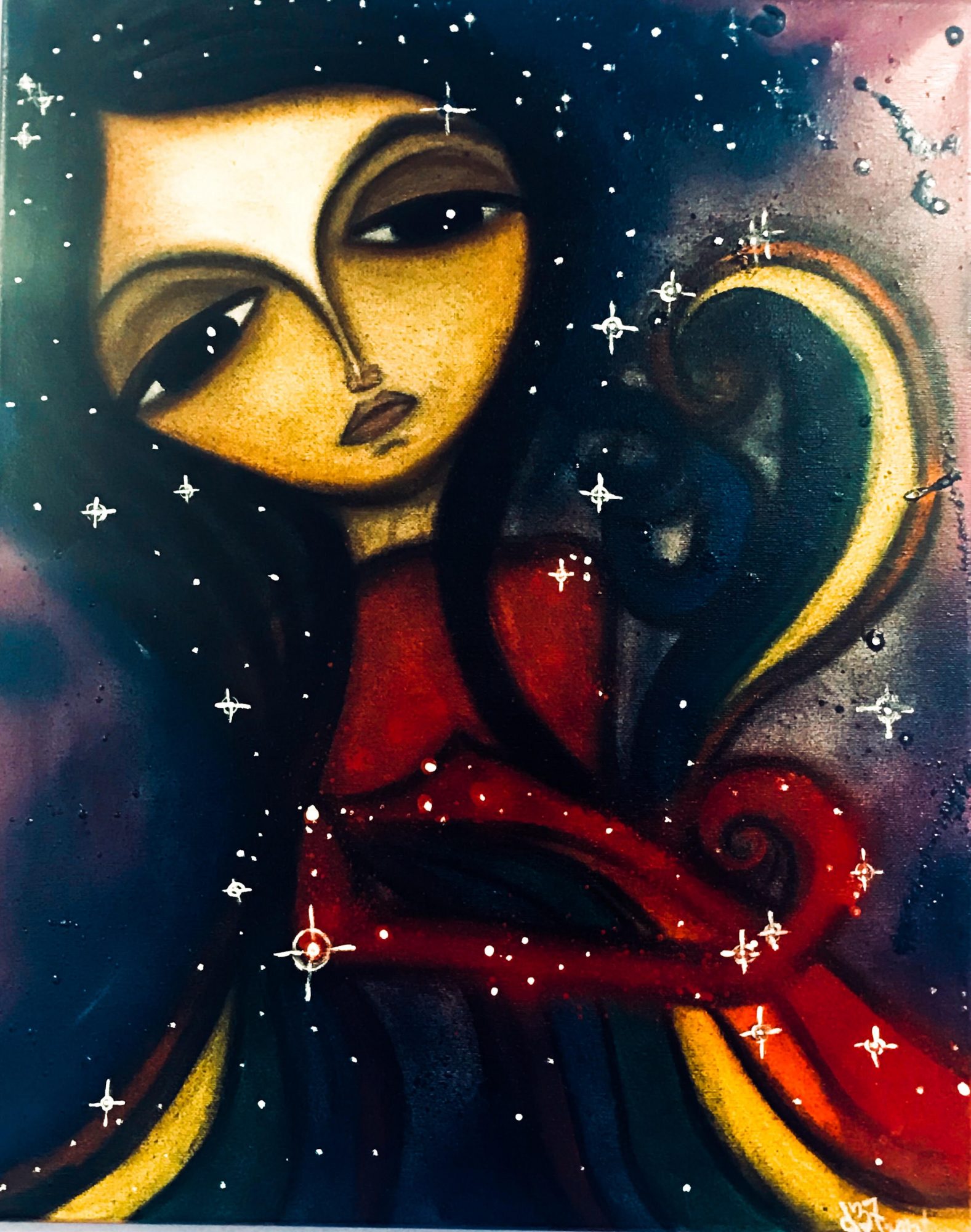 Maybe because I am female, a lot of my work is of the female subject and most is extremely expressive in emotion and color. Lately my work has focused more on my personal spiritual beliefs in which I translate the elements into the religious figures – for example, considering Mother of God whom I like to call Good, representing the water element, and she with Will and Love giving light to the fire element, God – two elements that required balance, air, a third element representing archangels and the fourth element being of Earth, us. This idea indicating that we are made up of all of the elements, including the negative energy left from the jealous archangel – this being the demon inside that we fight everyday. My angels, sculptures and poems all very much somehow trace back to religious or faithful beliefs with a message of hope.