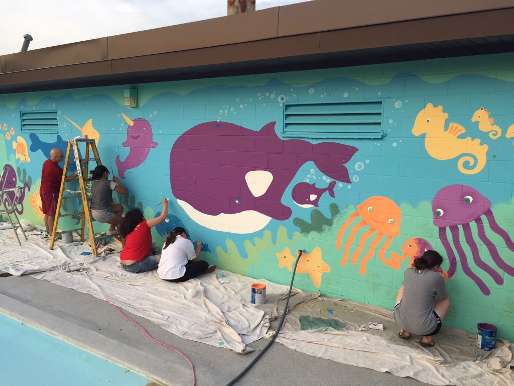 The mural I am working on can be seen after June 2 at the Westchester Community Pool in Westchester, IL, just west of Chicago. You can also see my commercial work and some of my fine art on my website, www.Saltcreekdesign.com.