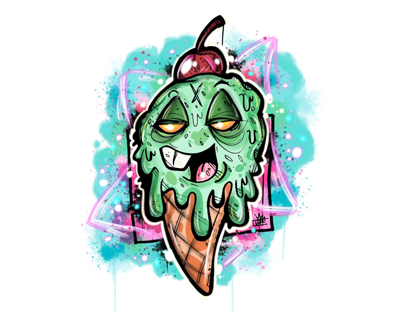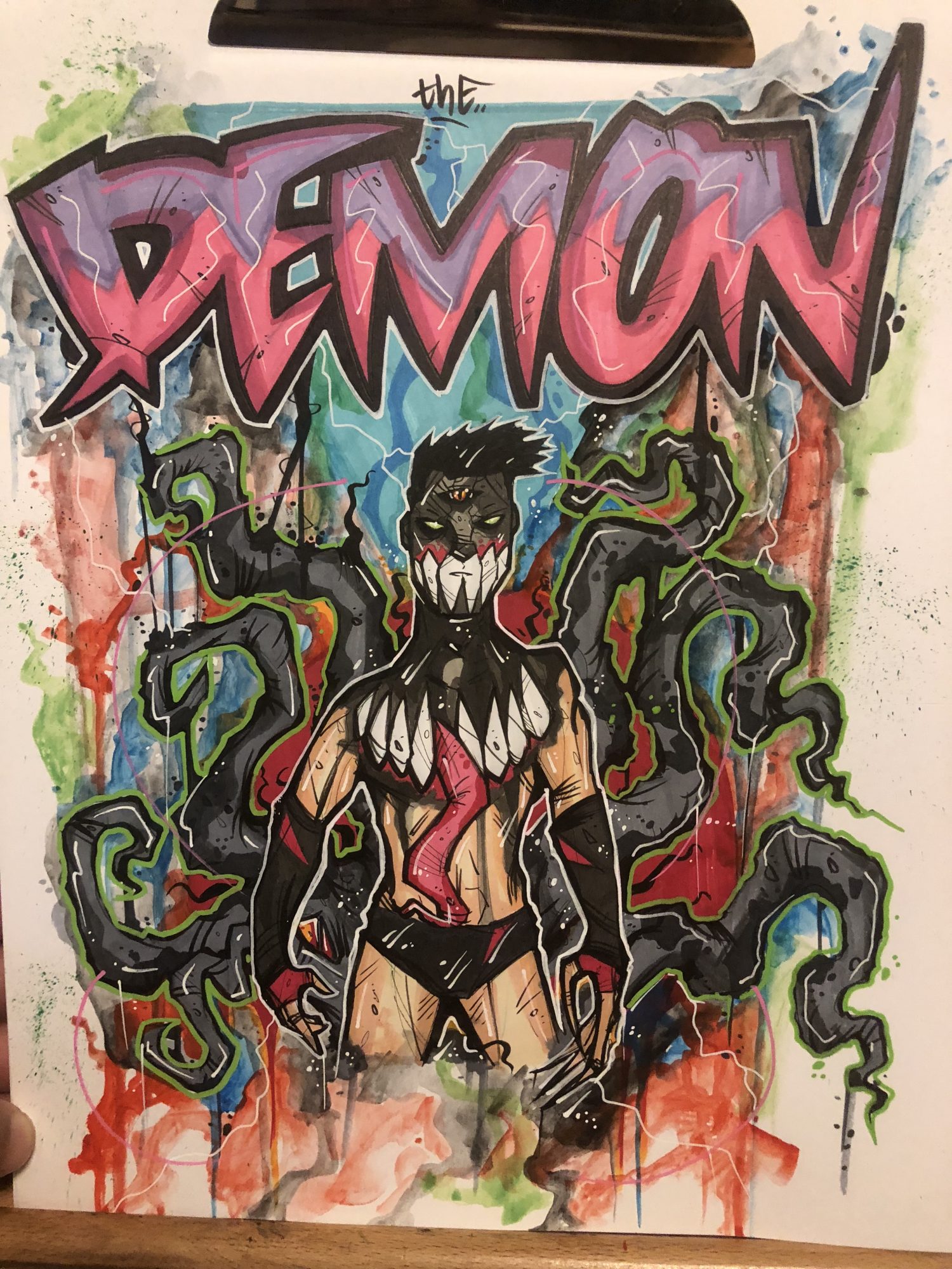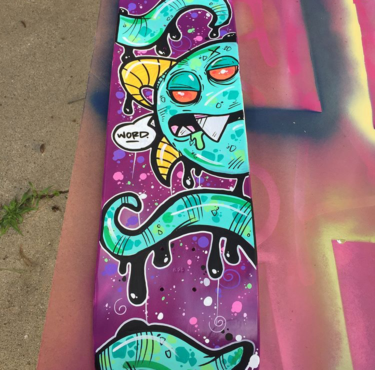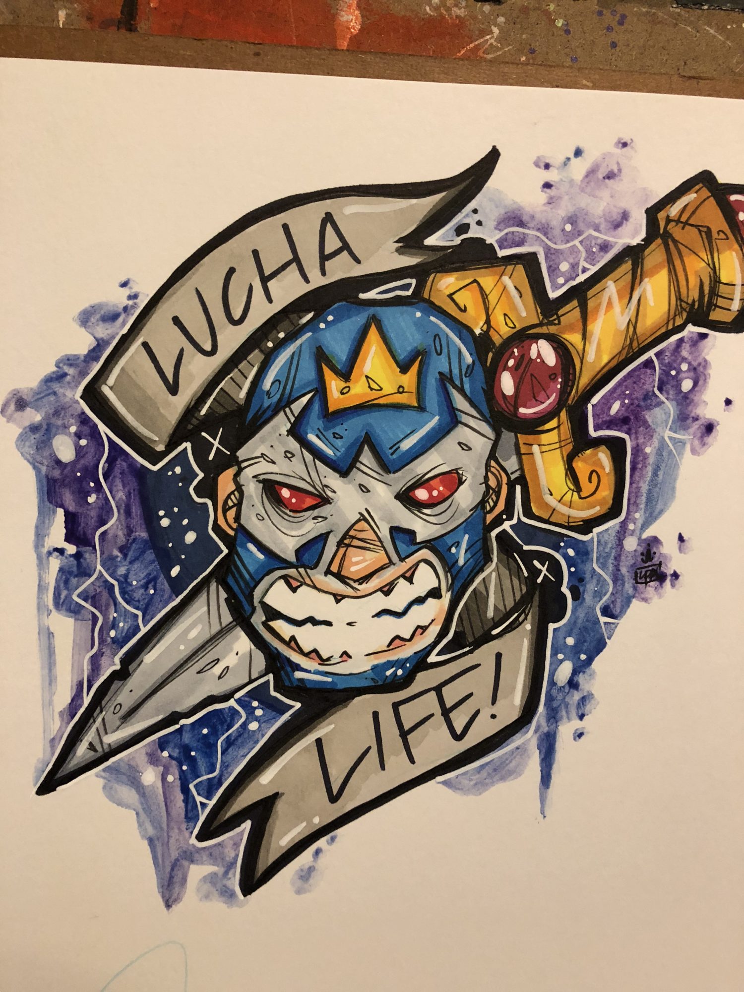 So my art is a mash up of graffiti art and comic book art. I grew up loving both and in time found ways to bring those two together in my own style. I love lettering, drawing cartoony food and Luchadores because those are all things that remind me of my childhood and growing up in an environment that allows you to grow up and express your creativity! I love color, I work with markers, watercolor, and acrylics, I’ve even started doing more digital artwork in the last couple of years! I’m lucky enough to have a good amount of freelance work where I get to work on licensed products for Upper Deck, Marvel, and Adult Swim, but my true expression is drawing these fun goofy characters that make me smile and people are really into them! I find myself selling a lot more of my original work which then motivates me to pursue that and less on fan art at conventions and pop ups.