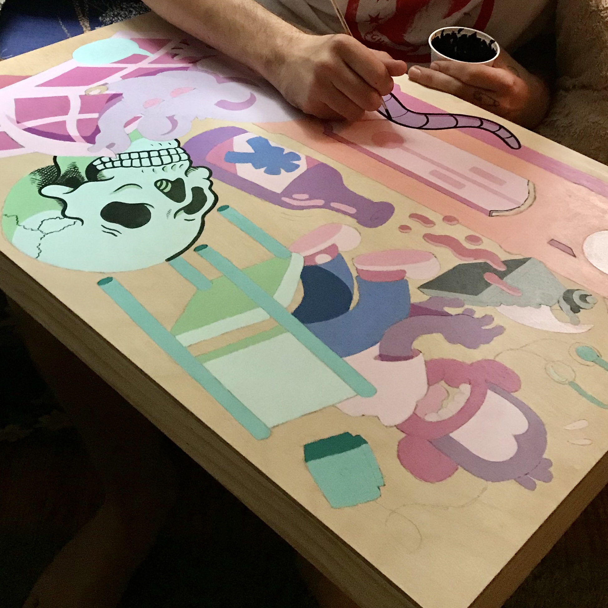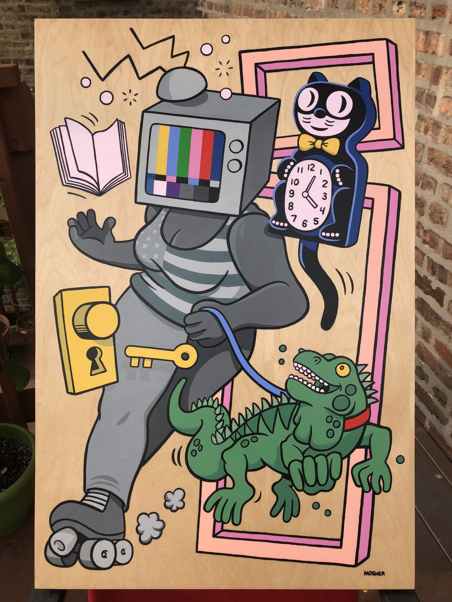 I’m a Chicago based artist originally from Florida. Obsessed with cartoons and comic books, I began making art at a very young age and have continued drawing heavily from these early influences. After moving to Chicago and working some odd jobs I finally made the move to becoming a full time artist and supporting myself with my work. I draw or paint every day and still find the same enjoyment in creating that I did as a child.