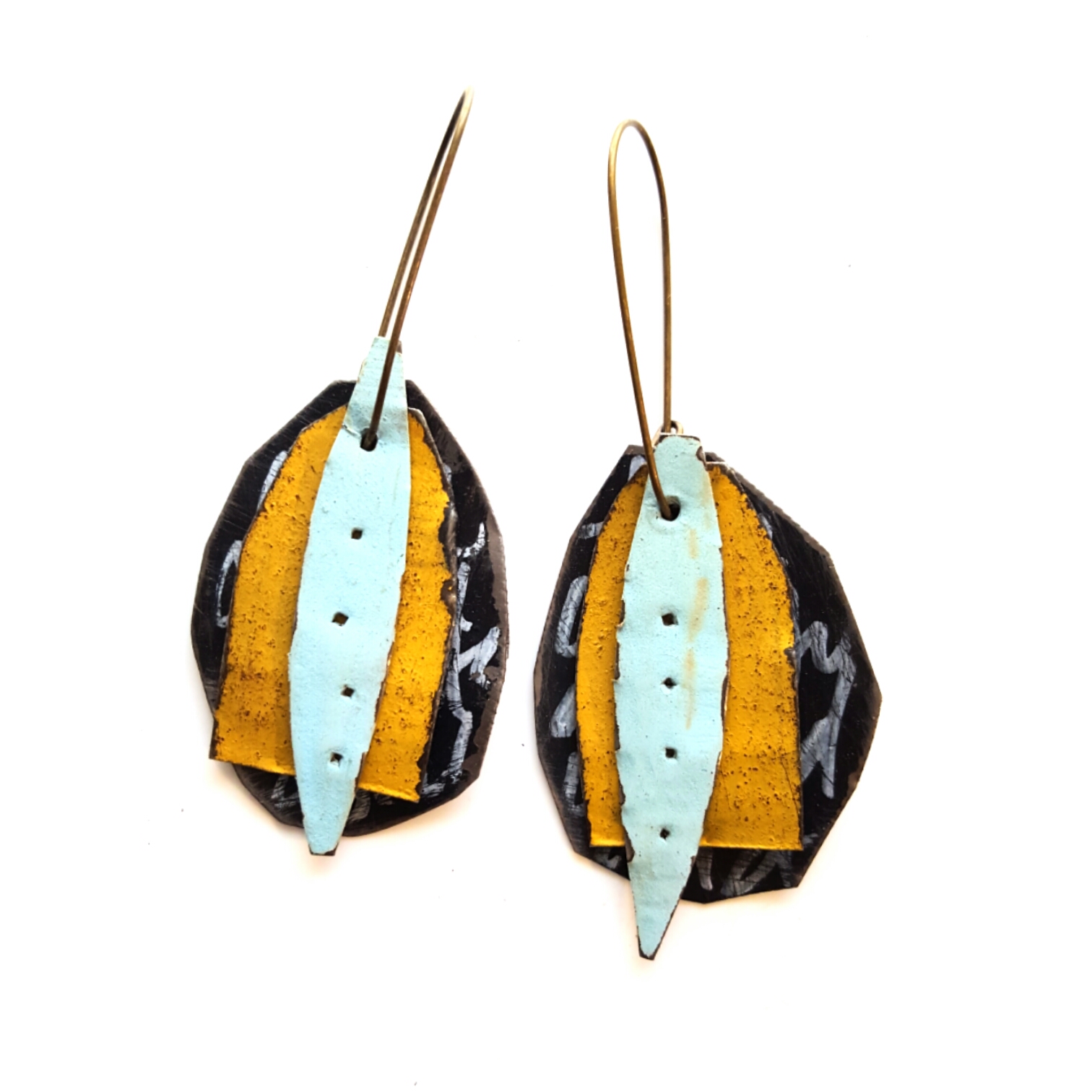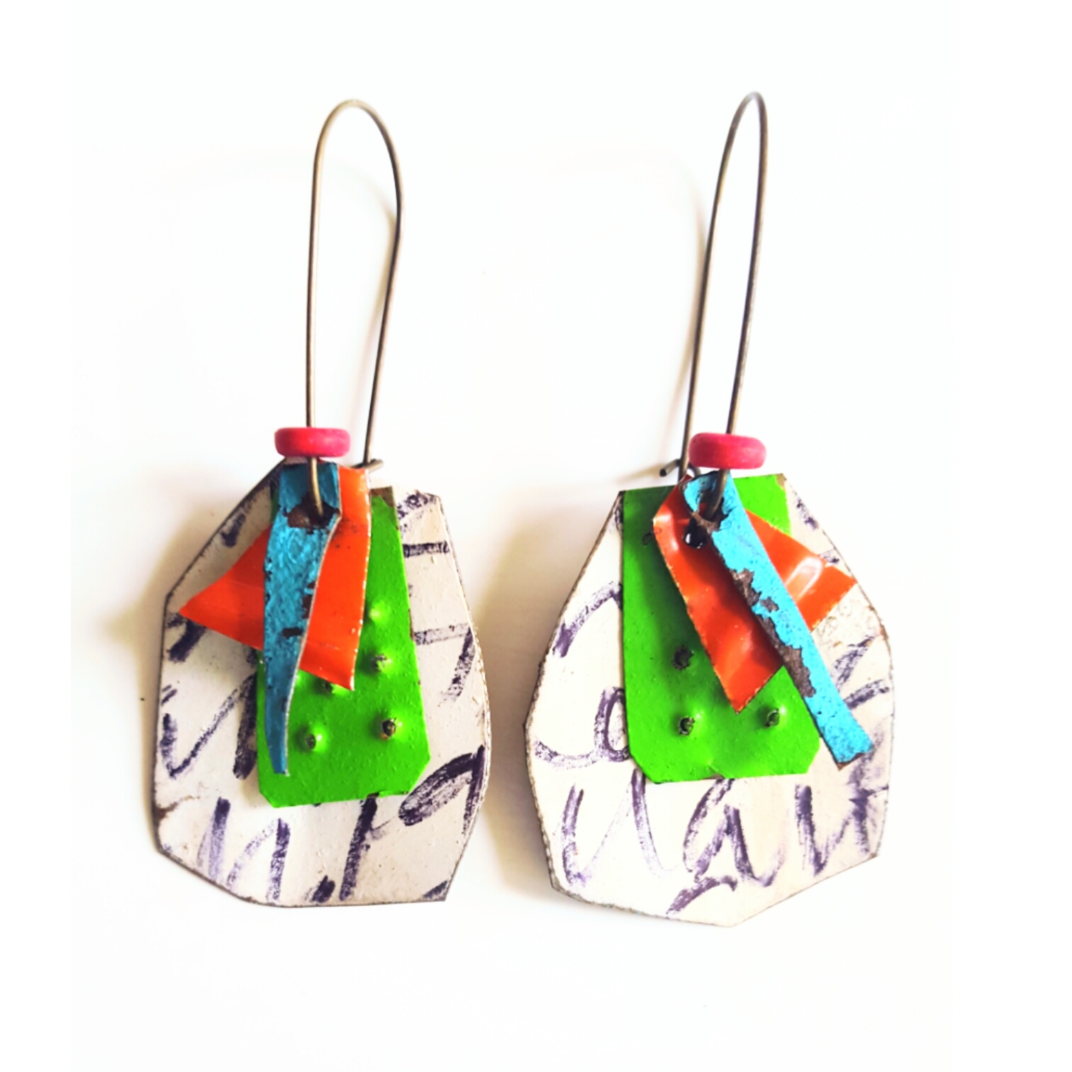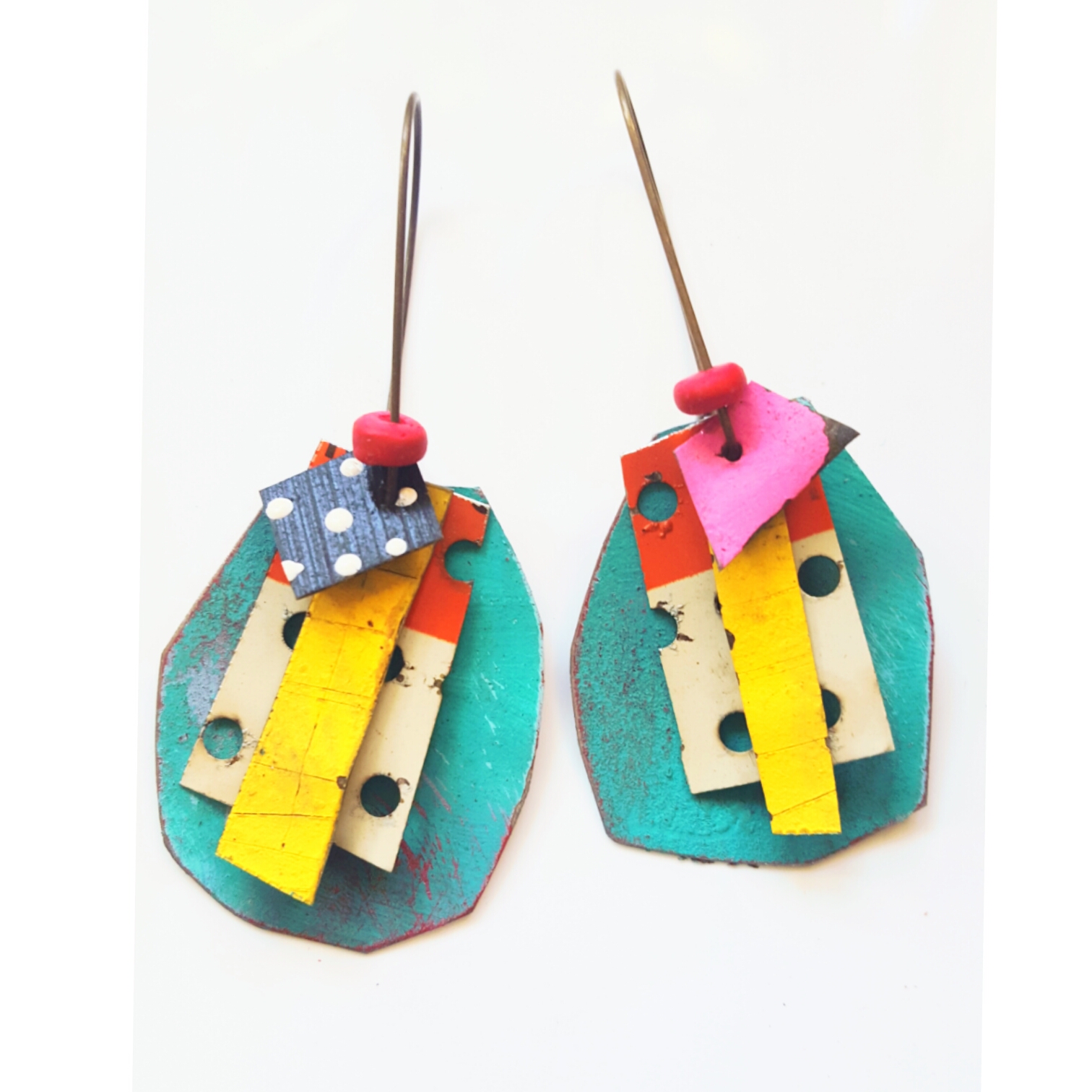 I create mixed media jewelry and collages from reclaimed materials. I have been focusing most of my energy lately on reclaimed tin jewelry. Each piece is cut by hand, sanded, painted and collaged to make earrings, pendants, brooches and rings. Most of the pieces are brightly painted, and some of my favorites layer colors and textures. My hope is to create fun, wearable art that is affordable for my customers. Each piece is truly one of a kind.
