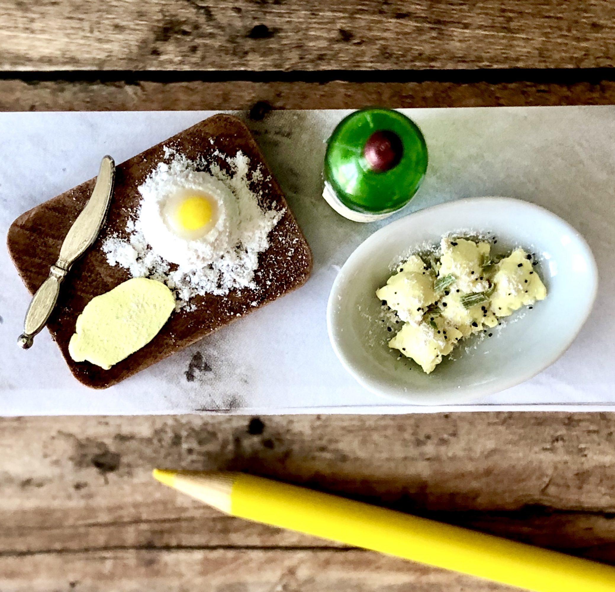As with anything, there were definitely struggles I had along the way. I would love to tell you about the first miniature I ever made. One day, about 5 years ago, I was sitting at home watching YouTube videos of miniature artists creating little replicas of everyday food with polymer clay. My son, who was 2 at the time, was taking a nap and I didn’t have any clay handy, but I instantly had an urge to create a tiny fake taco! Instead of waiting for my son to wake up so we could go buy clay, I impatiently went into the kitchen and made a quick moldable, bakeable dough with salt, flour, and water. I figured all I could do is work with what I had at the moment! I took the dough and started carving! I cut out the tiny tortilla, and made super small pieces of shredded cheese, ground beef, and tomatoes, then baked it.