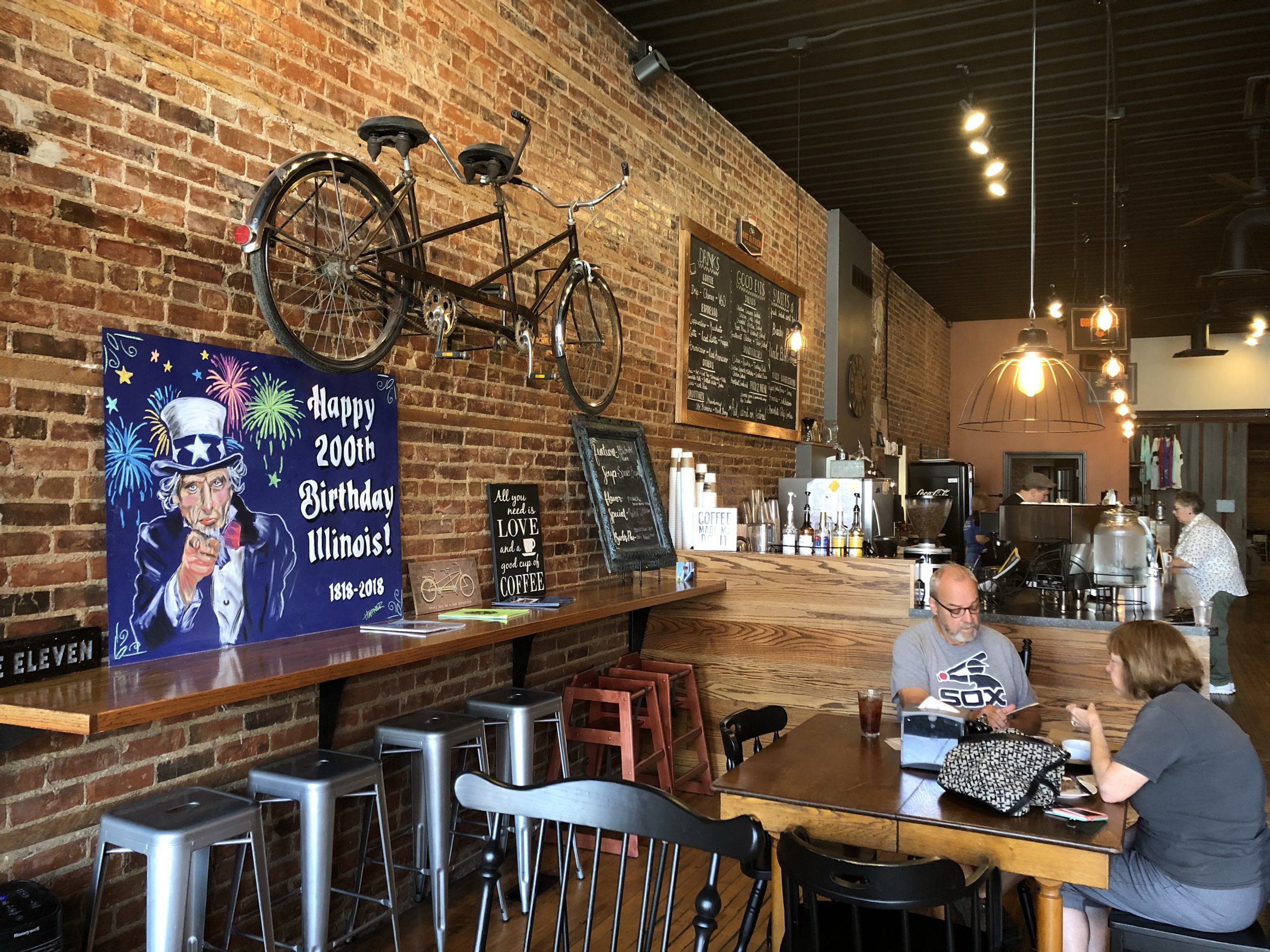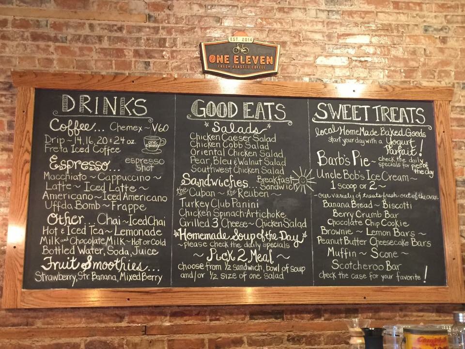 One Eleven Coffee specializes in coffee, we use a couple different roaster. 30/30 Coffee from Peoria, IL is our espresso roaster and loose tea provider, and Fresh Grounds Coffee in Geneva, IL is our roaster for all things coffee here. We have a killer menu that features paninis, salads, and daily fresh soups. Our baked goods and homemade pies bring them in from all around. We have a bicycle theme for our decor, as we have a trail that goes through our town here called the Rock Island Trail. If it’s a nice day, you will be sure to see many bikes parked outside. We host special events like our Oktoberfest, wine pairings and tastings, as well as local acoustic talents.