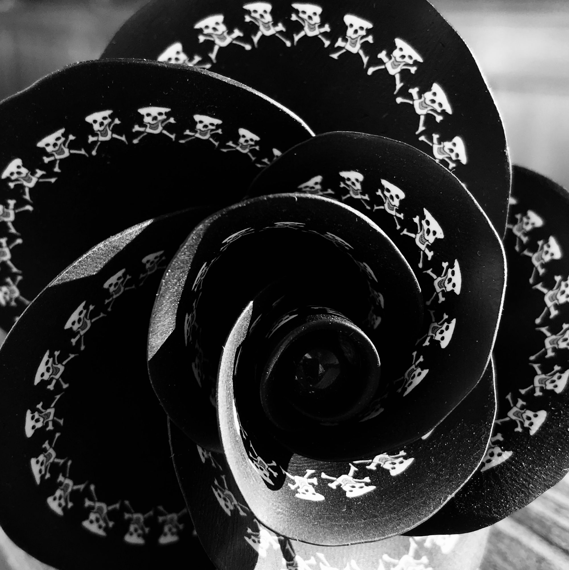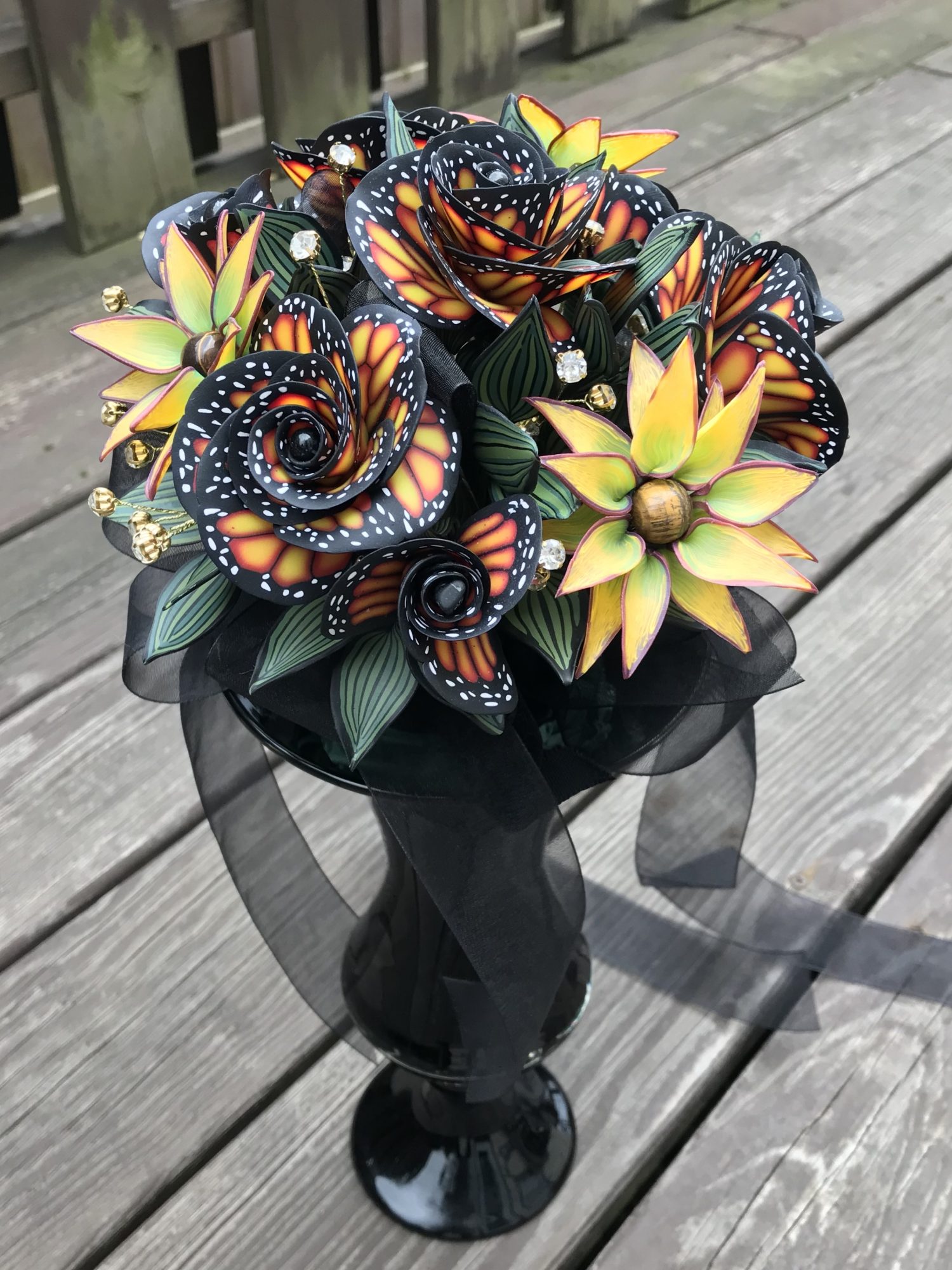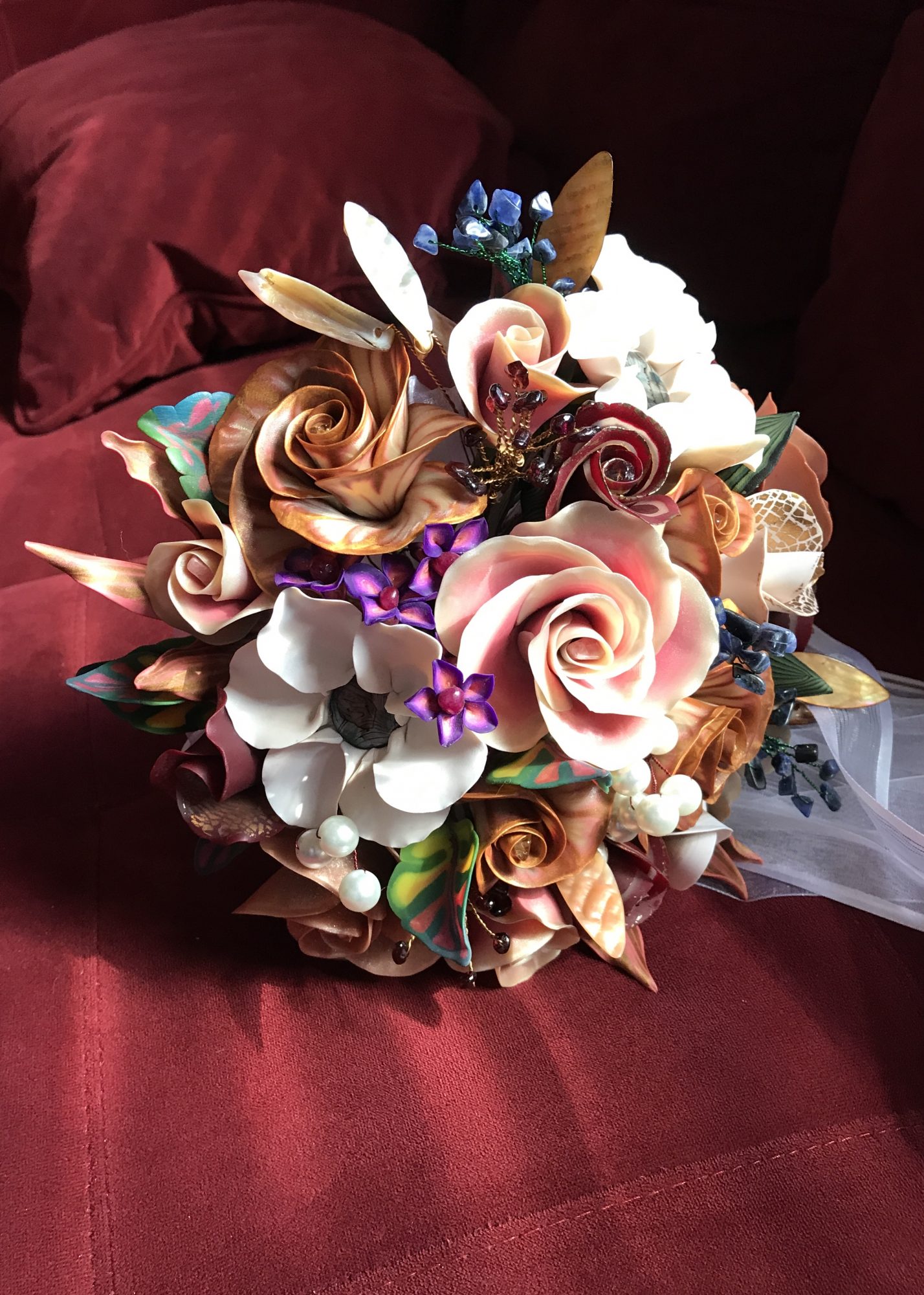 I hand sculpt one of a kind polymer clay flowers with gemstone centers. My flowers have a Lewis Carroll Alice in Wonderland type twist: Monarch Butterfly Roses, lace, skulls, fire, stone… etc. Most look at the flowers and think they must be painted, but it is the different colors of polymer that creates the effects and patterns in the flowers. I make bespoke wedding bouquets as well as single flowers. I do various art fairs, special orders and I will be at Bristol Renaissance Faire during the 2018 season.