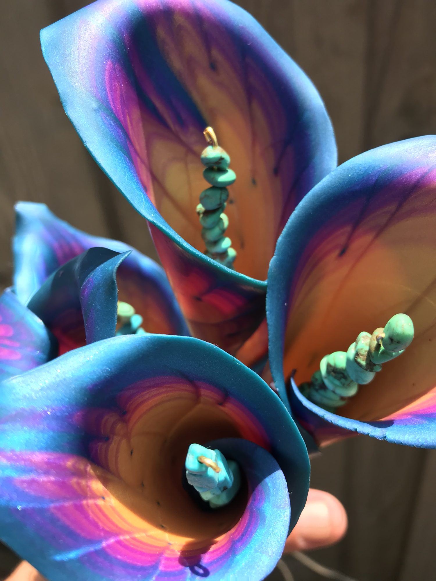 I was working for Natural Wonders in the 90s and had to demonstrate a Klutz book about Sculpey polymer clay. After demonstration day the clay was open and couldn’t be sold, so I brought it home and kept playing with it… and playing with it… and playing with it. I was making a lot of little people with crazy colorful clothes. Around 2000 my cousin saw some flowers I had made and asked me to make her wedding bouquets. Since then, I have had a steady stream of requests for flowers. Now, after years of claying, making crazy cool polymer flowers is my full-time thing.