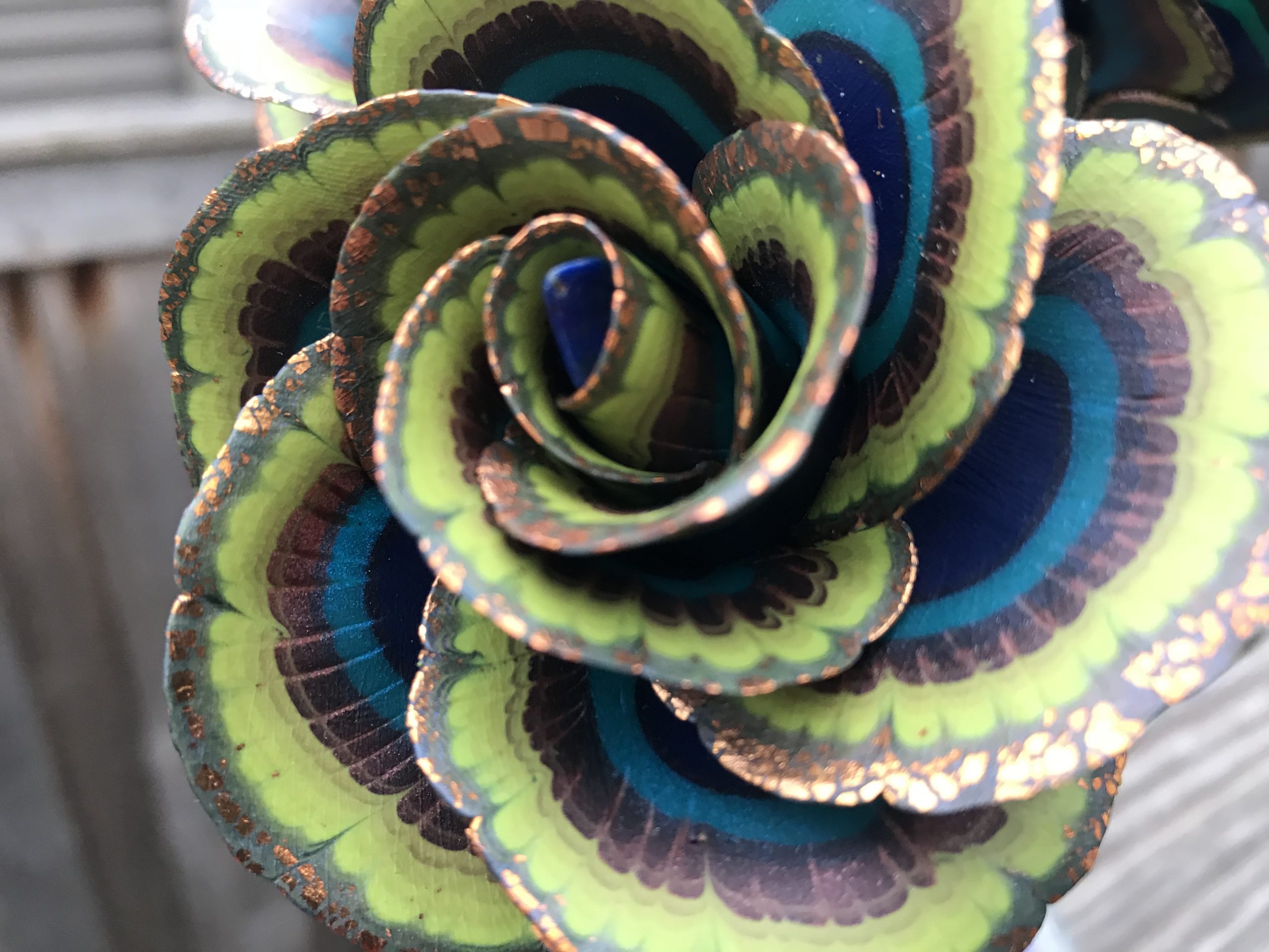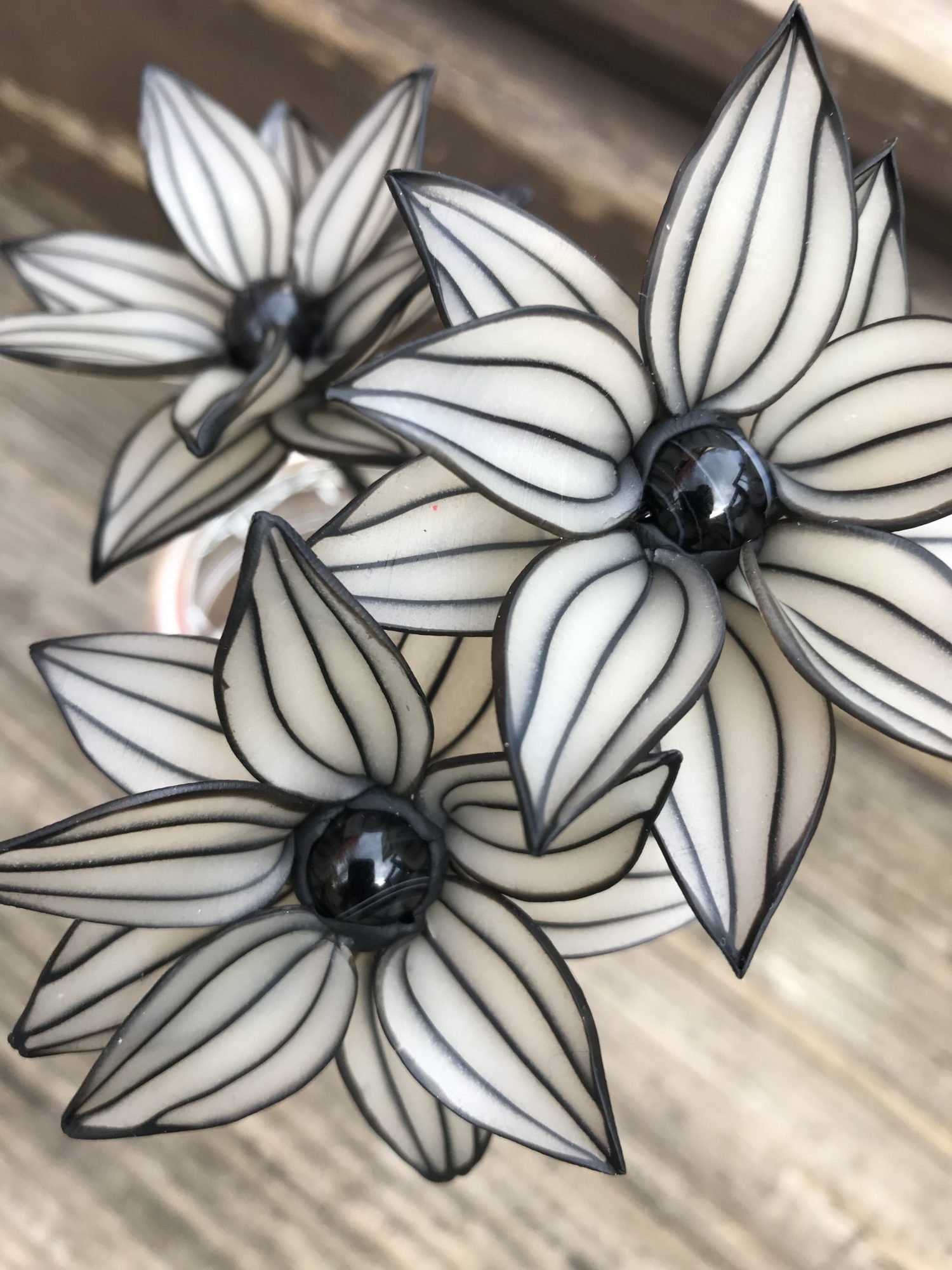 Polymer is a fairly new medium in the art world. It is not widely taught in schools yet. Back in the 90s the internet was not that huge yet. So, I worked basically in a vacuum with a medium that I really knew nothing about, thinking I was essentially alone in my obsession with the colorful clay. Through Yahoo, I found the incredible Chicago Area Polymer Clay Guild (http://www.capcg.org/). And through them I found the International Polymer Clay Association (http://www.theipca.org). My eyes were opened to huge world of artists that also love and obsess over this crazy clay. The possibilities were endless. I attended the very first polymer art exhibit in Racine in 2011. I’ve met and studied with my idols including Nan Roche (the woman who wrote the first book about the medium), Lindly Haunani, Marla Frankenburg, Jana Roberts Benzon and more. I love finding out what others are doing with this stuff and discovering new techniques to apply to my flowers.