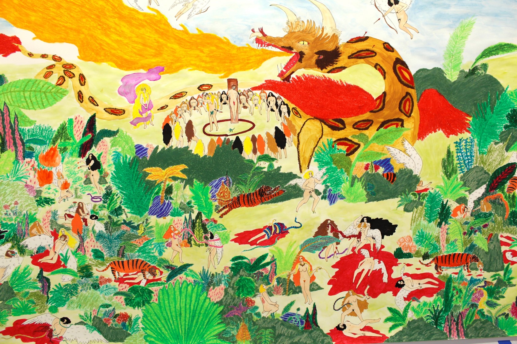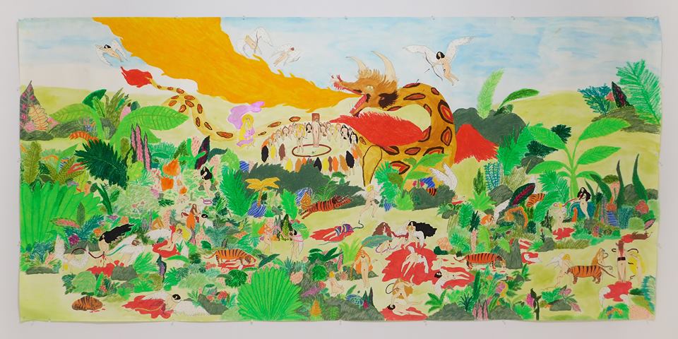Naturally, I became interested in mythology because of the rich narratives, and epic sagas/tragedies following heroes, whether blessed by gods or cursed fighting their hardest battles and going through a mix of emotions. I felt like they were very relatable to my life so I began creating my own mythological narrative by fusing existing mythologies, and queer/feminist theory with events in my life. These often took form in long scroll-like drawings with multiple scenes happening in one massive scene, as well as oil paintings of just one strong composition of a scene that would exist in my scrolls. I often think my body of work is yet another evolution of my paracosm but in a tangible form.