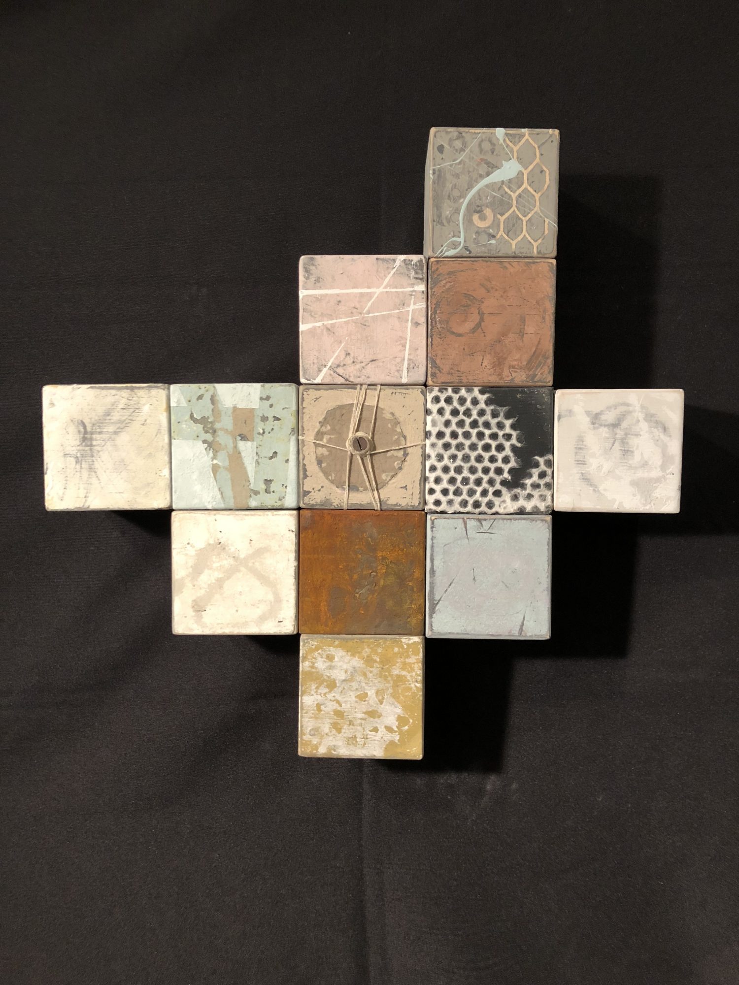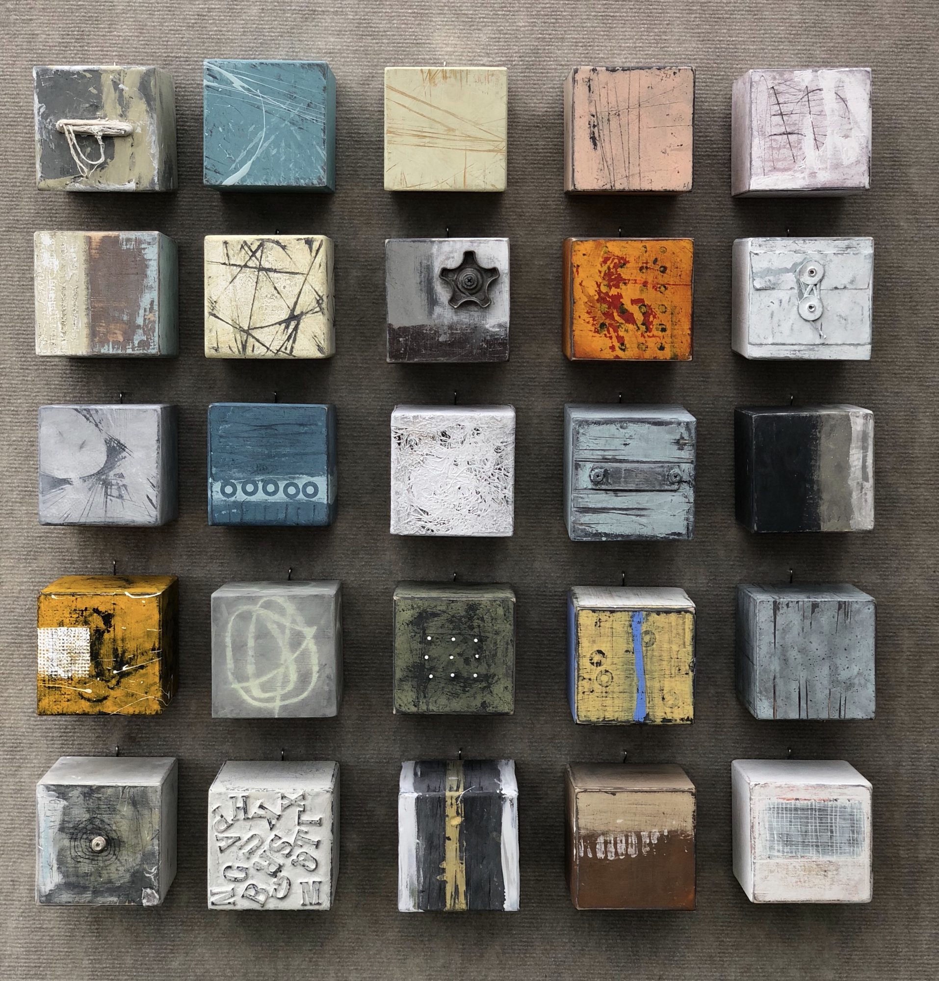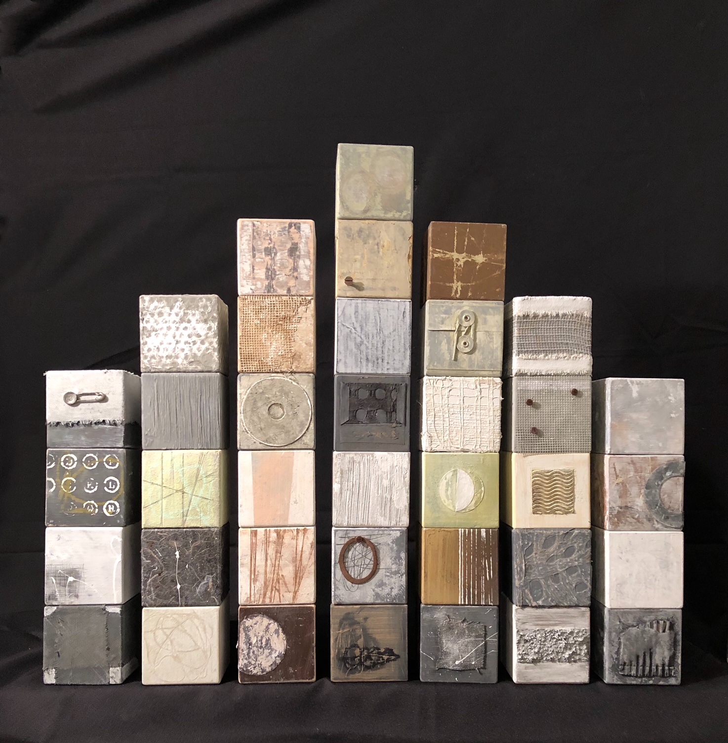 I deconstruct and reconstructs layers of roofing tar, plaster, found & interesting things, metals, symbol’s, rich acrylic colors to create inspirational and emotionally driven paintings and sculptures.