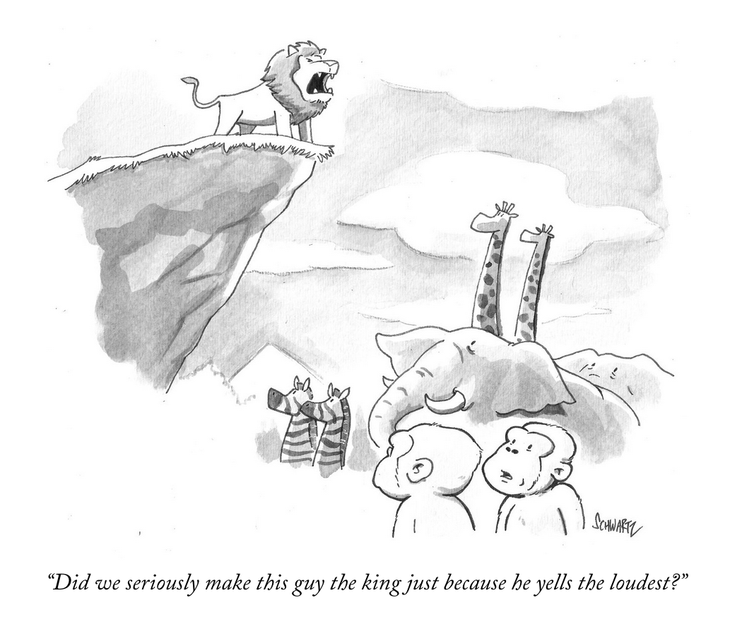 I make very silly cartoons for a (mostly) very serious magazine. My work is all single-panel drawings, supplemented with a line or two of text. The fun and challenge of working in single panels comes from trying to tell a coherent story in such a small space. Sometimes these stories are meant to humorously comment on real behaviors and events. Sometimes they’re just meant to be goofy and superficial. My baseline hope is that they provide the readers with a momentary smile.