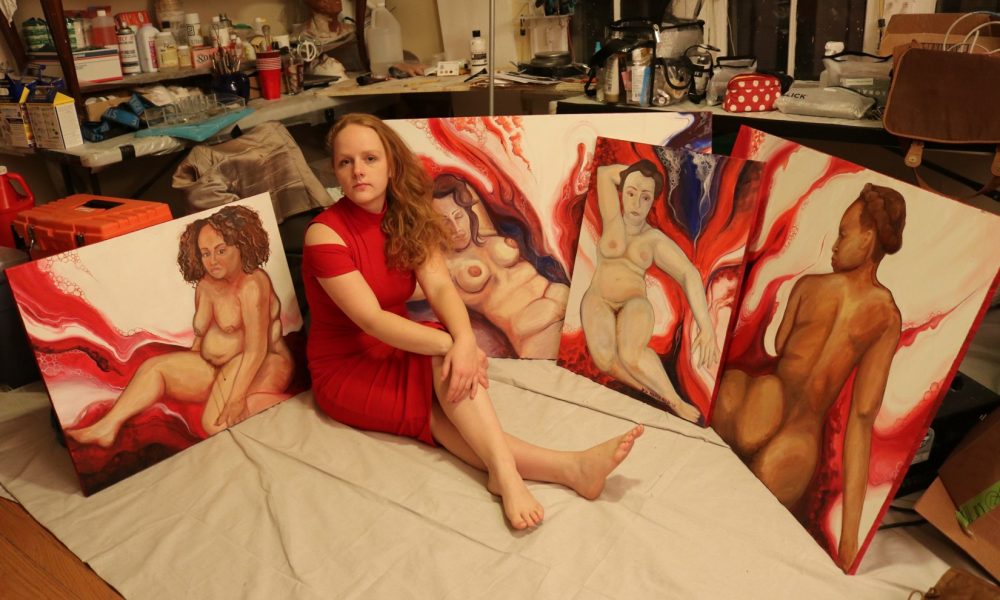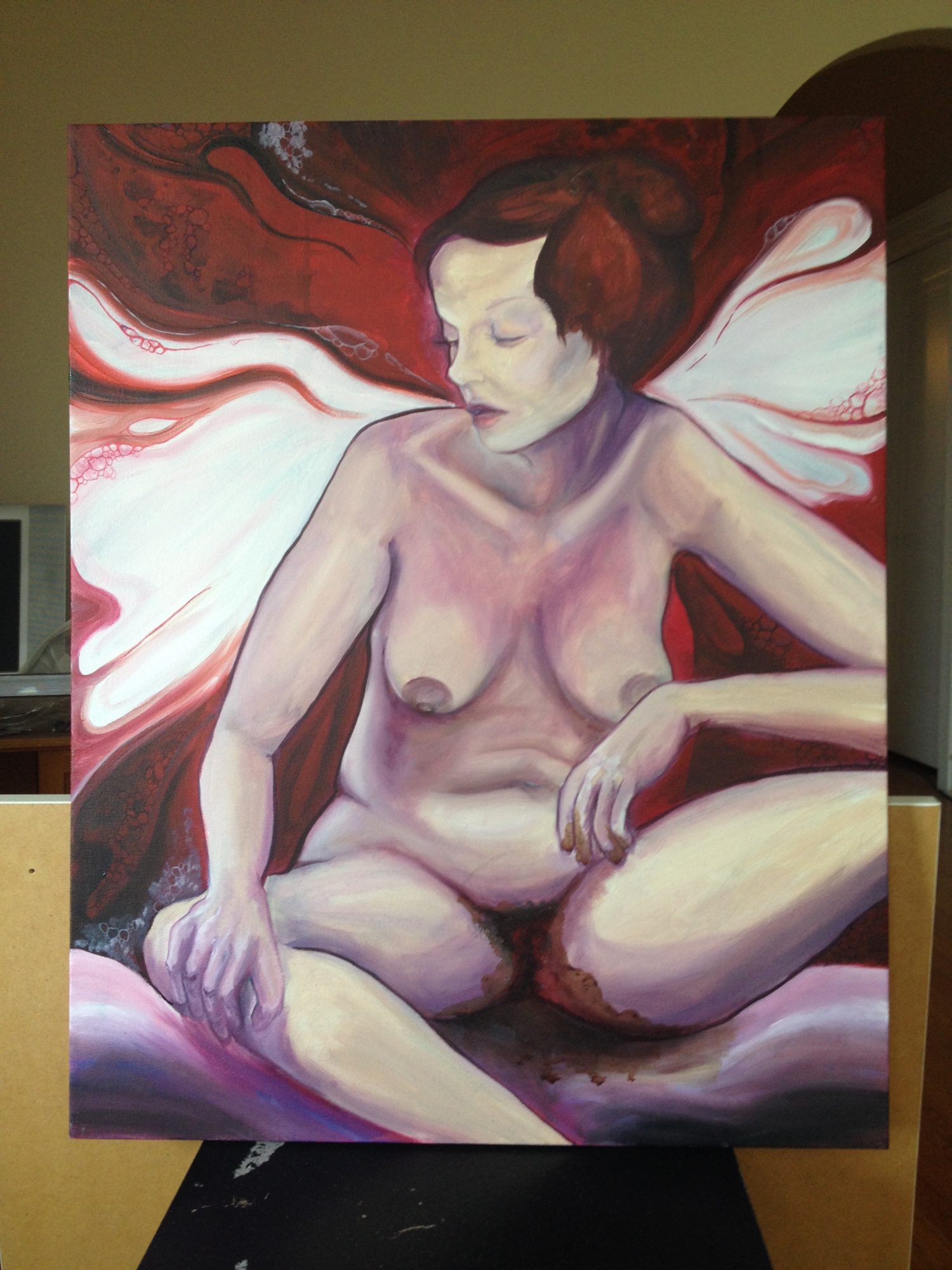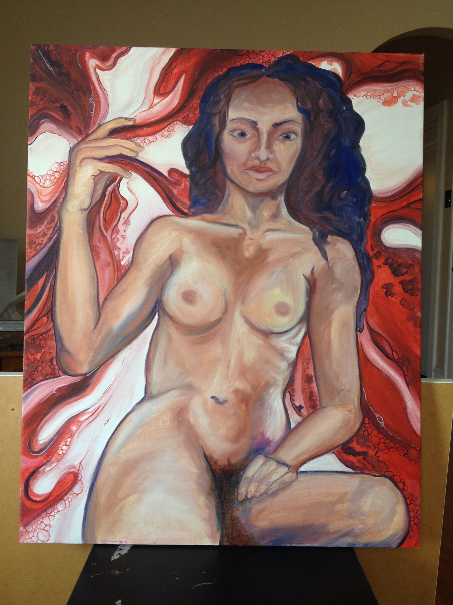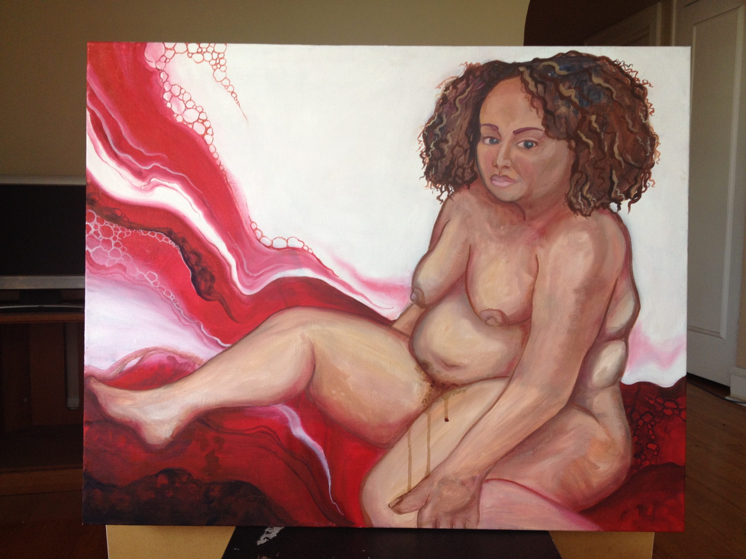 My most recent series of paintings, for example, featured seven woman and non-binary, vagina-having people who were each openly menstruating. I used real menstrual blood (my own blood, collected in a diva cup every month) to adorn the paintings, and wanted to explore both the beauty and the undeniable nastiness of using real human blood in visual art.