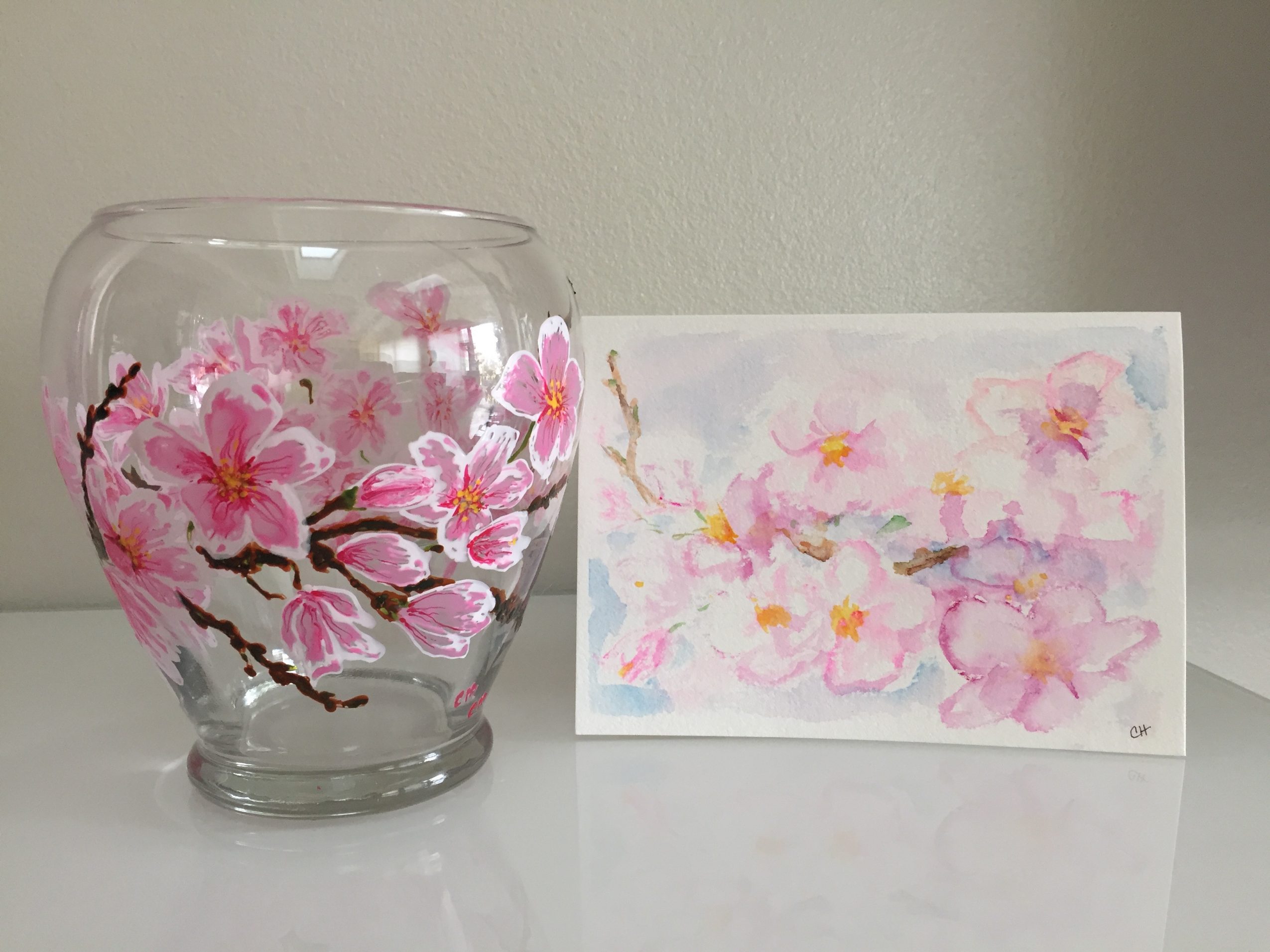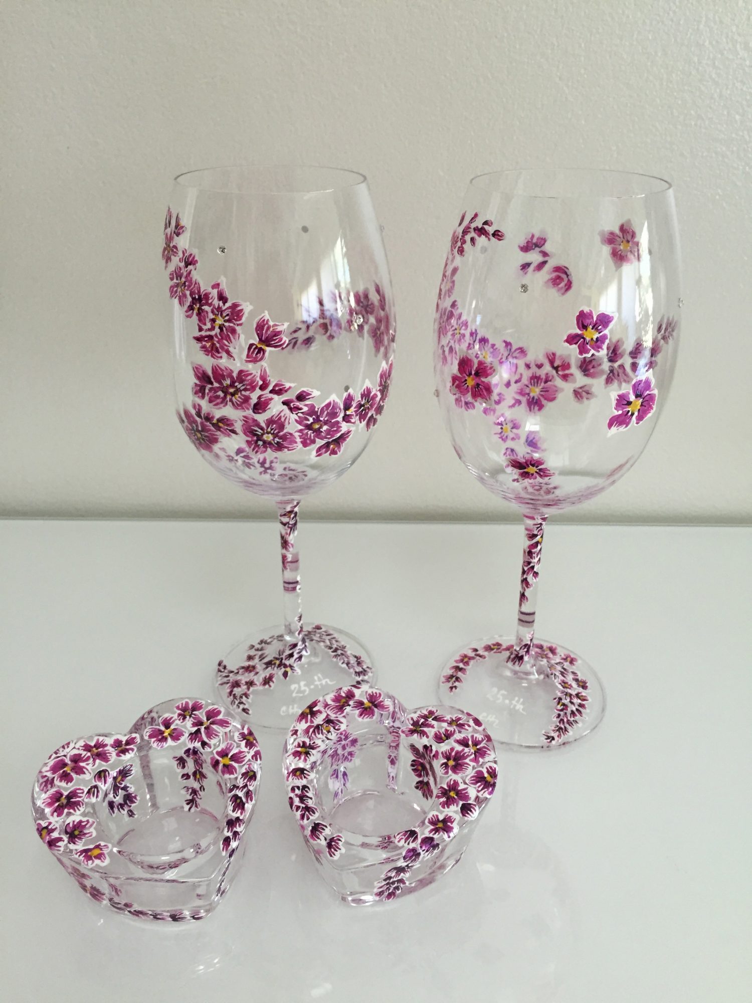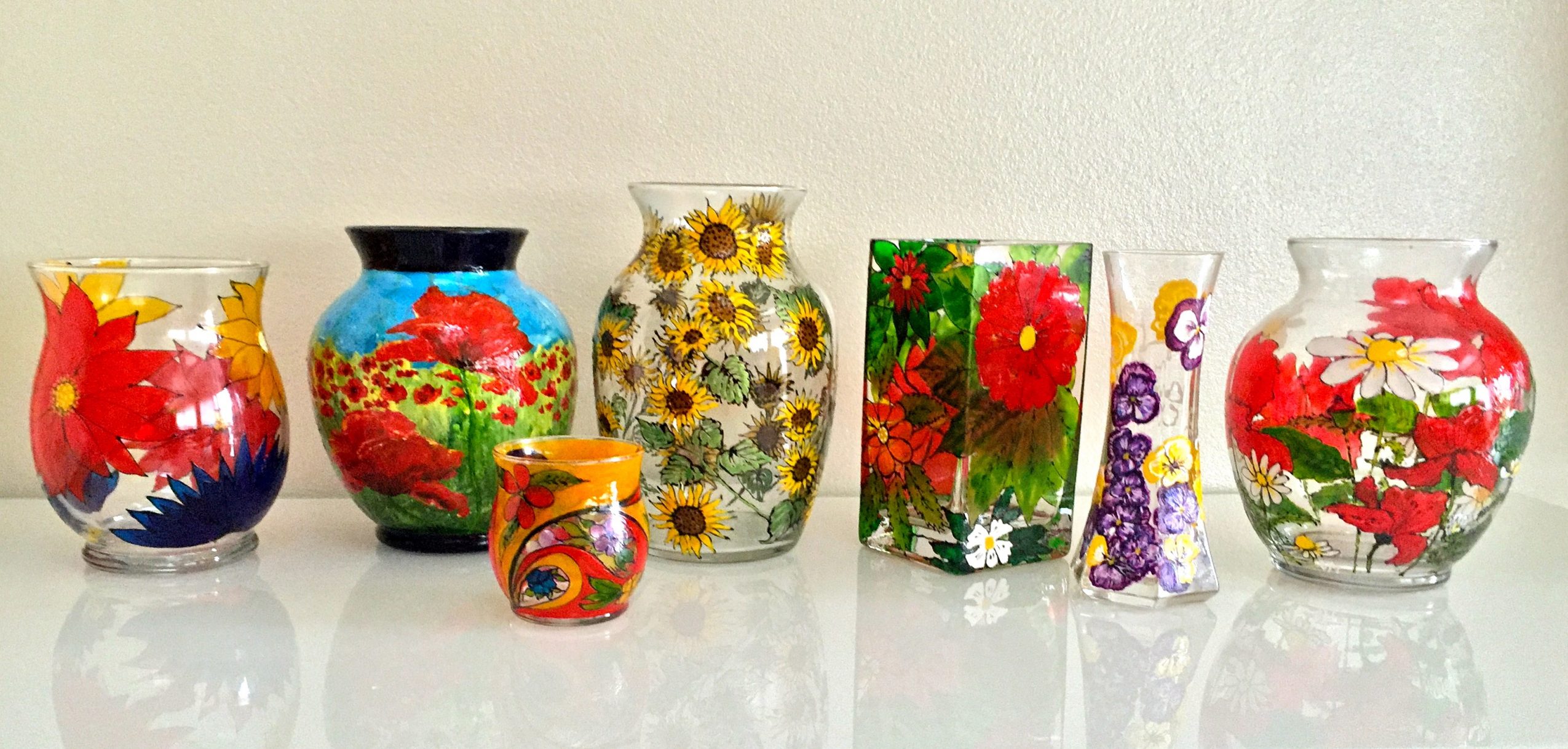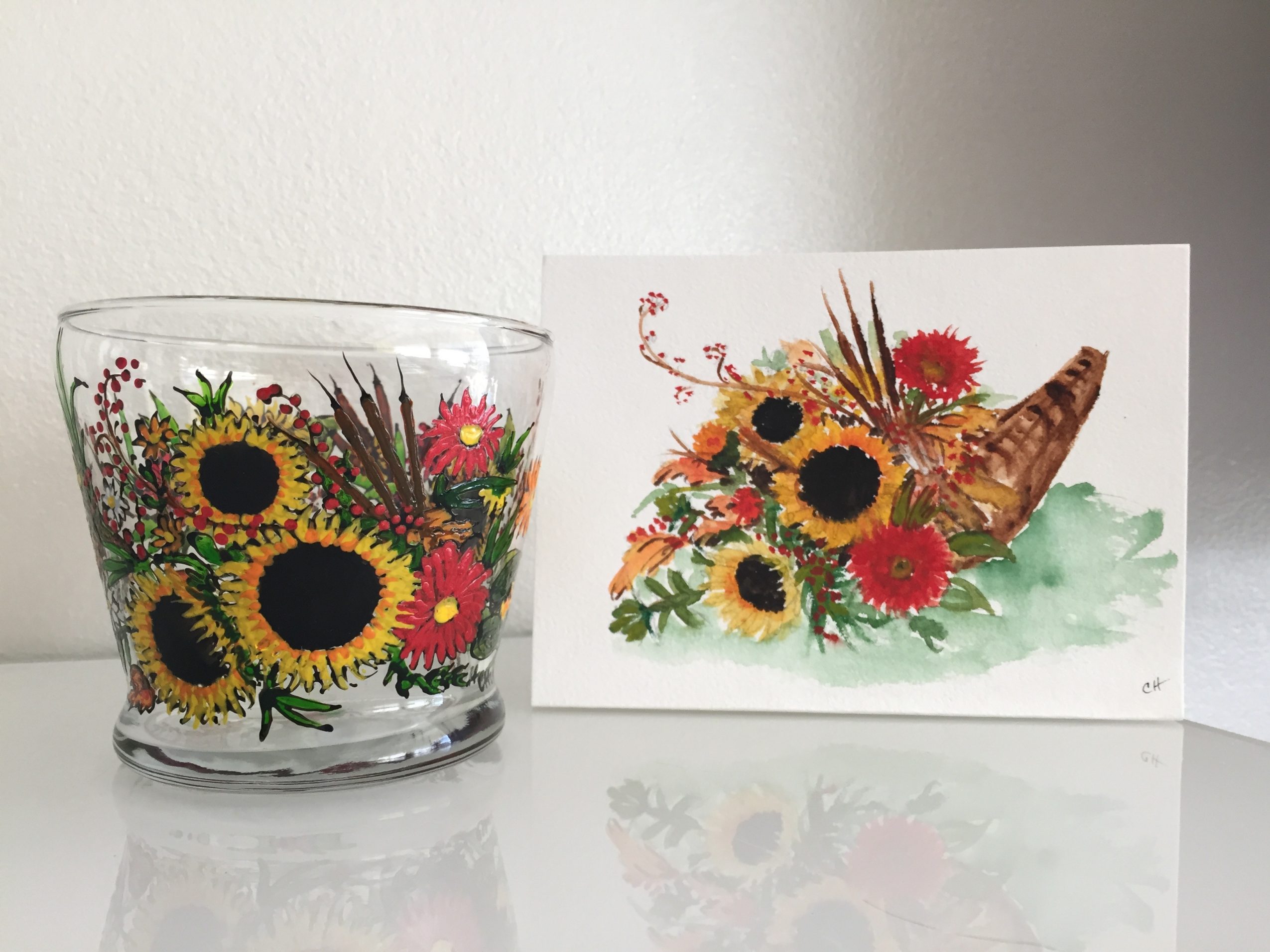 Most of my work is done on glass. I paint on wine glasses, coffee mugs, candle holders, vases, anything smaller in size that can be affordable and make a great gift for any occasion.