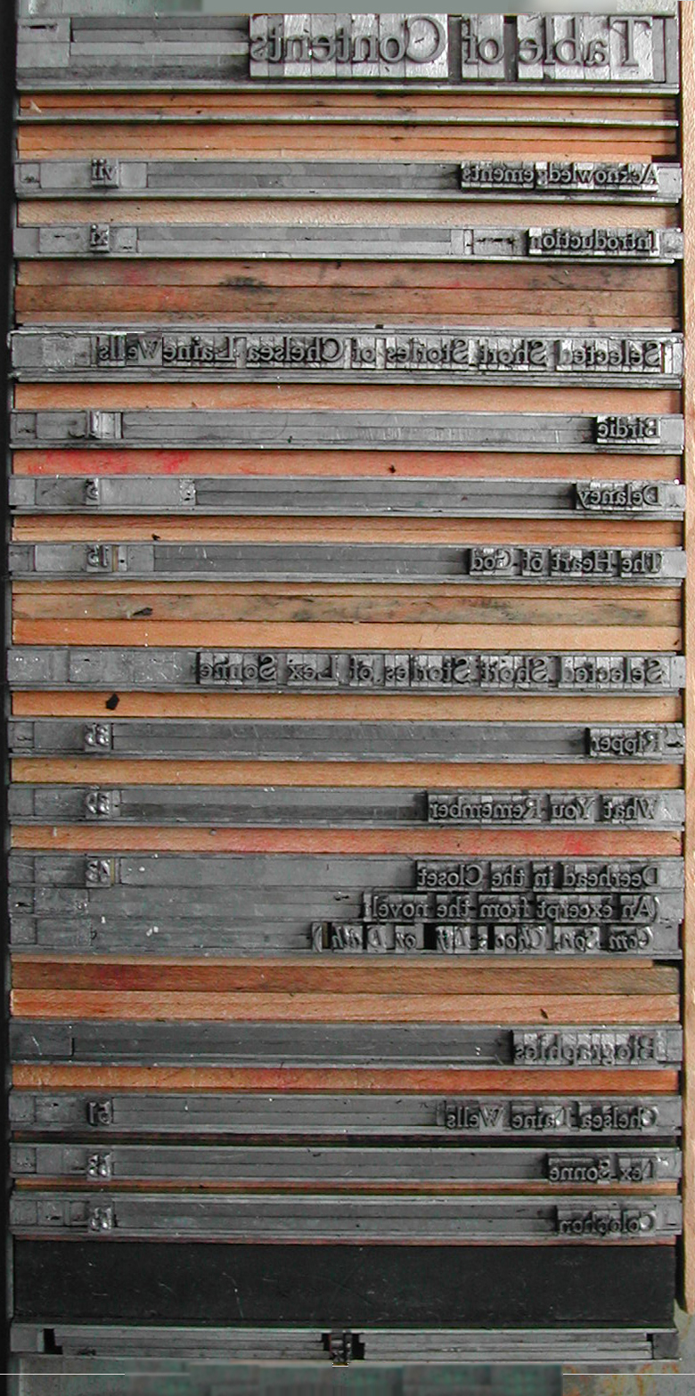 At Lark Sparrow Press Jobson designs, illustrates, sets type by hand, letterpress prints and hand binds limited edition books. Hand work is a large part of what he does, but a computer and five or six programs is an essential part of his design work. He recognizes Book Arts are primarily a celebration of very imaginative structures. The kind of work he does at Lark Sparrow Press includes those efforts plus the inclusion of significant amount of text. In the last two books he printed, one is a 72-page book of six illustrated short stories by Chelsea Laine Wells and Lex Sonne. The text composition alone had over 120,000 movable pieces of typography. The second book he published was a 24-page, illustrated short story by Megan Stielstra. It had approximately 16,000 pieces of movable print. The explanation for his use of hand set type is “it makes each page a testimony of excellence for the writer’s work and each page becomes an indescribable work of art. You can see AND feel each paragraph.”