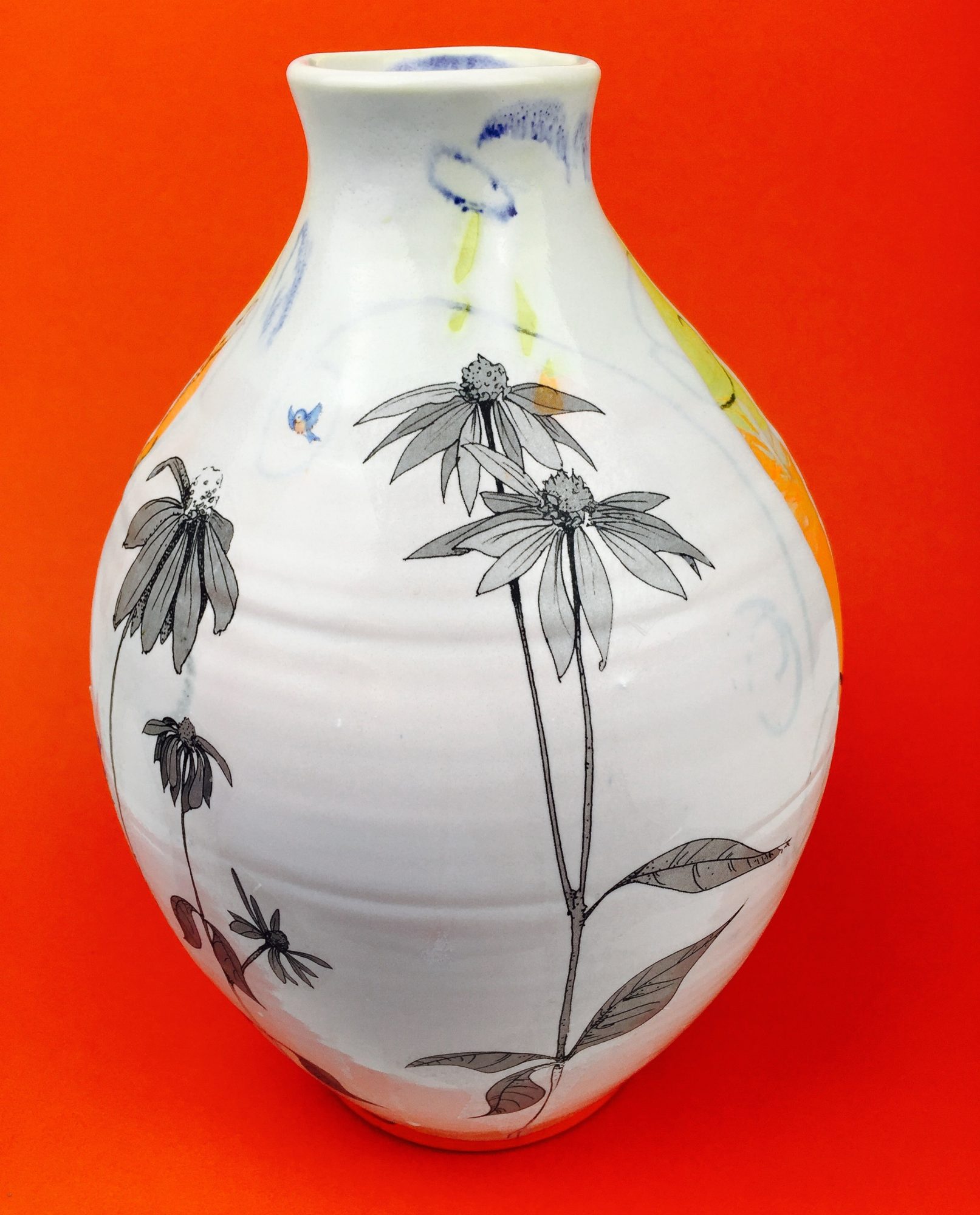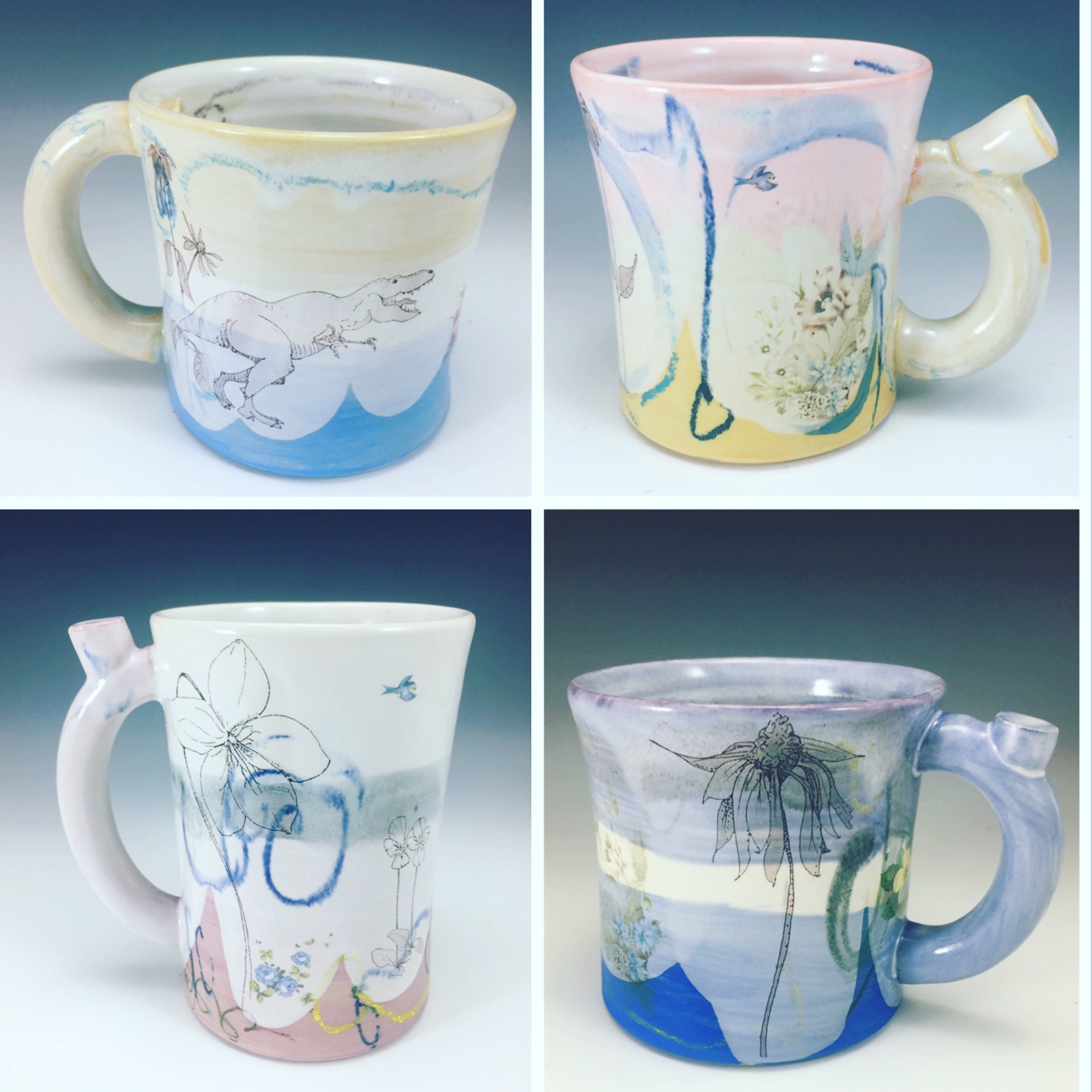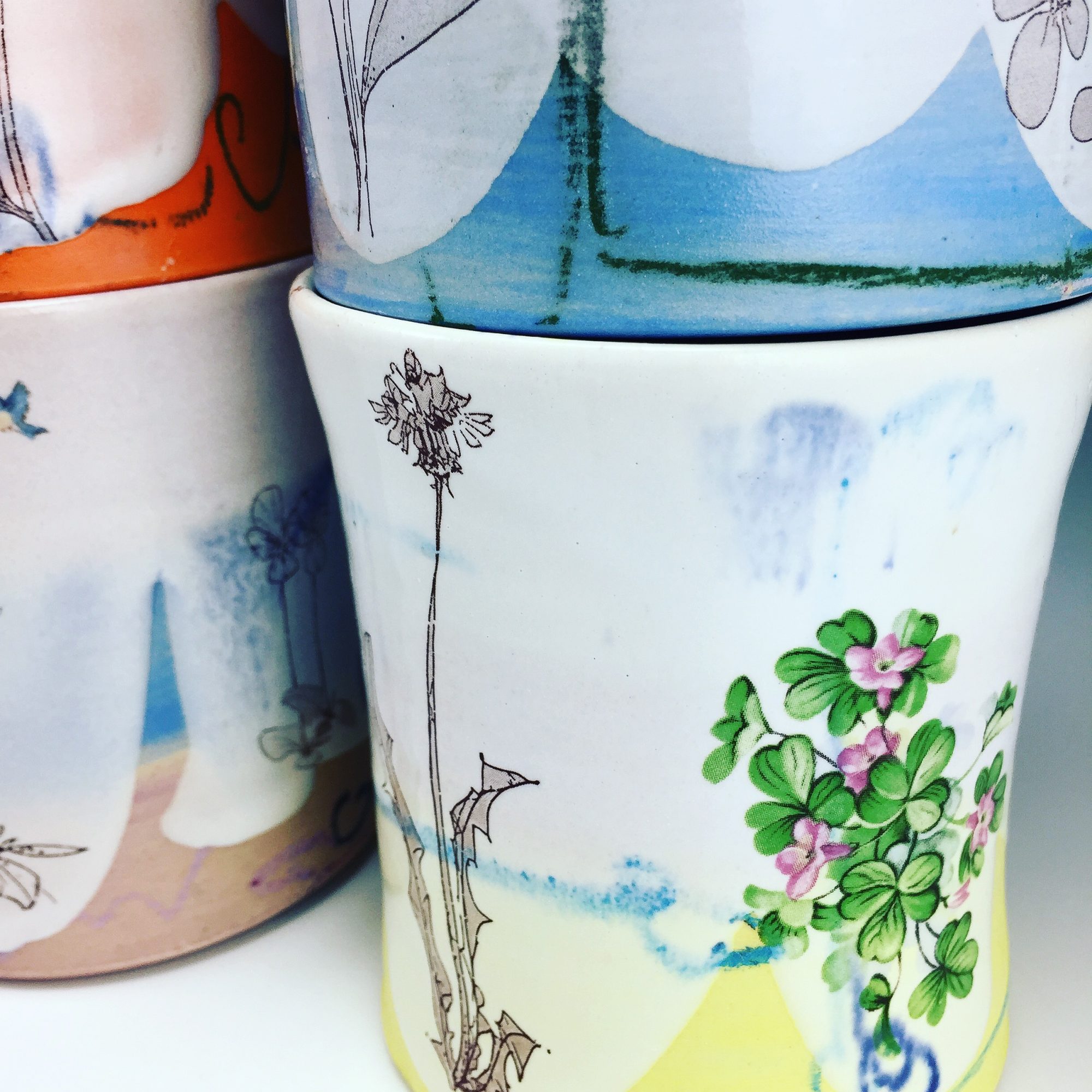My most recent work has been described as “whimsical,” and I really like the feeling that invokes. I’ve always admired artists and writers like Tim Burton and Shel Silverstein- people who make everyday things seems extraordinary. I have been really inspired by flowers, so most of my current drawings are flowers. I like to combine my own drawings with decals I purchase and collage them onto simple forms that hopefully transform the way a mug can feel in your hand, or a vase can look on a shelf.