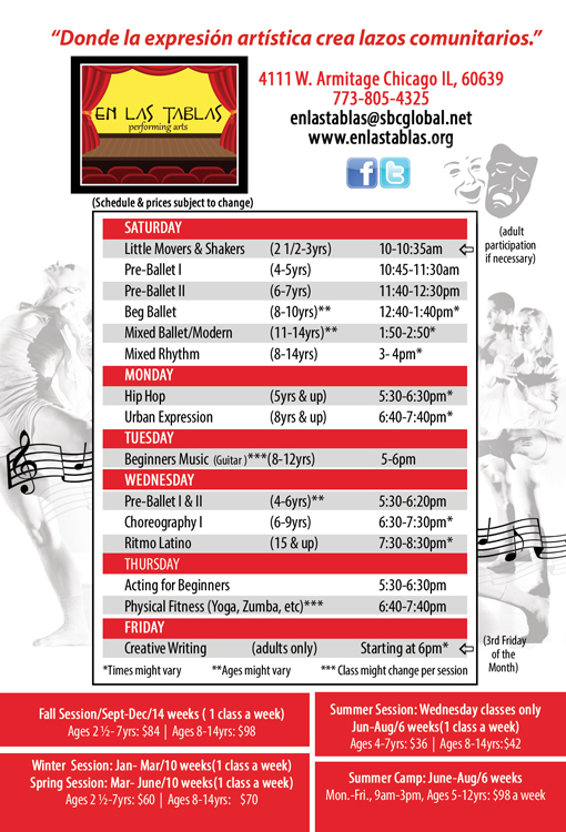 En Las Tablas Performing Arts was born 11 years ago out of a need to establish a bilingual/bi-cultural performing arts program in an under-resourced, but highly creative and resilient community. Our co-founders, Maritza Nazario and Dr. Milka Ramirez, both performing artists and former Chicago Public Schools professionals, made many personal sacrifices to secure a space in the Hermosa Area in Chicago to start the challenging process of creating a new community arts organization. During our first year in 2006, we welcomed approximately 30 students to 3 dance classes a week. Today we offer 12-15 performing arts classes a week and our enrollment fluctuates between 200-230 students a year. Our low cost tuition remains the same, thanks to our program’s families and committed donors. The mission Of En Las Tablas continues to stand strong, by providing a safe, open and affirming space where participants can explore their own artistic expression. Our mission has strengthen throughout the years, confirming that the arts is an important aspect in people’s lives.