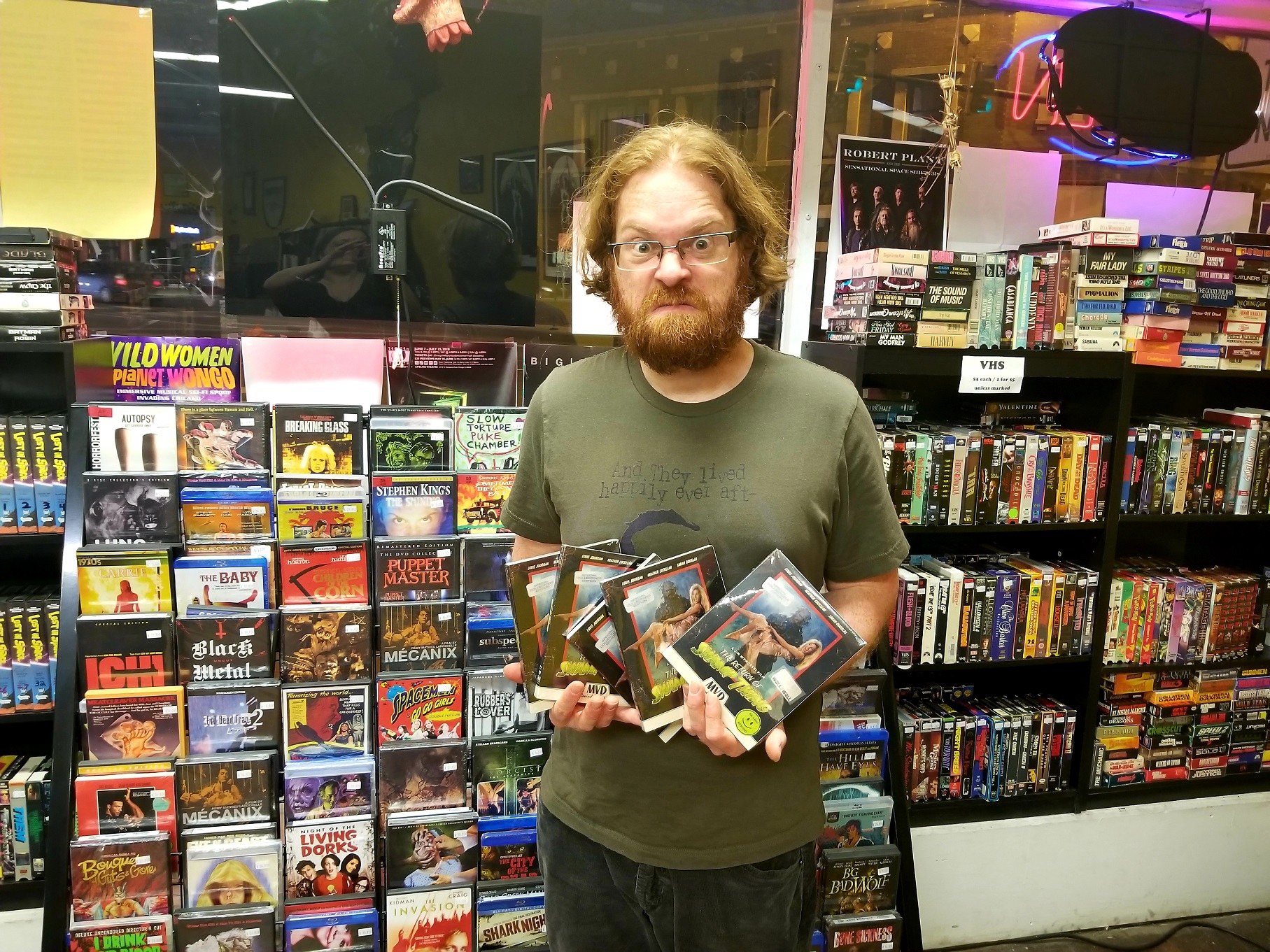 We just celebrated Bucket O’Blood’s 8th year in business! The store began as a tiny storefront in Logan Square, founded by Marc of Johanne’s Face Records and we took over in 2013 when Marc decided to focus on touring with his band. When the existing lease was up, we decided to expand and relocated to our current shop in Avondale, where we immediately settled into the neighborhood. We’ve always focused on genre fiction and loud music but the move allowed us to really embrace all the things we love and want to share with others. We have filled the space with new and used items – everything from classic sci-fi, brand new graphic novels, horror movies, underground metal cassettes, classic rock LPs, local punk albums, heavy metal vinyl, band t-shirts, just all sorts of stuff that makes us happy. And we put a lot of energy into fostering our unique community with book clubs, movie screenings, listening parties, and guest lectures.