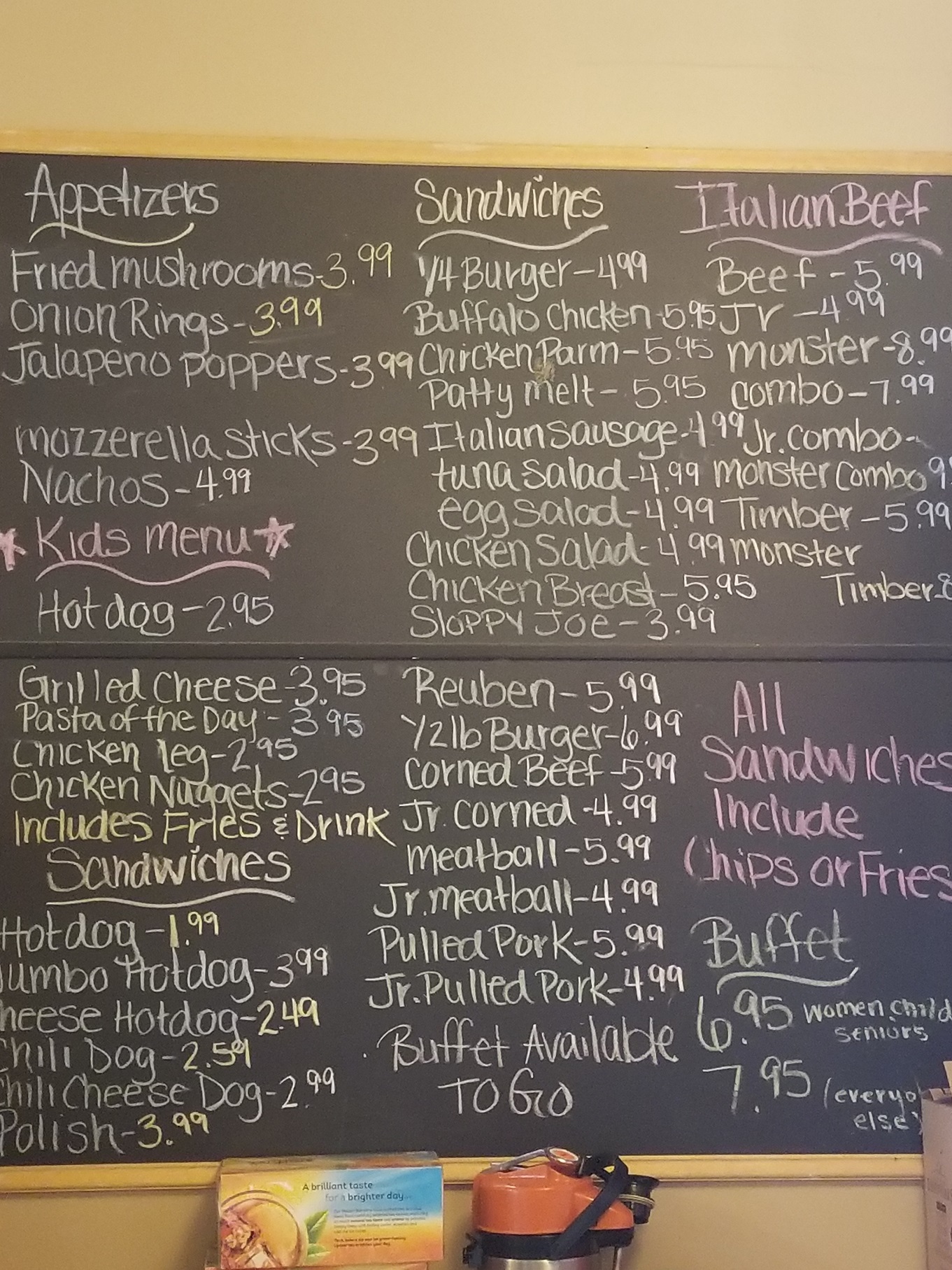 - Italian beef $5.99 (includes fries or homemade kettle chips)