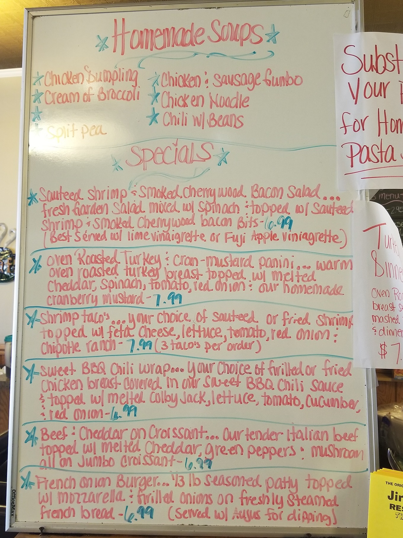 - Small homemade soup $2.99 Large homemade soup $3.49