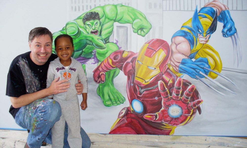 I started my artist career by doing all kinds of normal jobs, waitering, driving limos, and being a cartographer in the Marines, but on off hours, I drew and painted whatever anyone wanted. I squeezed in a couple years at the American Academy of Art, while still working various jobs, and doing freelance art projects. Then 23 years ago, I became a father, and did what any artist father would do for their beautiful newborn baby daughter, I painted the best mural ever in her nursery! That was just the beginning of the journey, and since then we’ve been going strong, and are as determined as ever to bring happiness everywhere we can, through the use of our murals.