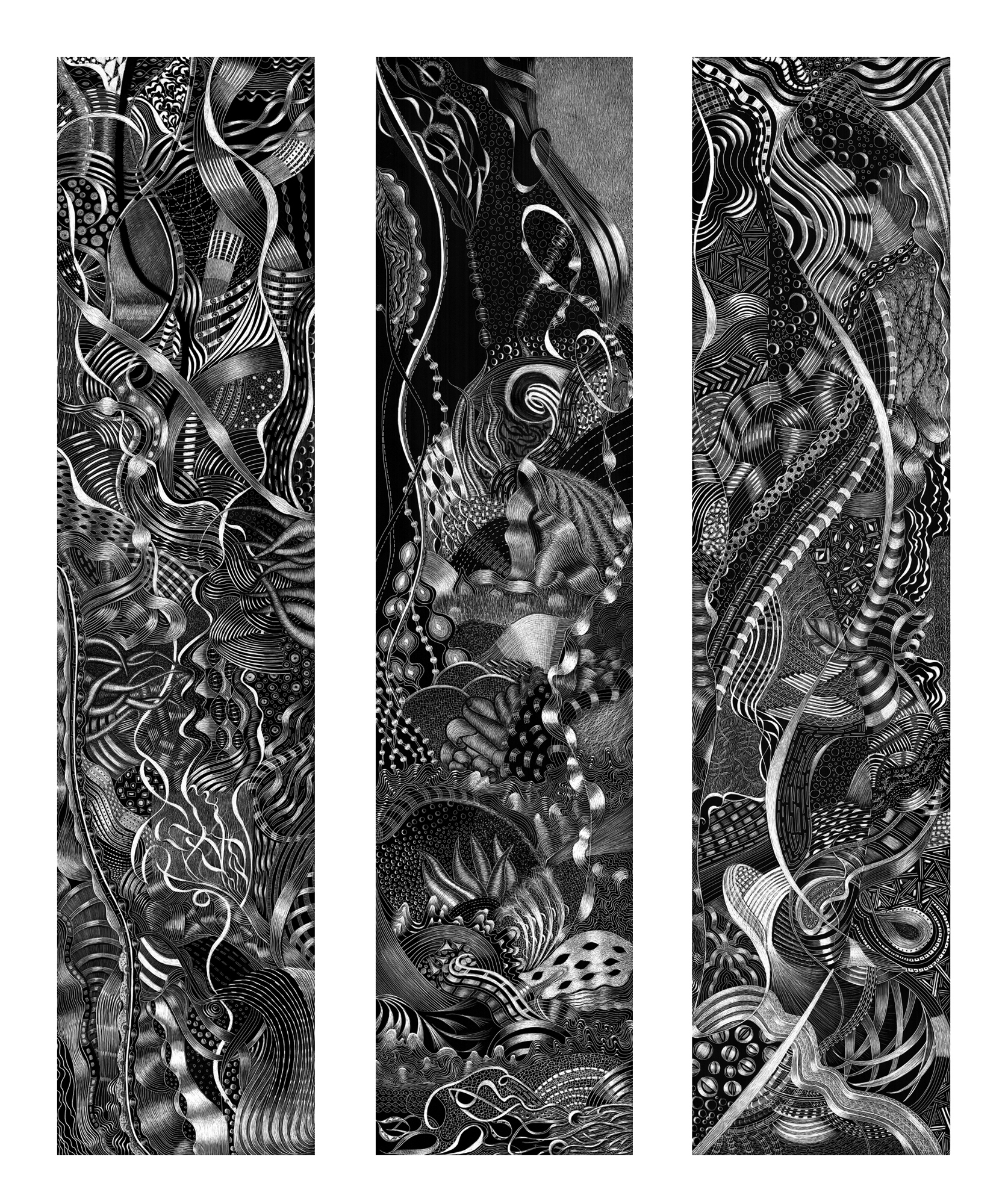 Owning a design firm for years gave me the tools to approach my art career with the same sense of purpose. I discovered my favorite medium, Scratchboards, (by Ampersand Art Supply), while undergoing a cancer diagnosis in 2006. They were portable and all I needed was an X-ACTO knife to draw with. Getting lost in the details transported me to a better place.