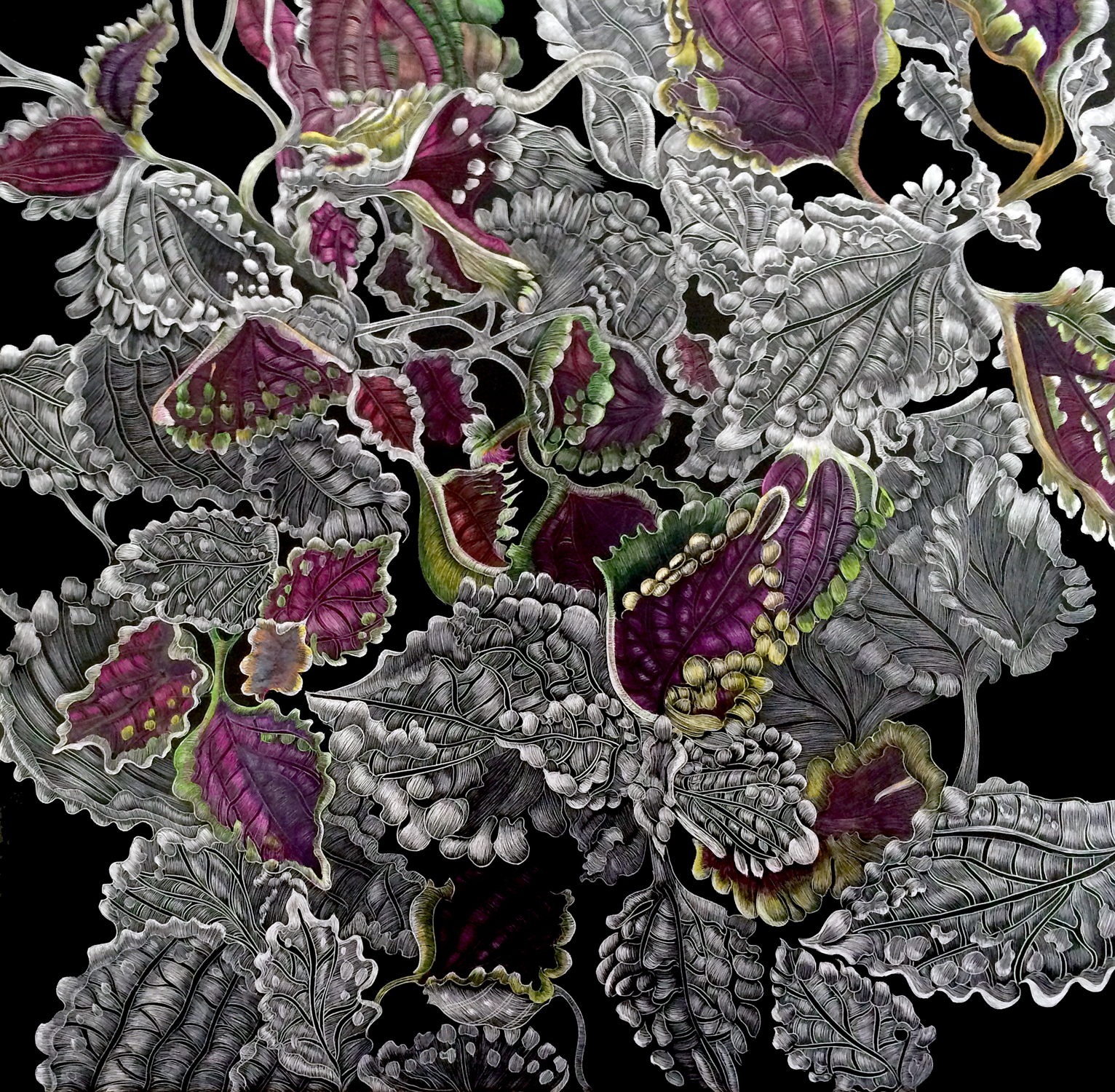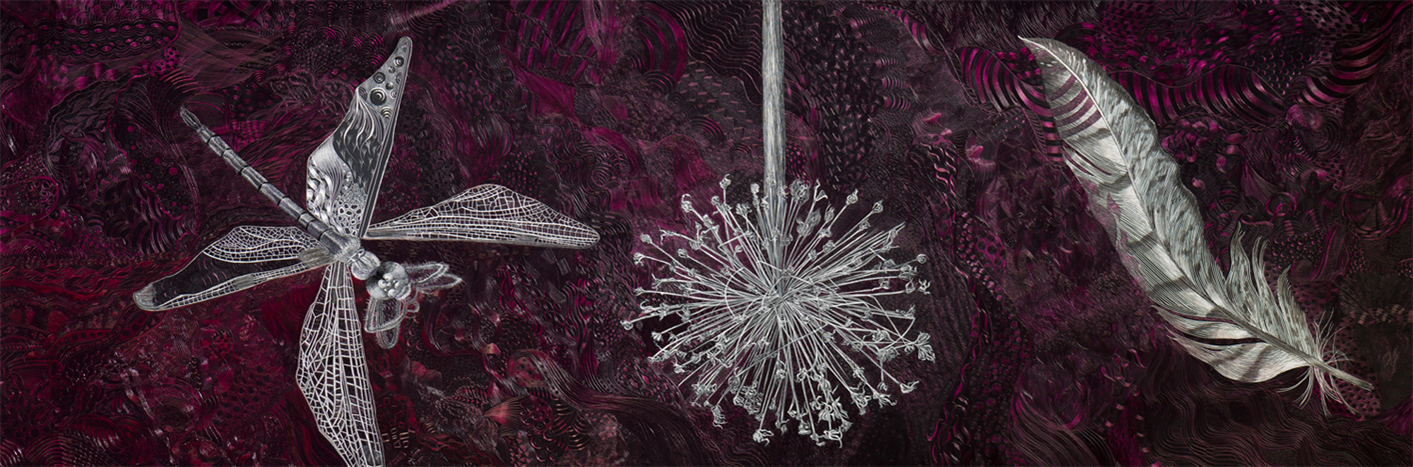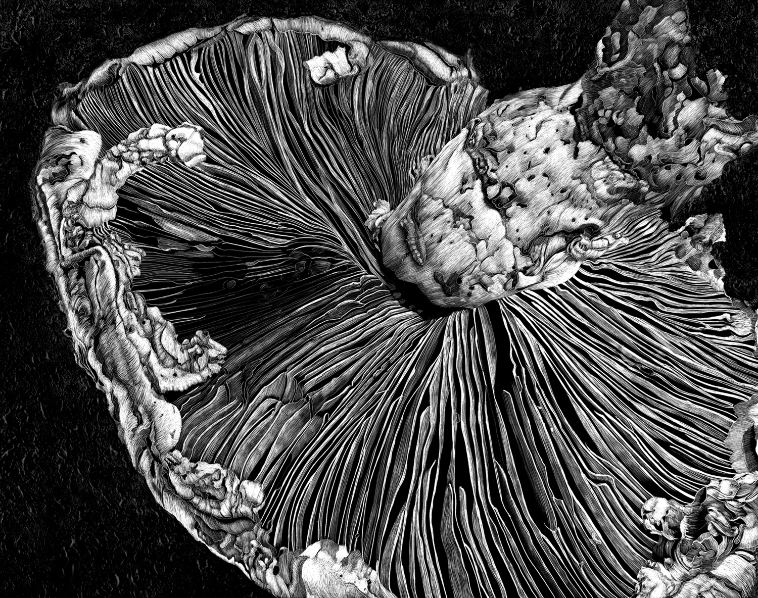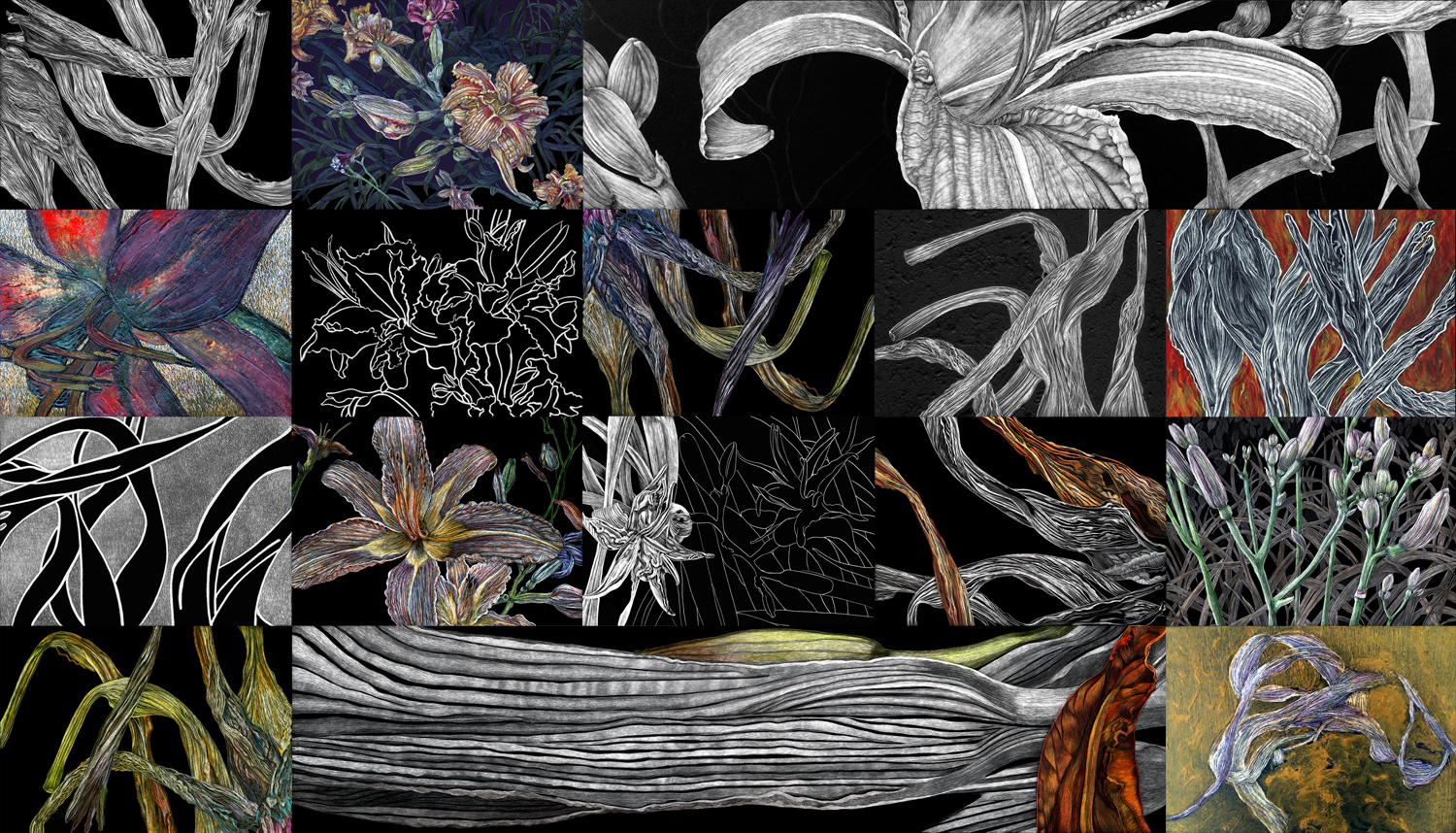 Charles is certainly a master, and there are a few others who have earned recognition using this medium. My approach is different than most, I use this untraditional support to microscopically examine nature and abstracts for their aesthetic value. I do not sketch first nor erase, enjoying the spontaneous energy that emanates from the boards. My hyper-detailed renderings evolve into exquisitely meticulous visions inviting the viewer to dig deeper into my art.