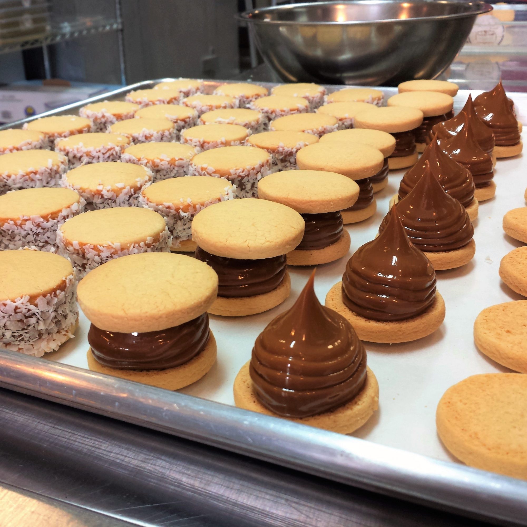 In addition to making these by hand ourselves, what may set us apart from other pastries and cookies is that, after much trial and error, we have found the right ratio and balance of flavors and texture. The flavor and textural profile of the crumbly cookie, the covering and the creamy filling all come together in perfect harmony. The fact that they are all filled with the generous layer of creamy dulce de leche caramel doesn’t hurt either!
