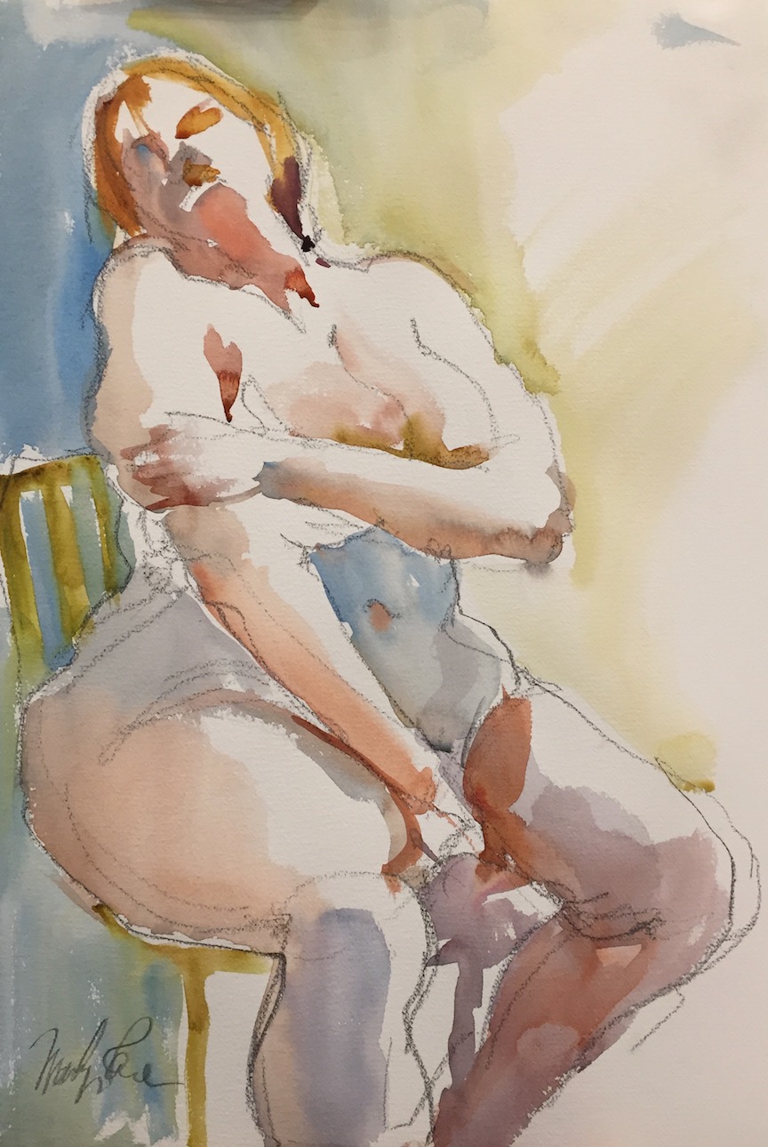 Along the way, however, I once again felt the pull of the fine arts world, and this time realized that I had a passion for it which I could no longer surpress. My college work had been very large, abstract landscapes in oil for which there was no room in my life. In college, in the 70s, figurative work was looked down upon once we learned the fundamentals… and we had absolutely no training in watercolors which were looked down on as “hobby art,” so I was quite surprised when I fell in love with the medium after taking a watercolor class with a friend to humor her.
