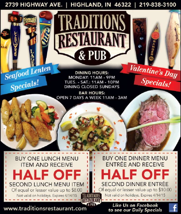 - Facebook: https://www.facebook.com/TraditionsRestaurantandPub/