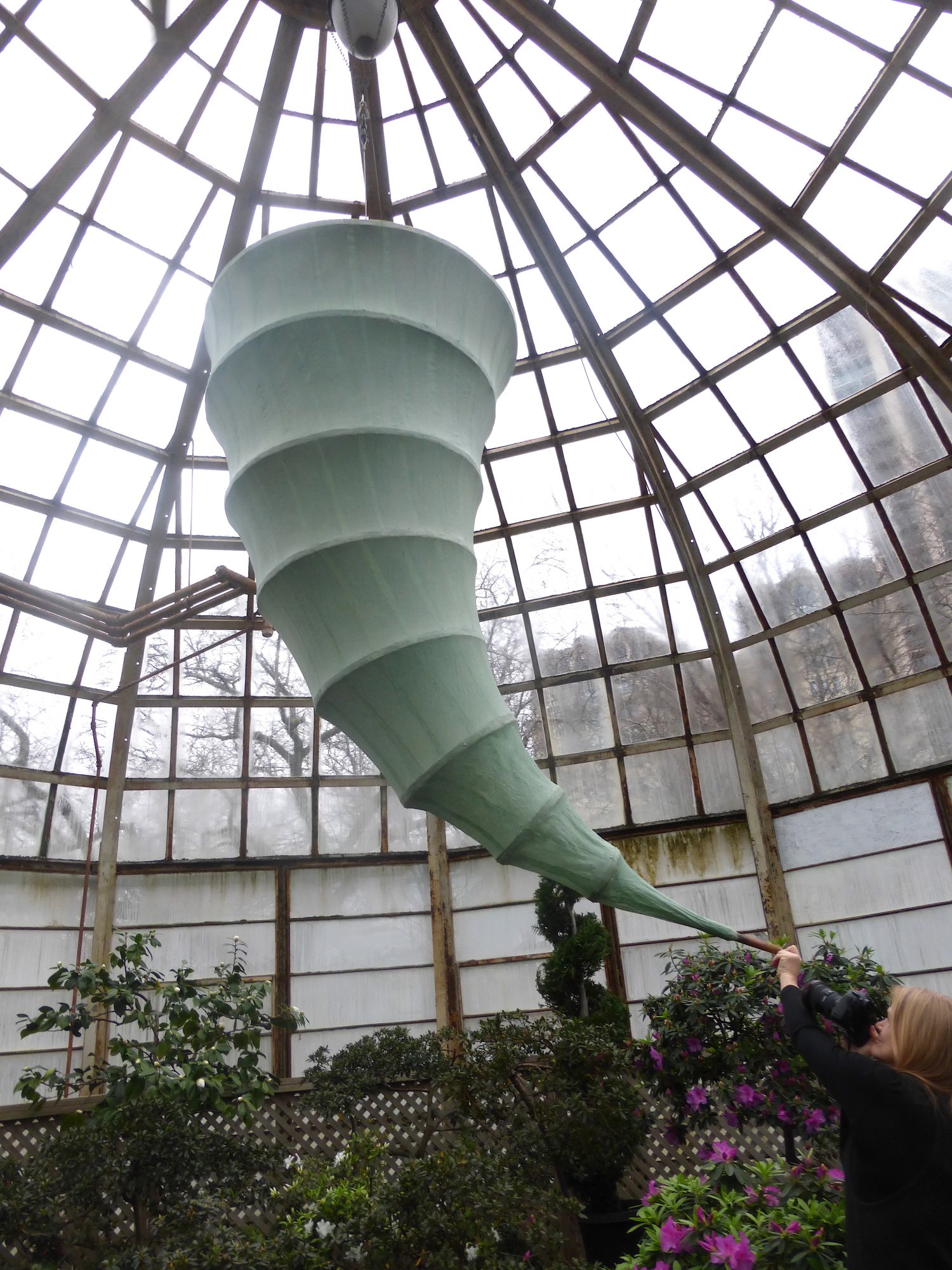 While still a student, the school hosted a kite-flying contest with the prize being a case of beer. Determined to win I build a large 6′ in diameter kite that I was certain would assure me success. Sadly the day of the competition dawned still and windless and my kite never left the ground, but I realized that I enjoyed making kites. I soon had a show of them in the lobby of the Goodman Theatre and then I was commissioned to create a 100′ segmented kite from hang in the atrium of The Marshall Field’s store on State Street and a career was born.