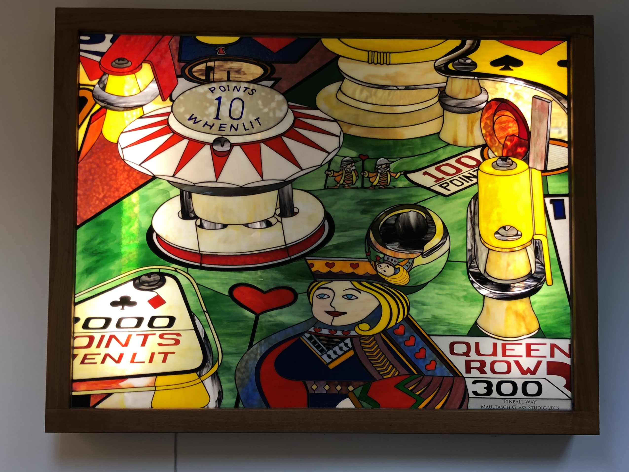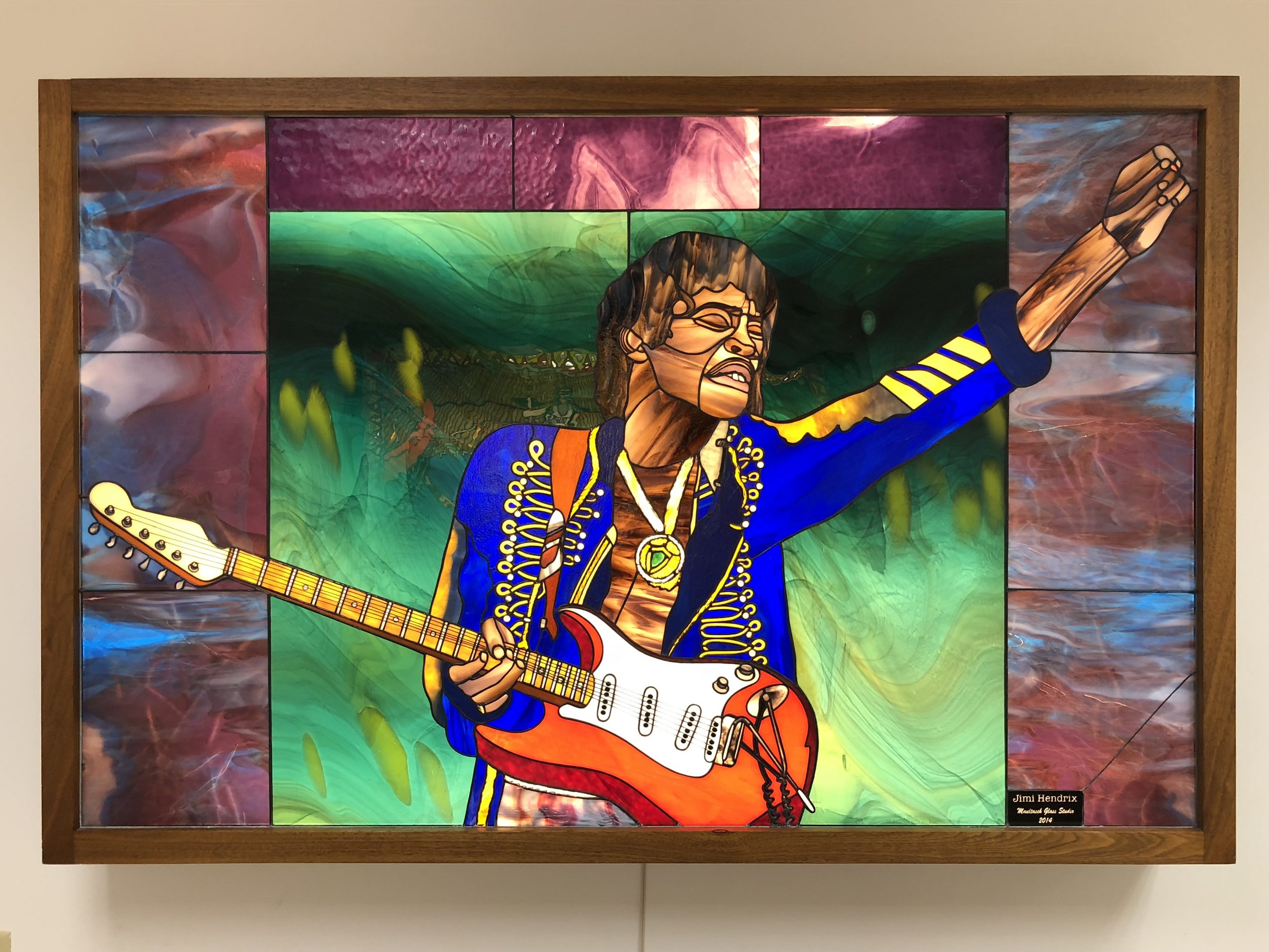 It is an extremely labor-intensive process in which I use only handmade glass and no paint. Most of my panels include people who are heroic in some way to me or places, things and people I am fond of (such as pinball machines). I am proud that I am one of a handful of glass artists who is profiled on the Uroboros website, a company which is considered one of the finest glass creators in the world. There are almost no other artists working in glass today that create panels using only glass without paint or ground glass know as frit.