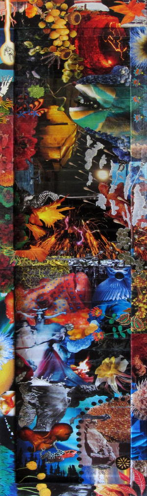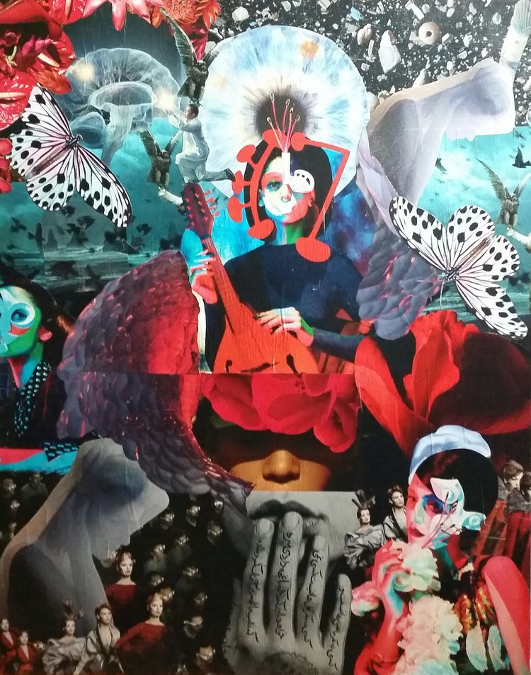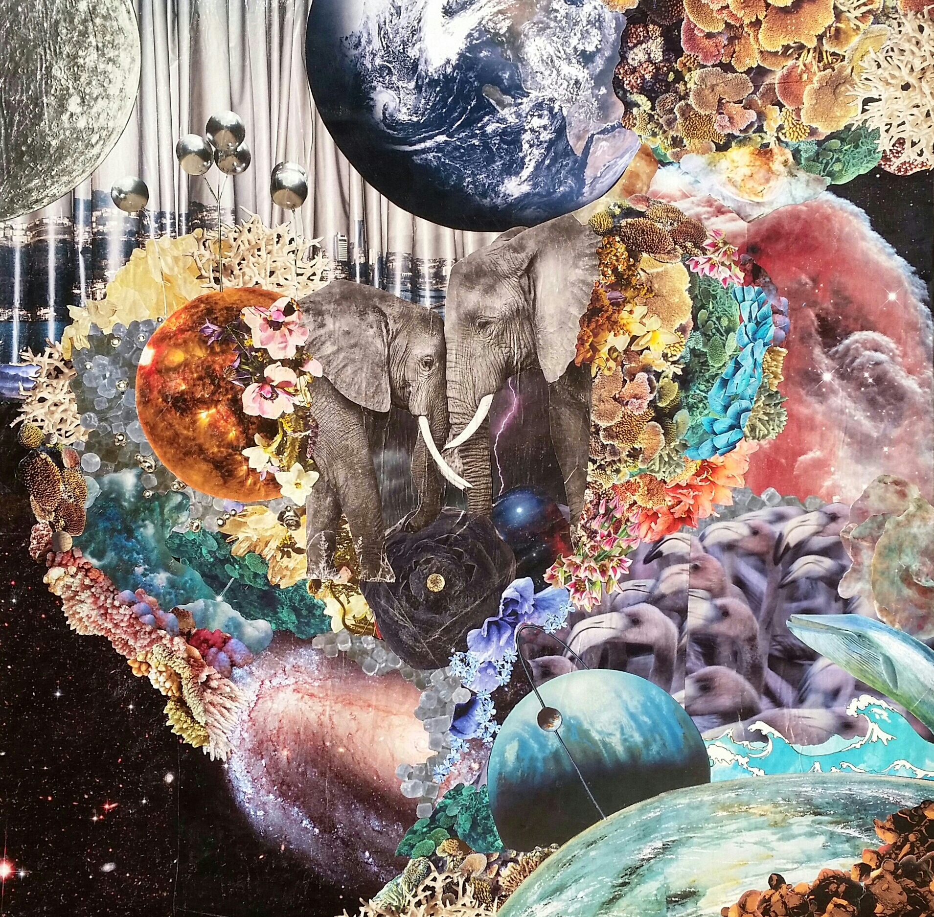 As an artist, I have always loved surrealism. I was greatly influenced by Dali as a child. Since then, I try to create unique, dreamlike pieces of collage art. I am proud of where I am today as an artist. I feel I have developed my own style of collage, which to me, is about blending hundreds of clippings into one uniform piece. My style is focused on the content of the material I choose to use and how they make me feel. It is also about color and trying to create movement while also being balanced. And the best part is that my work has become recognizable to some people. It really makes me happy when someone comes up to me at a festival and tells me where they have seen my work before.