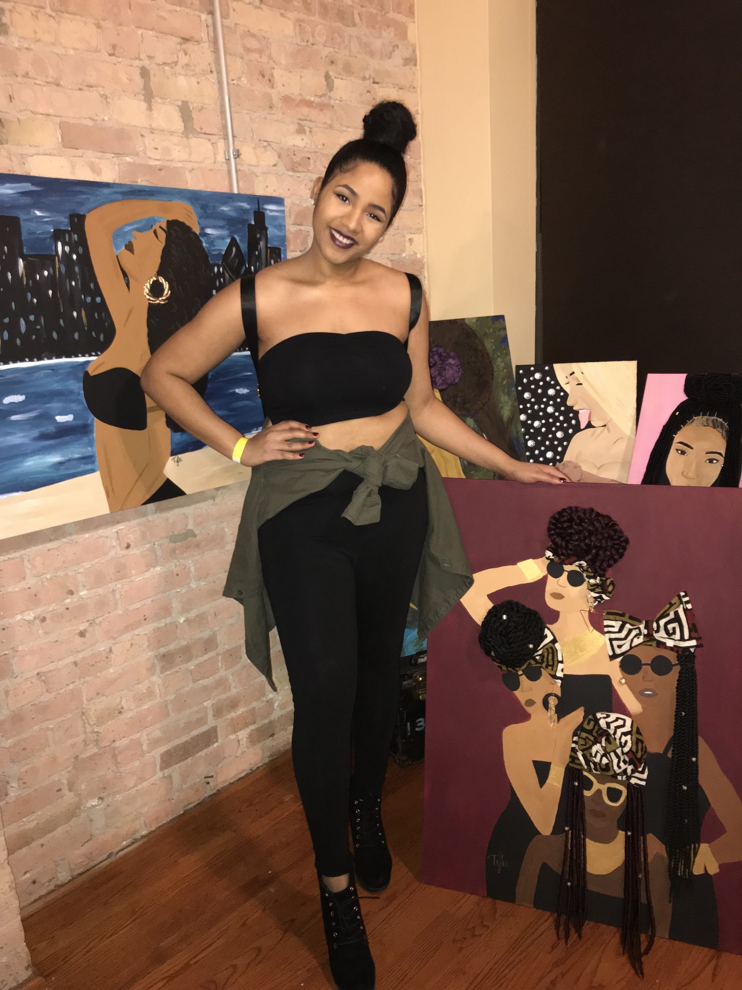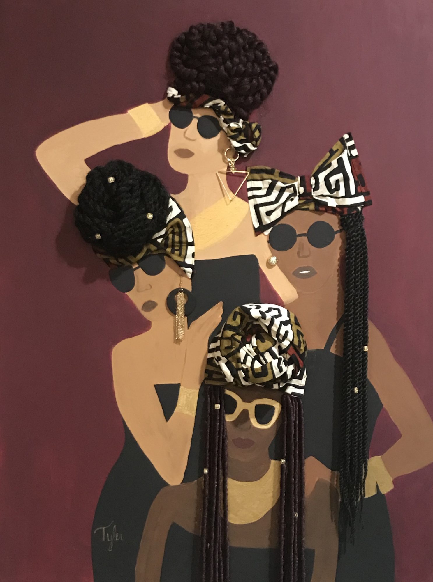 I always loved art, but as I progressed through my STEM education, there seemed to be little room to paint. I went to Spelman College and Georgia Institute of Technology and studied Math and Mechanical Engineering. Once I got to Georgia Tech, I realized painting was therapeutic for me, it really helped me get through the rigorous engineering program. When anyone saw my art they wanted it, this encouraged me to pour more into it when I graduated. I moved back to Chicago for work and created the Inspire by Tyler business. Many of my pieces involve multidimensional elements such as hair, fabric, and jewelry. My goal is to inspire people to reach their goals and encourage self-love.