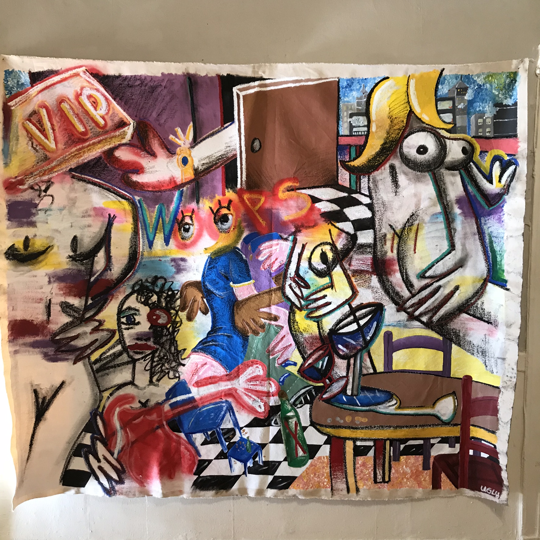 I started as this kid who moved to Chicago from Atlanta but born in Baltimore. Upon arrival I was put out of my dad’s crib and stumbled into my first group of friends at Fat Tiger Workshop, clothing store in Wicker Park at the time aka my family. Um from there I lived in the stores basement and worked an internship for the exact same store I lived in. In total spending about 1-2 years in the basement or bouncing from friend to friends’ couches, sleeping on trains, or just spending the night awake and exploring the city since there was no bed. Long story short at fat tiger I was given an opportunity to model a look book where I met Trashhand and from there the rest is pretty much a word a mouth thing, I became a model. Not a signed to an agency model but published, all over the internet and paid my bills model lol. I explained all of this because in order for people to understand me as an artist they have to know where my past and current is which is modeling. Art came around last year when I got my arm broken in somewhat of another personal long story. But when my arm broke I panicked. Like really freaked out. It made me think about the things I wanted to do and that I could be good at or just what would bring me peace for the rest of my life even if I were to be broke. So I began practicing bringing my doodles to life as paintings and copying other drawings but painting them to practice technique and just learn colors. Within a months’ time I prepared my first art show. Not only did I amaze myself it changed my whole life which has led me right here today. I model for Notre Shop.