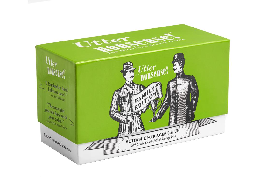 In the midst of all this, my sister Shannon became a part of the Utter Nonsense team as a partner to lead daily operations. We had already successfully created “Utter Nonsense: The Inappropriate Accent Game” (which was recently updated and rebranded as “Utter Nonsense: Naughty Edition”). But, we received feedback that while individuals loved the game, they wished they could play a version with children. From there, Shannon and I developed the Family Edition, which was released in June 2017. This version is sold exclusively at Target.