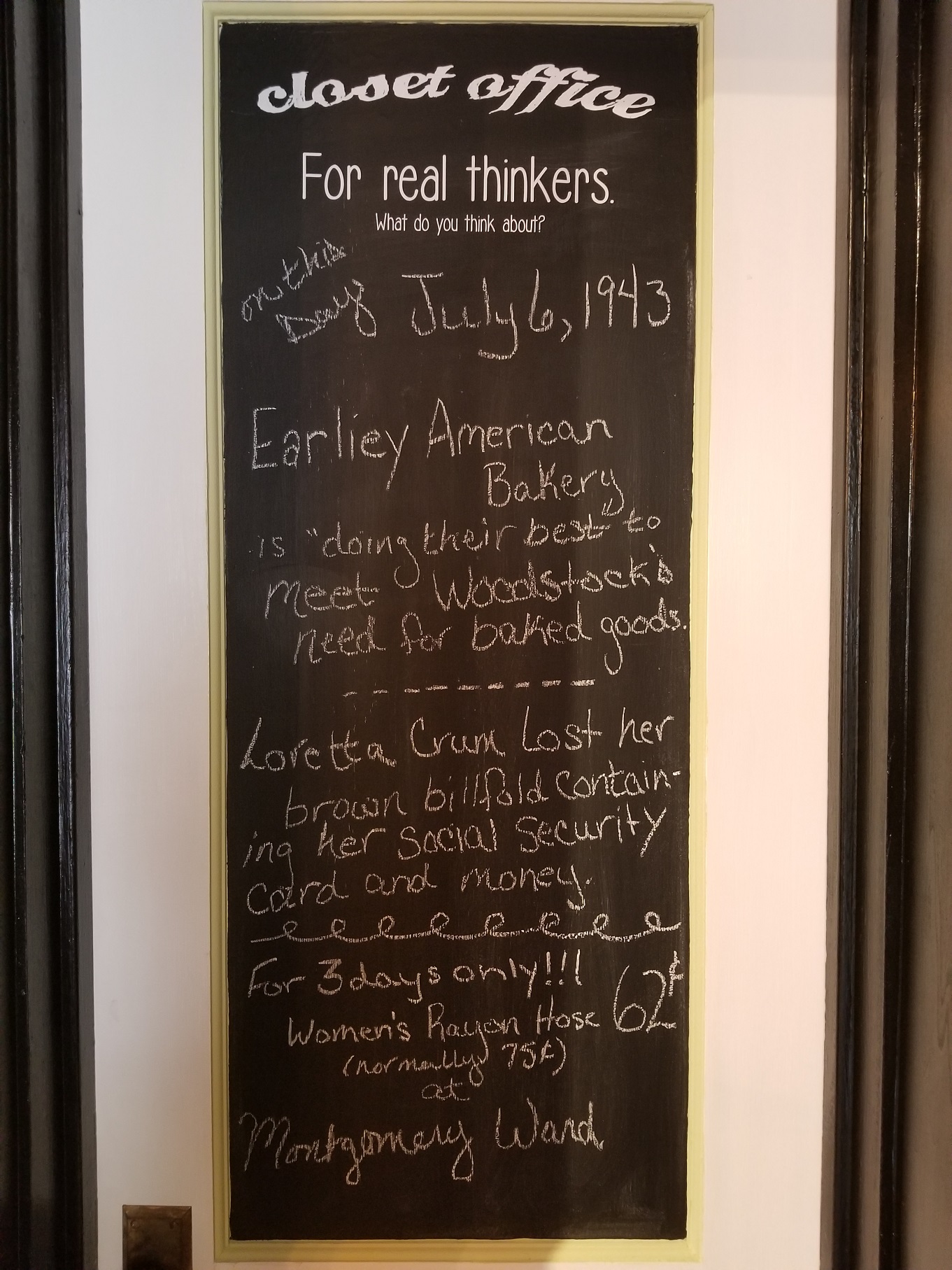 When I opened the doors to the wedgie, I was under the impression it had always been a barber shop. To my surprise, it was actually built to be a gift shop called The Weathervane – unique gifts for the person that has everything. According to an opening day article I found dated October 10, 1947, in the Woodstock Daily Sentinel, the store carried things like dainty towels, ornate glass animals on cocktail picks, and get this SOAP!