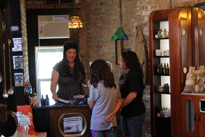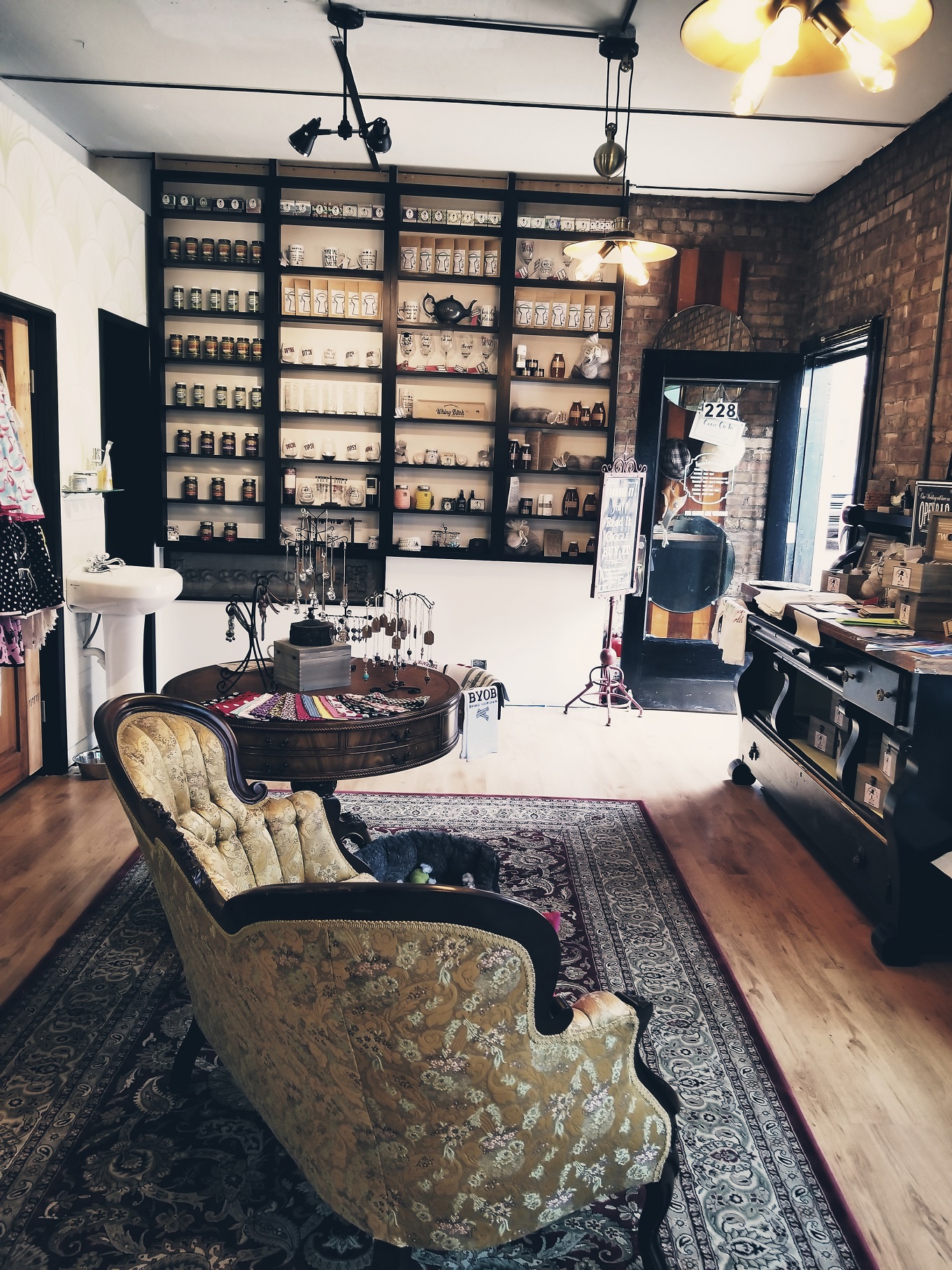 When you walk into space the first thing you’ll hear is music and radio shows from the 40’s. Louis Jordan, Bing Crosby, the Andrew Sisters, the Jack Benny Show, Amos & Andy gently rolling its way into your heart. You’ll probably see Ruthie sipping on a beverage behind her 1949 Admiral tv converted into a cash wrap. Apothecary shelves lined with at first glance appears to be normal everyday items until you really take a closer look and read everything. A settee just begging for you to have a seat. It’s warm and inviting. People love to linger and laugh!