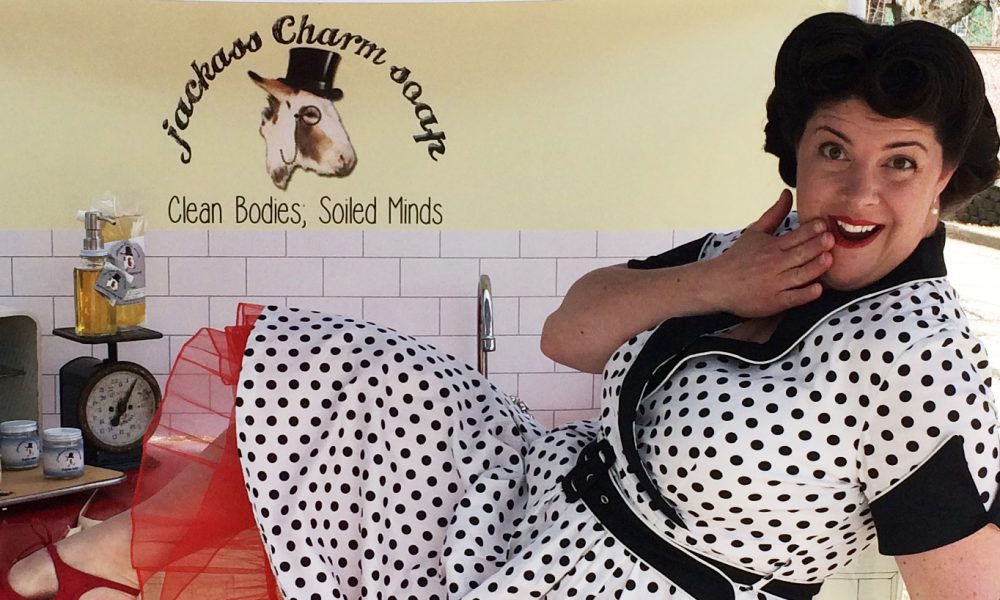 During the next 18 months, I hawked my inappropriate soap at local pop-up shops and craft shows. To do this I knew I needed a theme, so, I got dressed up as Ruthie Sudsalot – a 1940’s victory roll wearing, polka dot frock donning sassy sales gal and I sold the soap out of Ruthie’s kitchen (including a functional sink). I figured if I was to have such a raunchy product I needed to create a Venus flytrap to entice folks to step in and take a gander. I recognize the 40’s were very much imperfect and quite awful which made it a perfect representative for Jackass Charm Soap – sweet and innocent on the surface but once you look a little closer the dirty inappropriate truths revealed. My sorry sales results didn’t get me down as long as someone laughed at my labels. I started to pitch on a wholesale level with not a single bite. Breaking into the potty-mouthed market was not as easy as I thought! I was able to get into a store on consignment, which opened my eyes to how much of an inventory and record keeping pain in the ass it is.